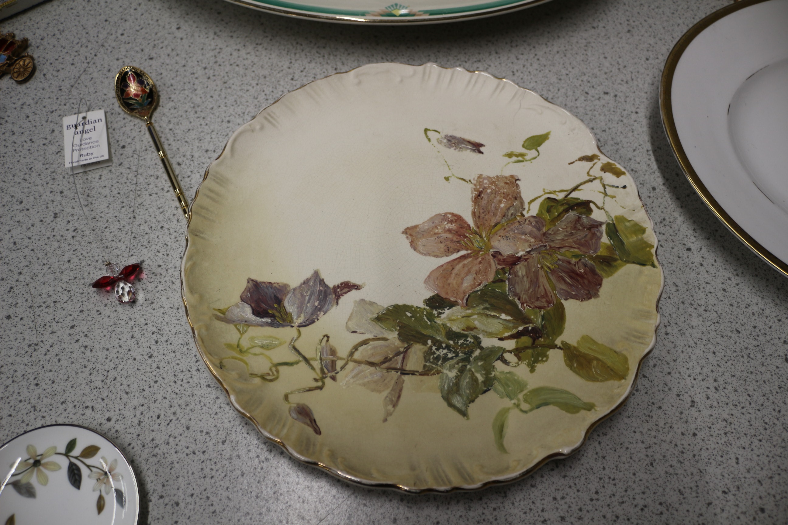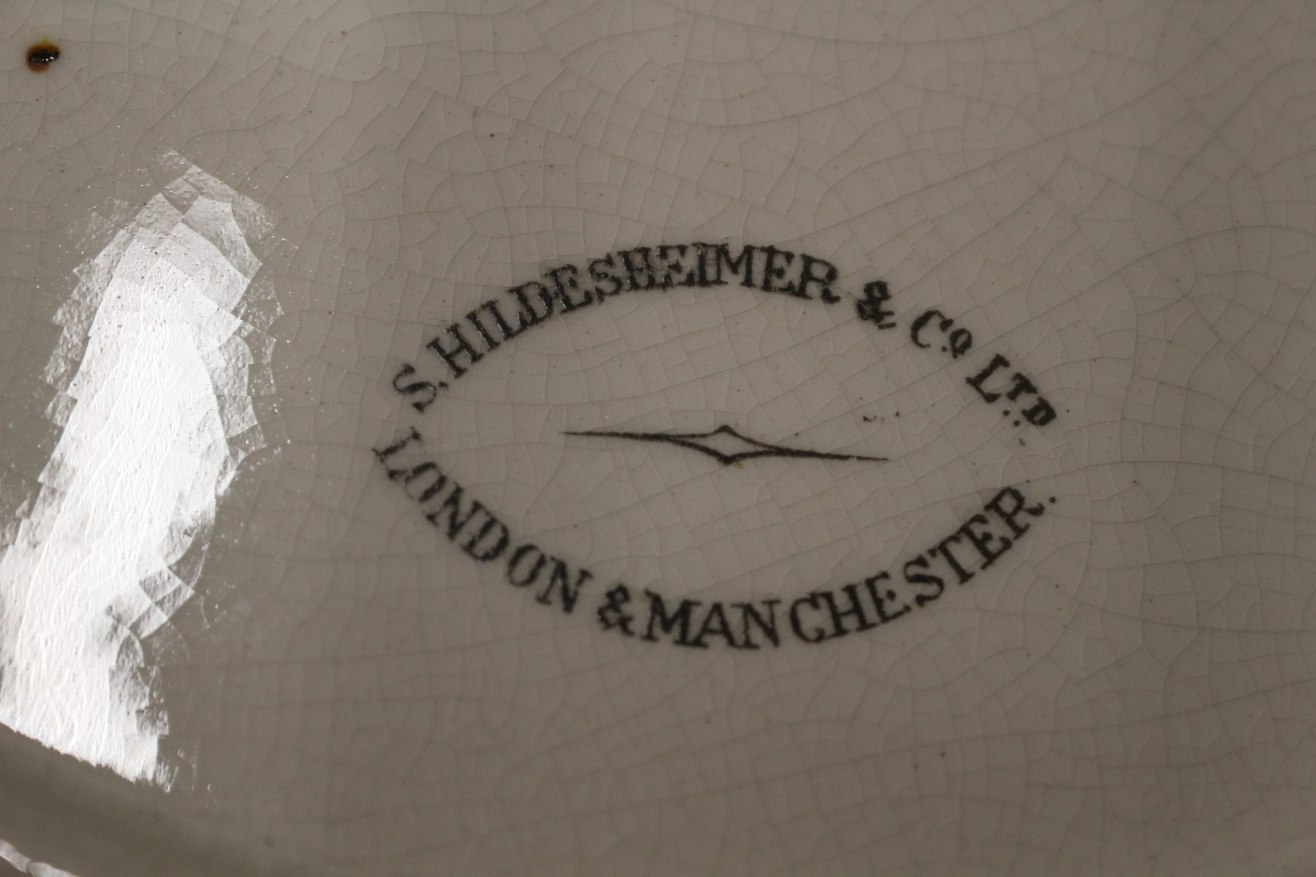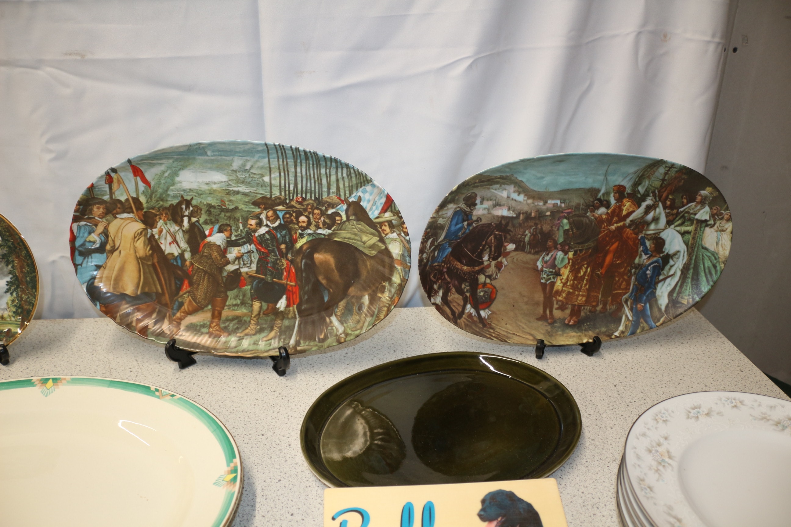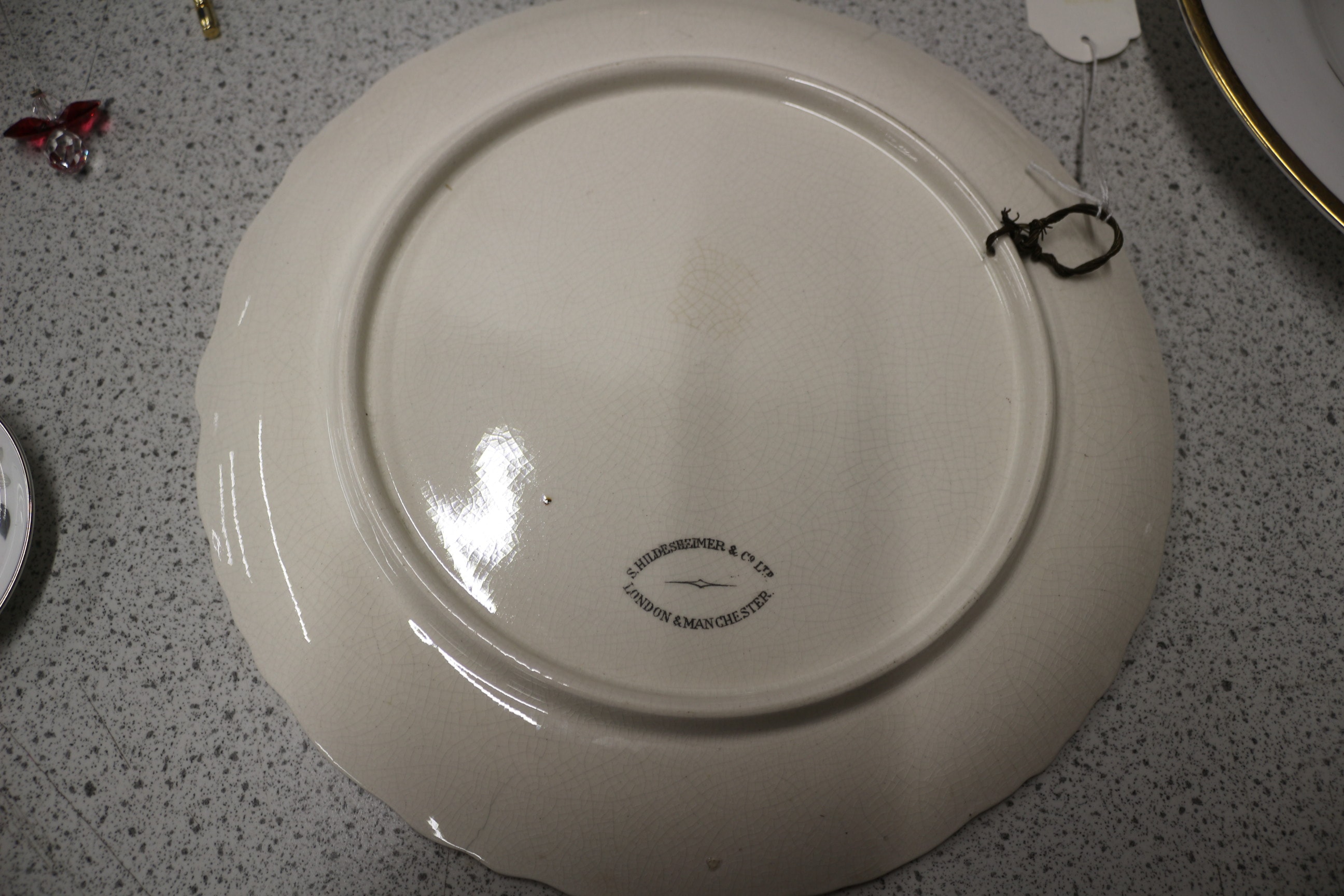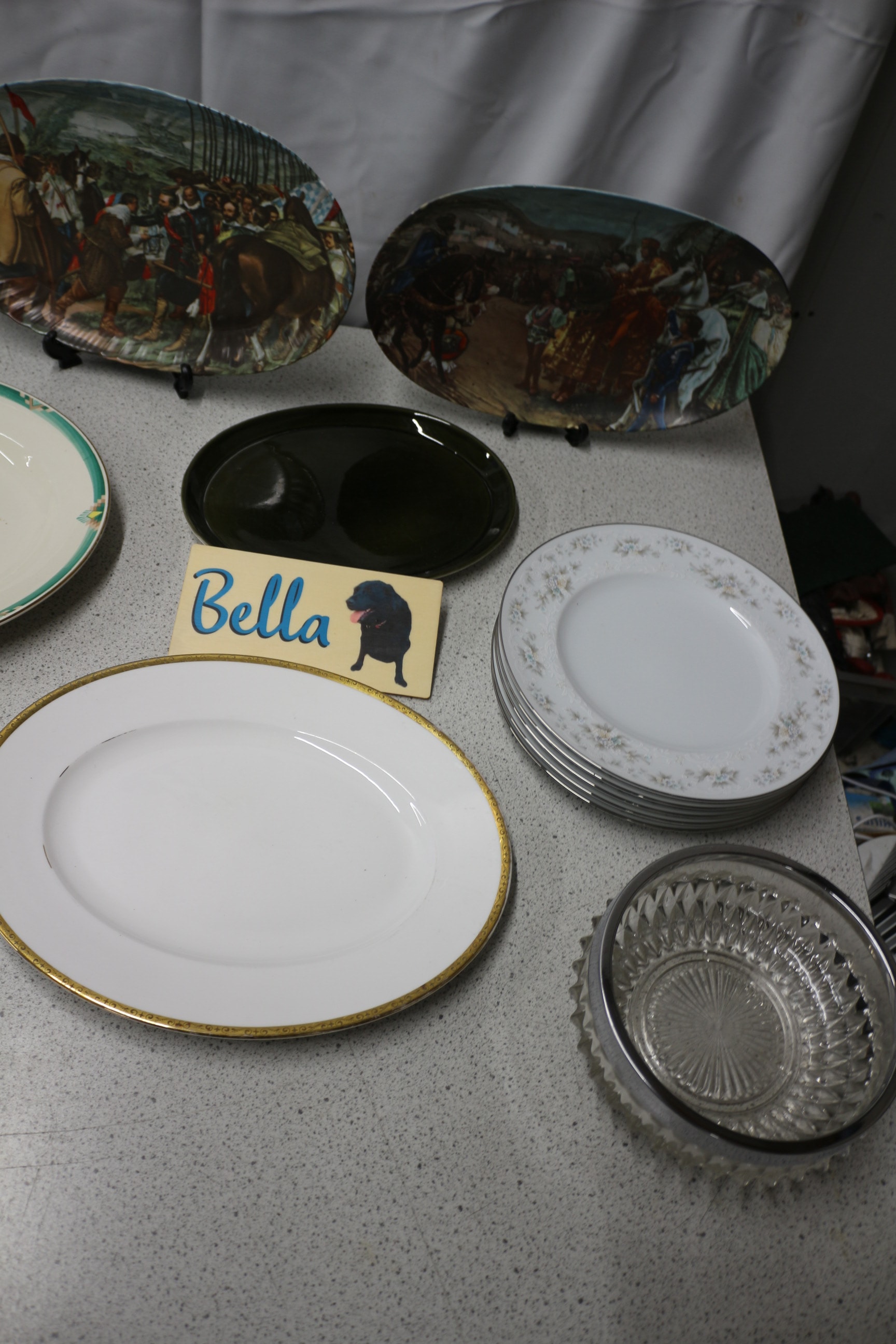 A diverse collection including various clear glass drinking vessels and bowls, several decorative ceramic plates, a box of souvenir magnets, and other small collectible items, including a plate by S. Hildesheimer & Co Ltd.