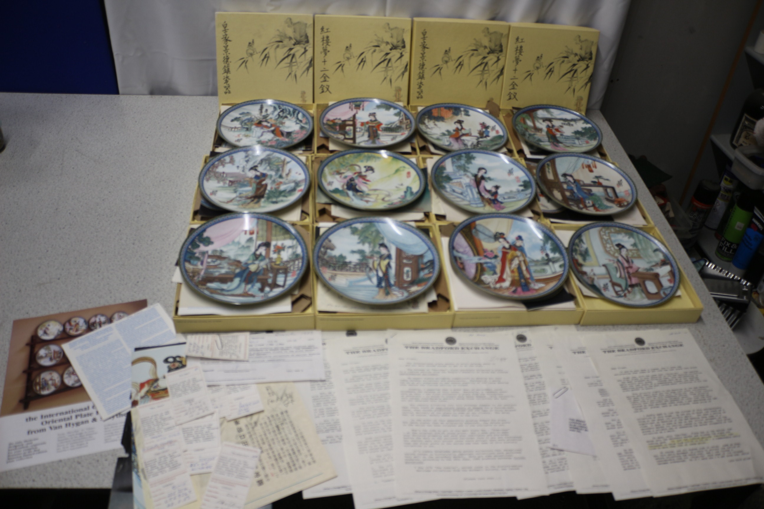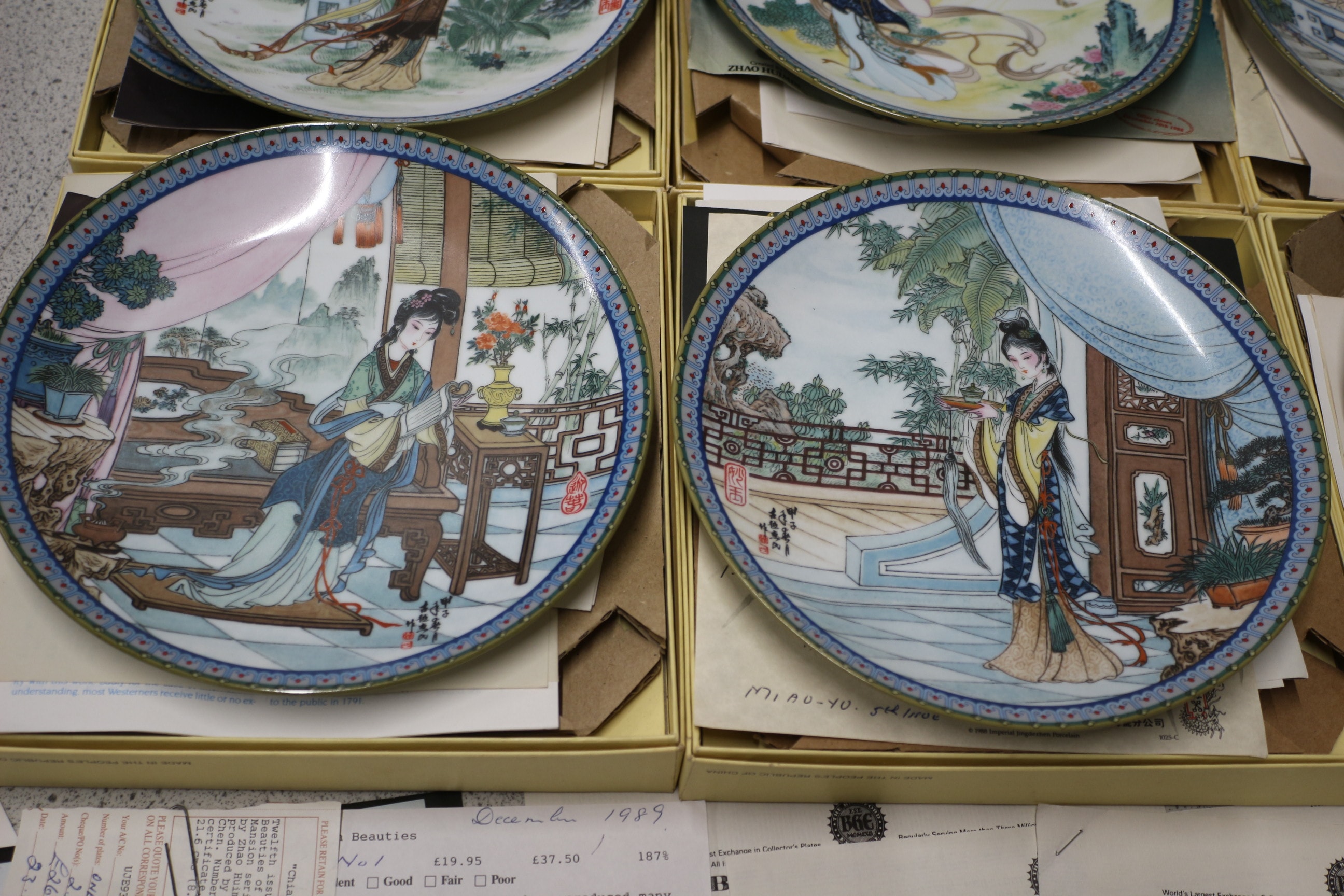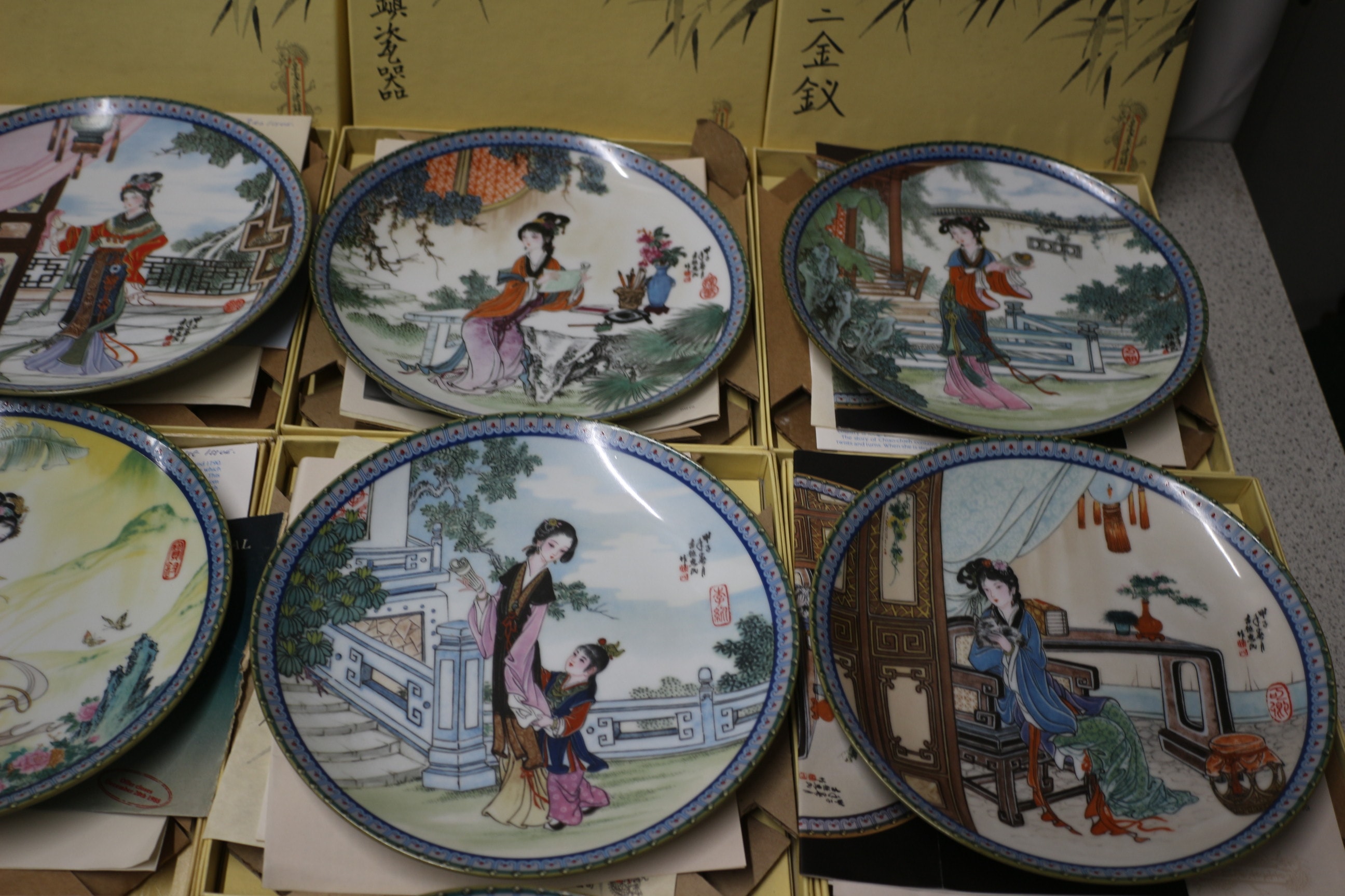 Twelve multi-coloured porcelain collector’s plates, identified as ‘The 12 Beauties’ and ‘紅樓夢十二金釵’ (Dream of the Red Chamber: Twelve Gold Hairpins) on their accompanying yellow boxes, each depicting a Chinese woman.