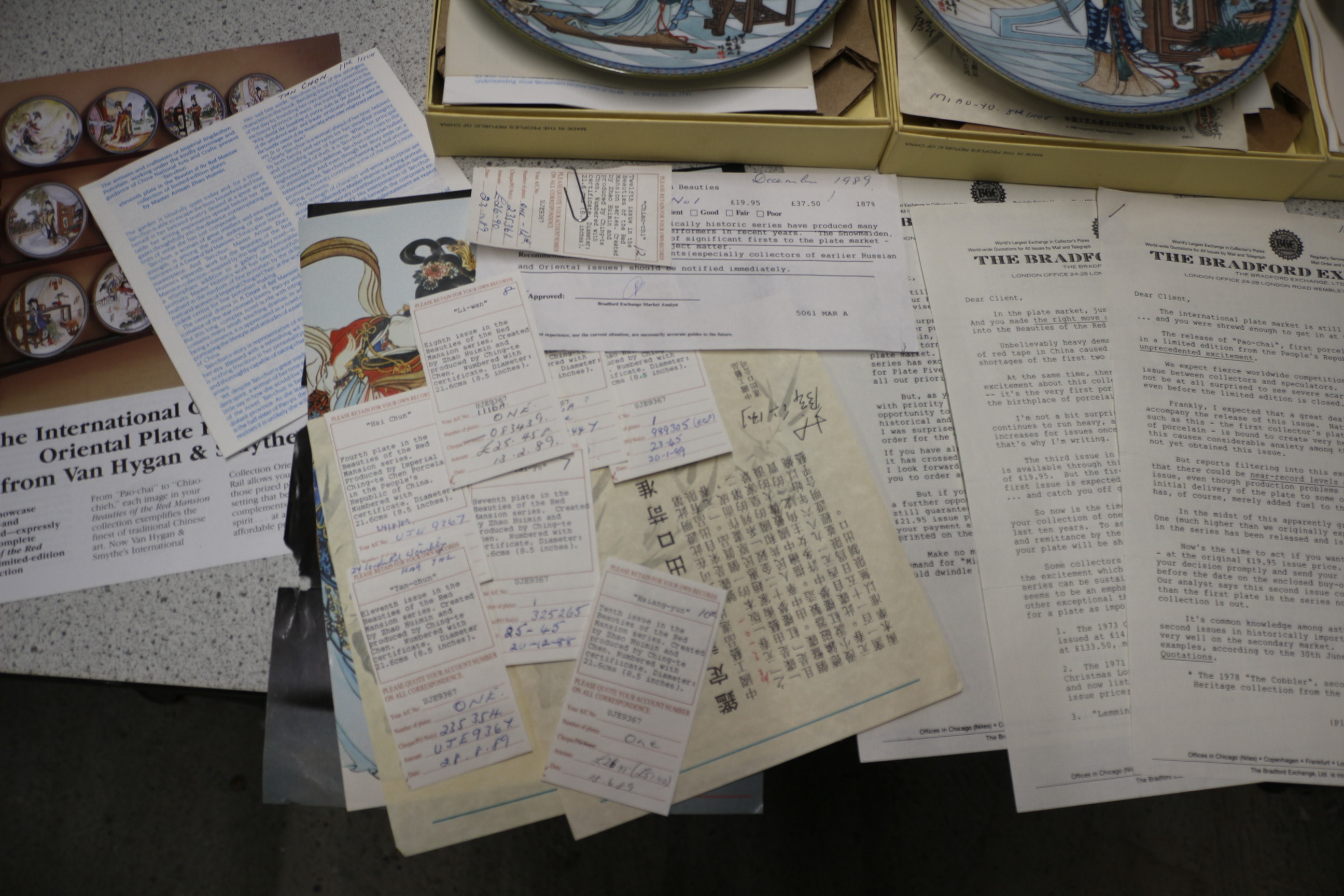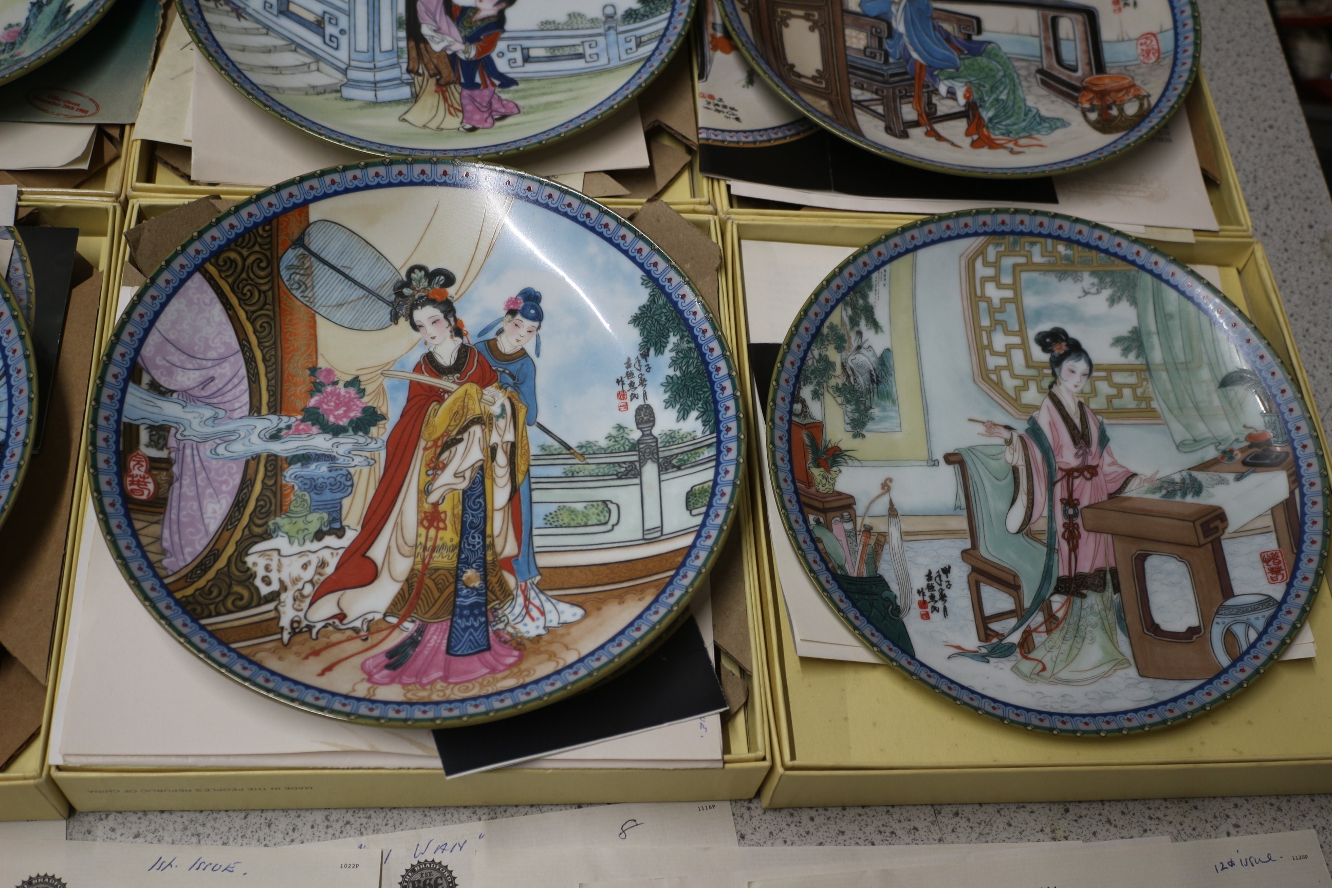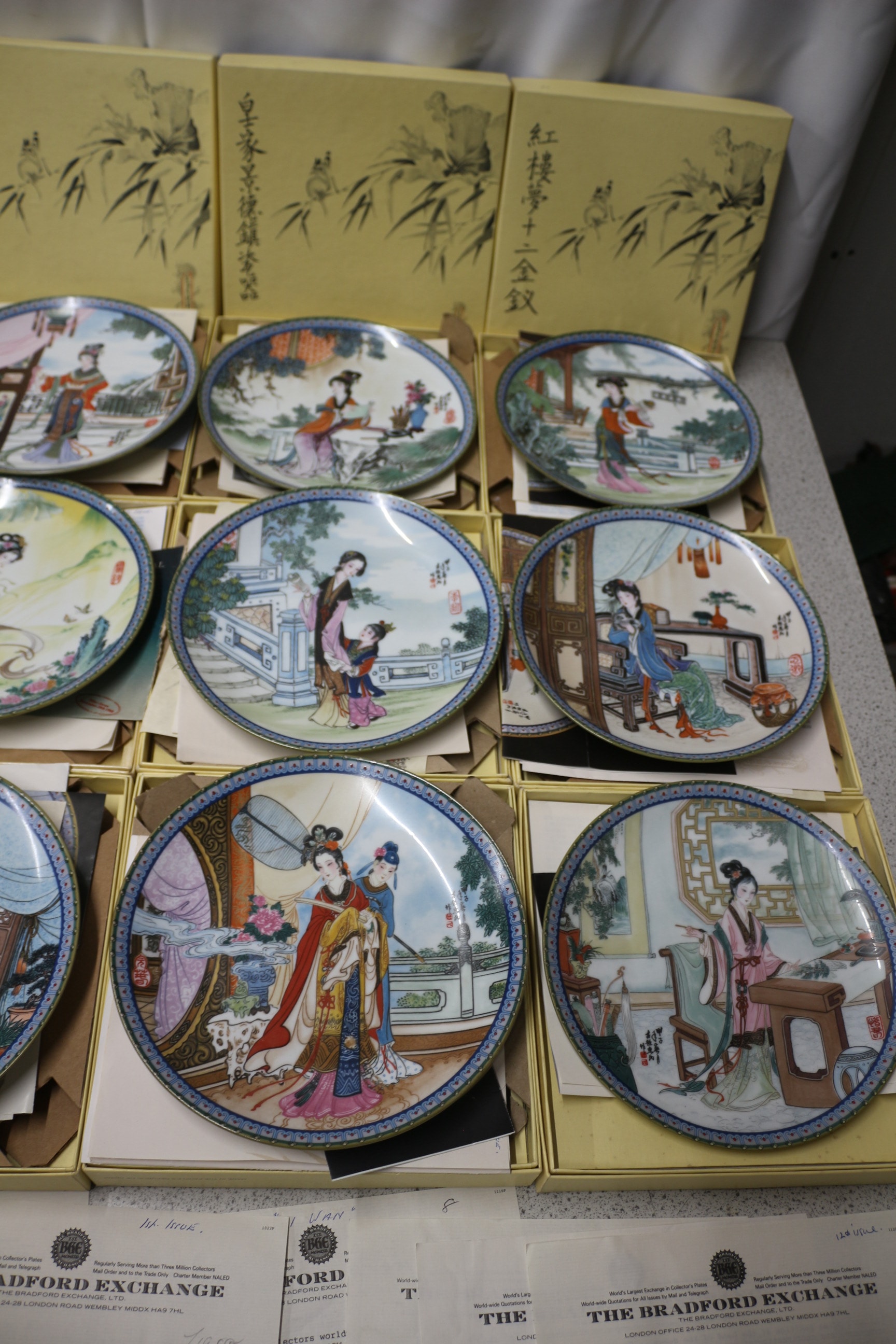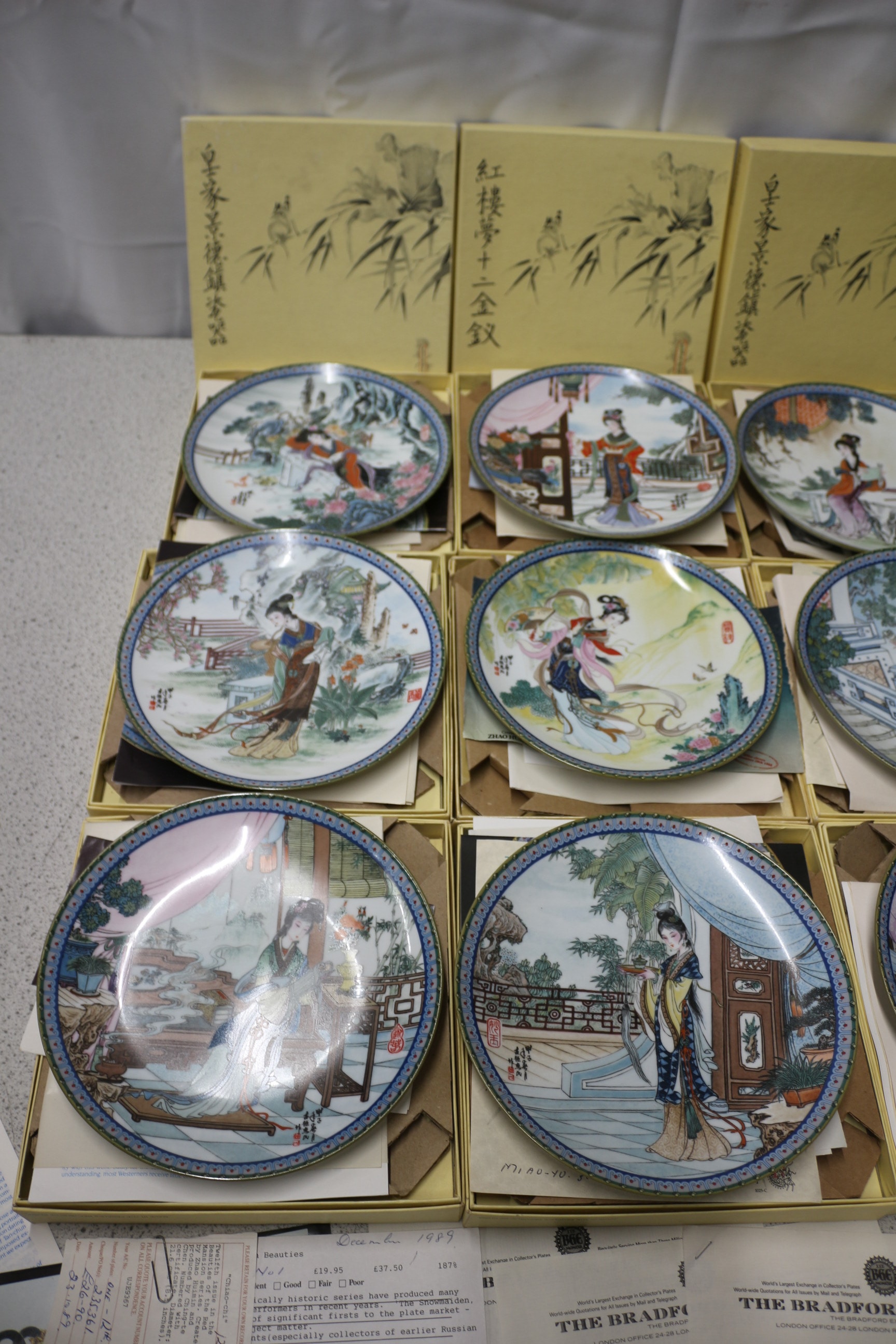 Twelve multi-coloured porcelain collector’s plates, identified as ‘The 12 Beauties’ and ‘紅樓夢十二金釵’ (Dream of the Red Chamber: Twelve Gold Hairpins) on their accompanying yellow boxes, each depicting a Chinese woman.