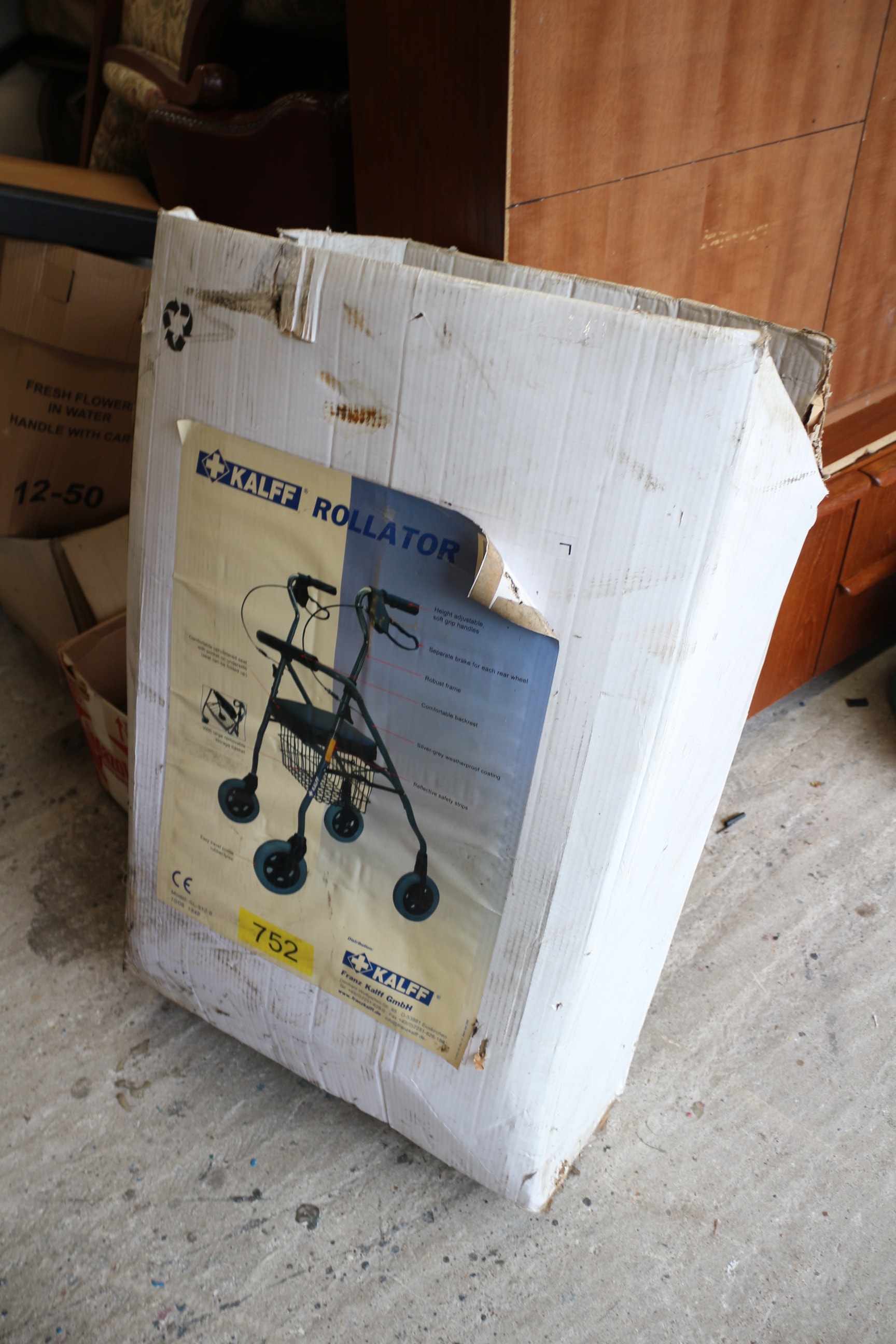 A new, dark grey/black KALFF ROLLATOR mobility aid in its box, labeled with ‘CE’ and ‘Made in P.R.C.’, featuring height adjustable soft grip handles and a robust frame.