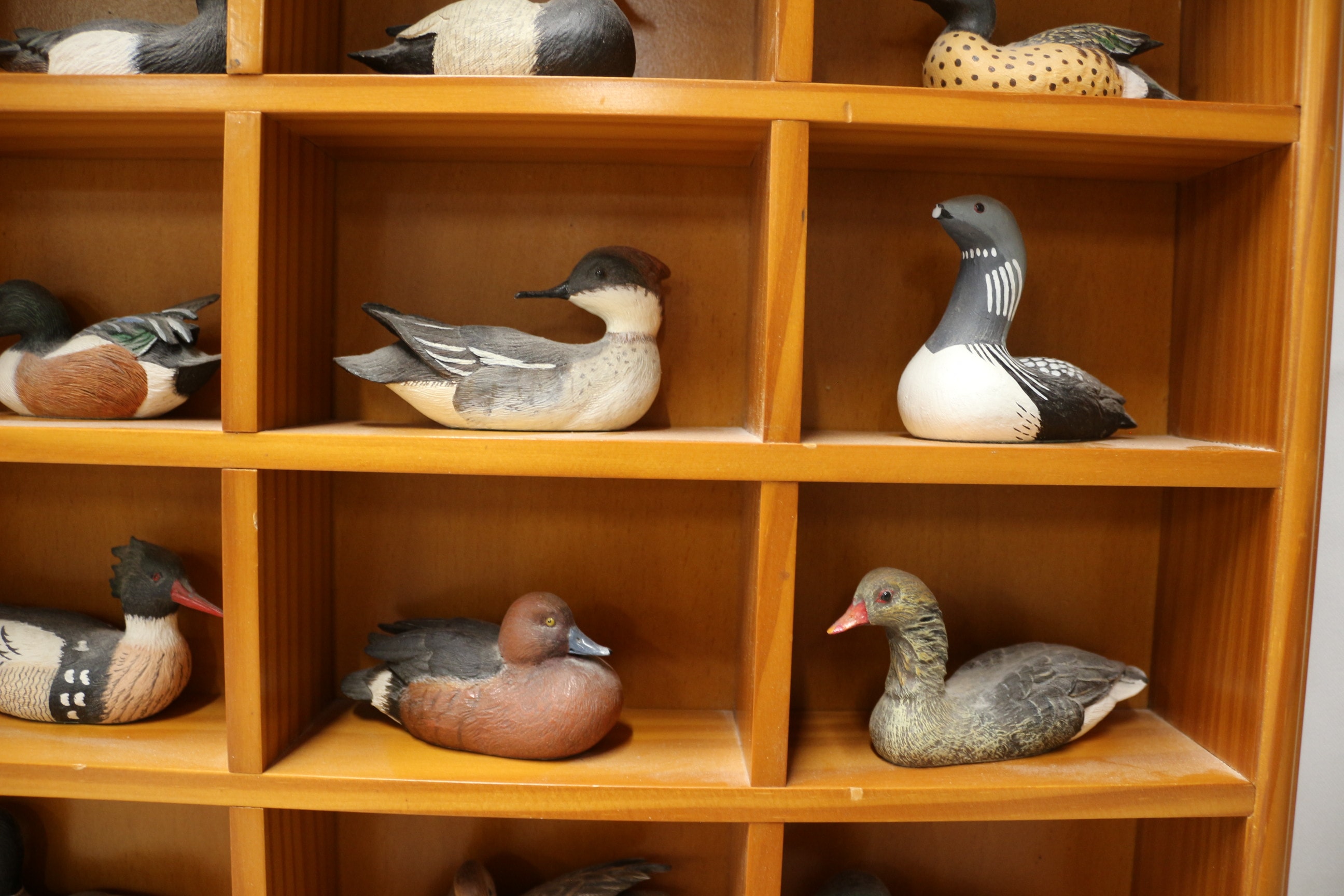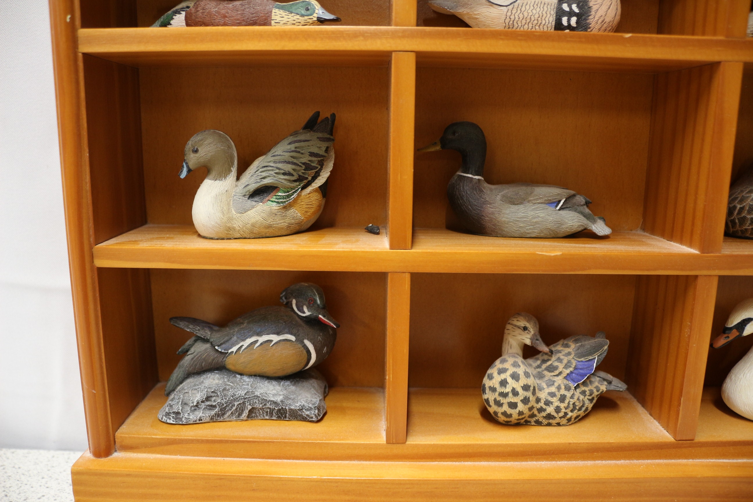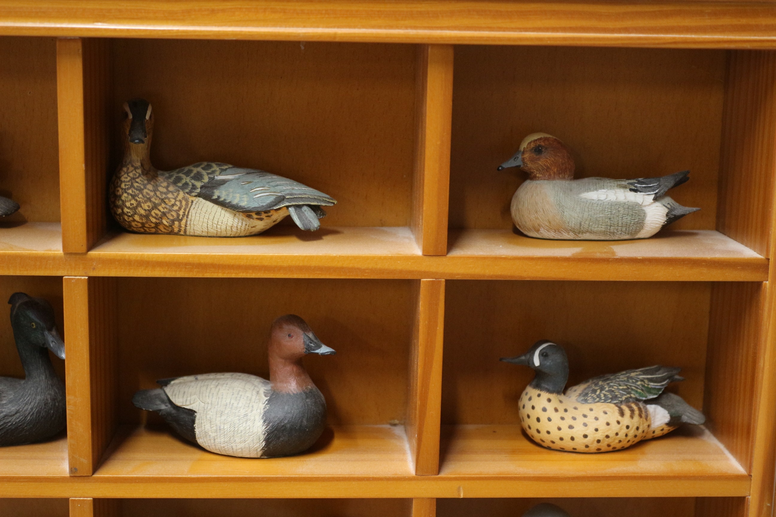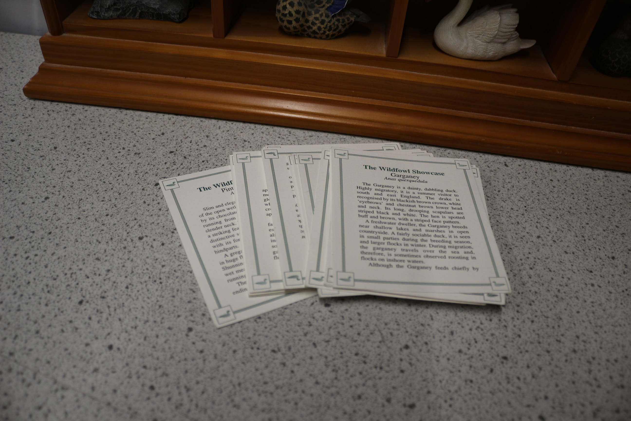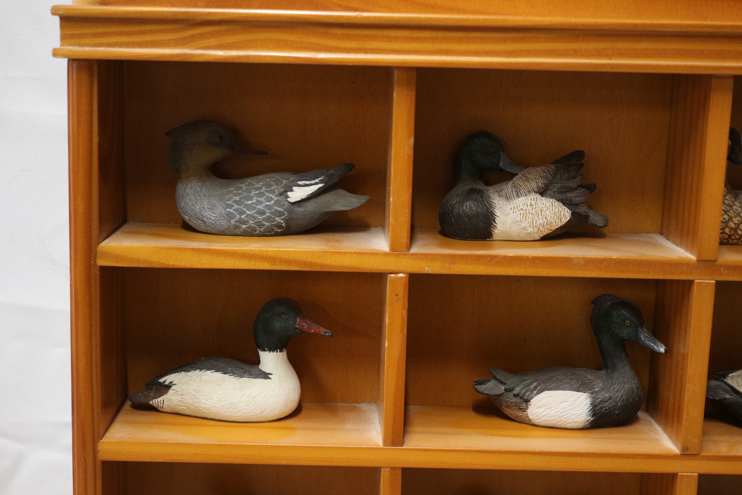A light brown wooden display case contains 24 miniature wildfowl bird figurines in various colours, accompanied by informational cards.