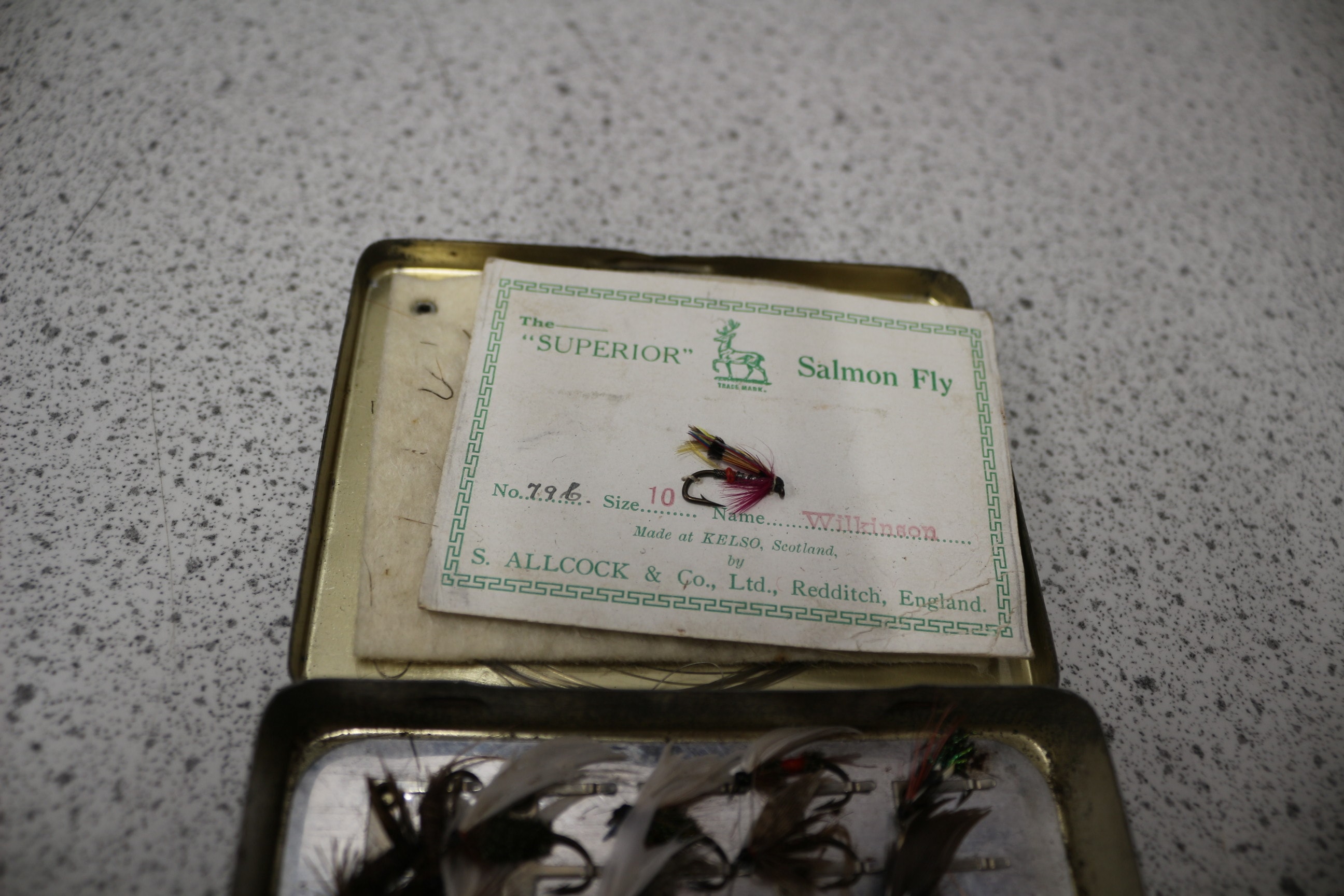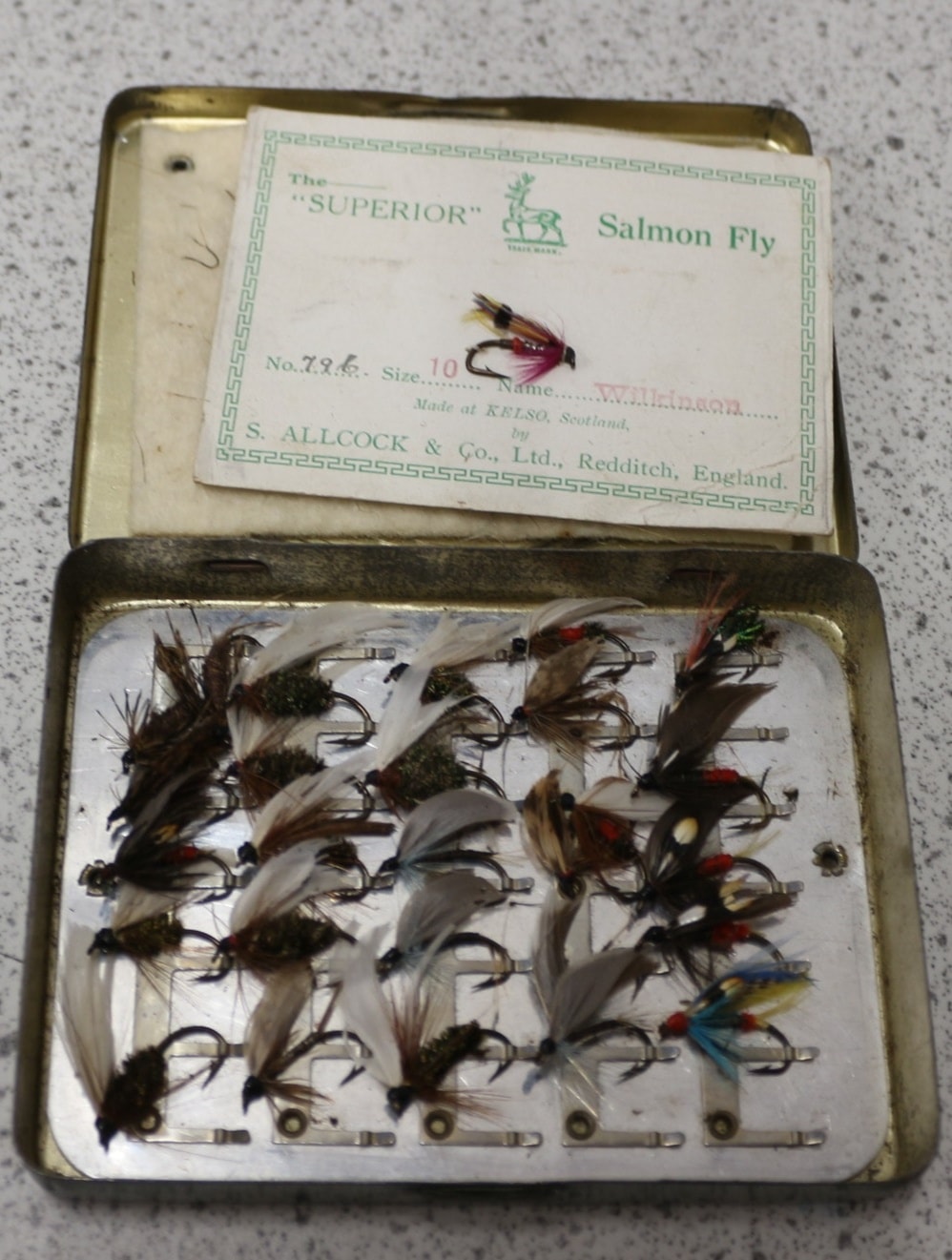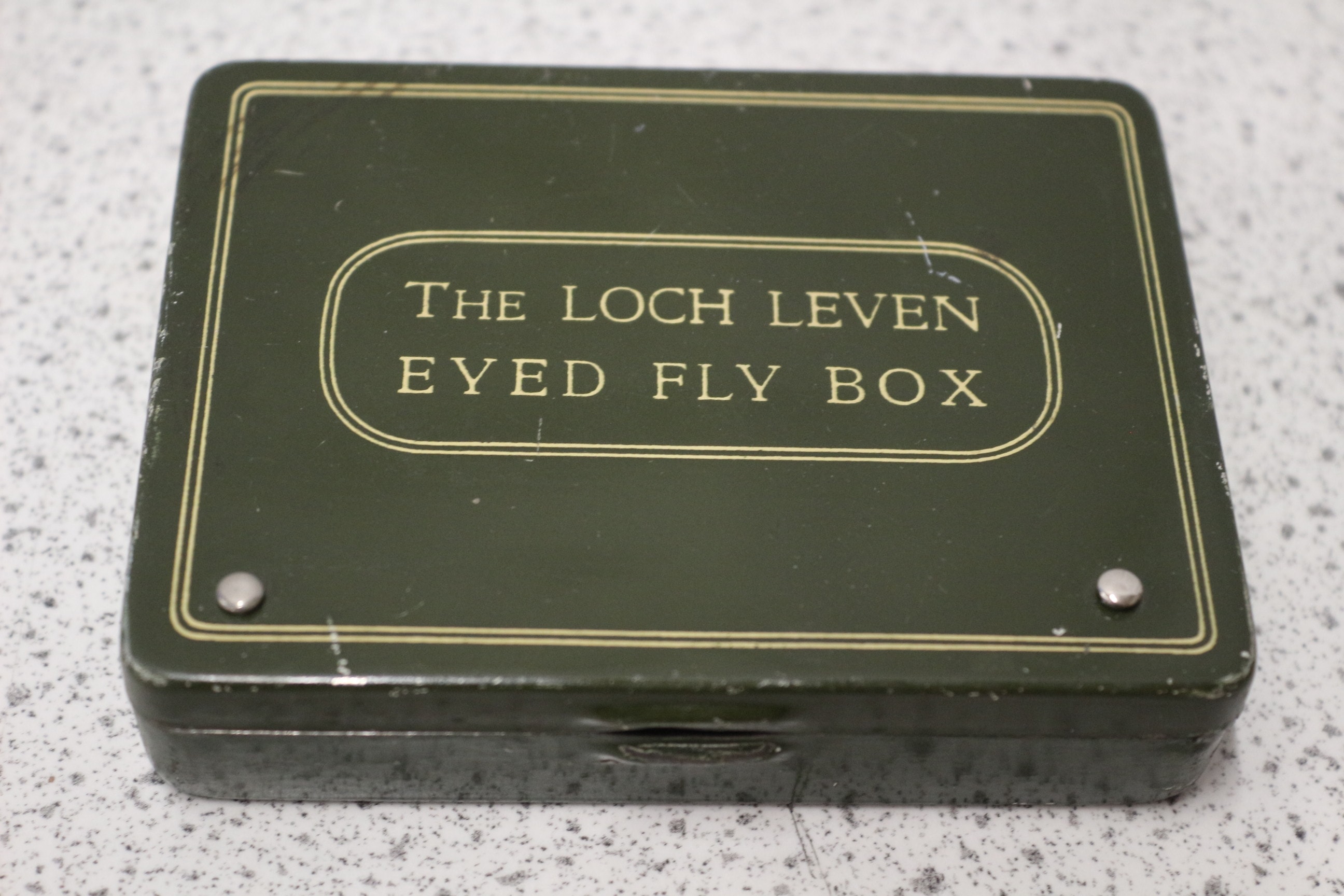 A green metal fly box, labelled “The LOCH LEVEN EYED FLY BOX” and “S. ALLCOCK & Co., Ltd.”, containing approximately 20-25 multi-coloured fishing flies, including “The “SUPERIOR” Salmon Fly” type.