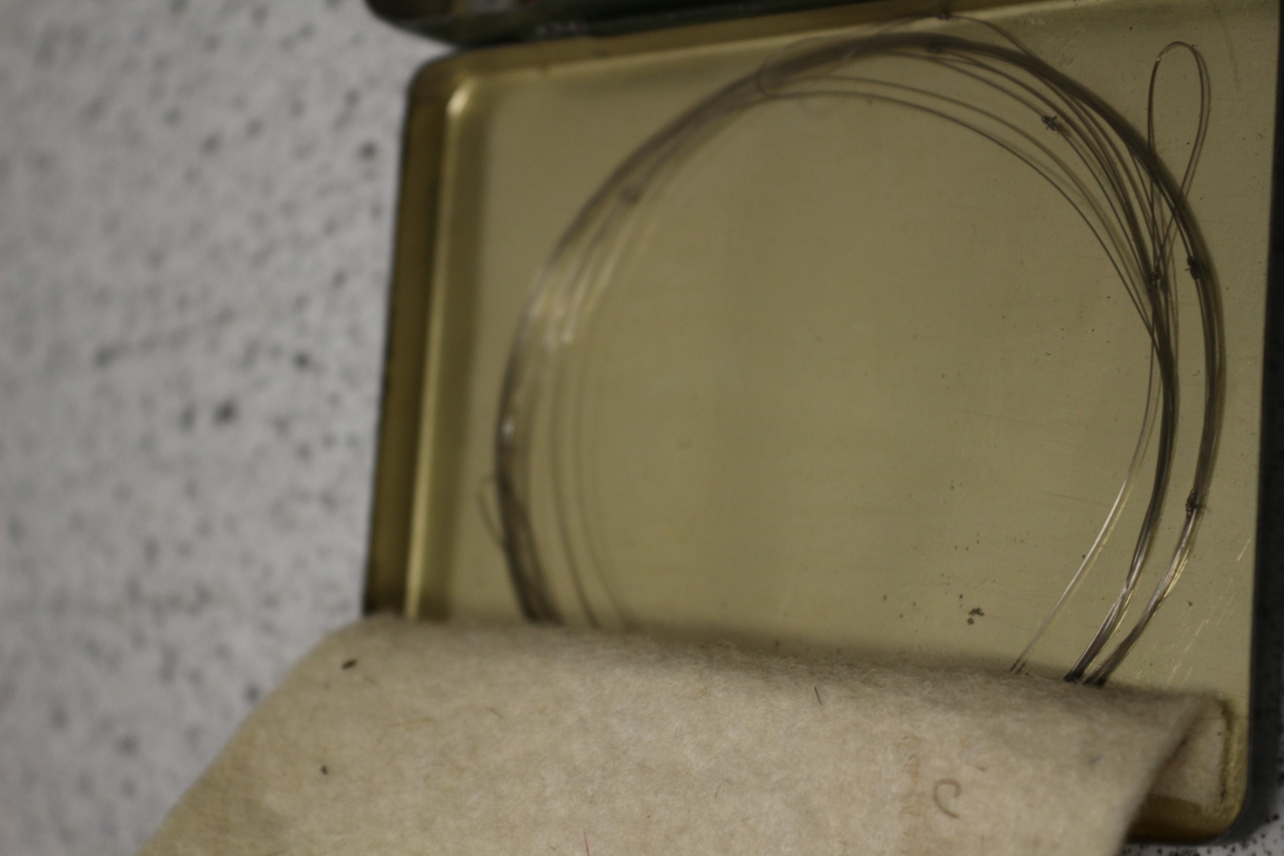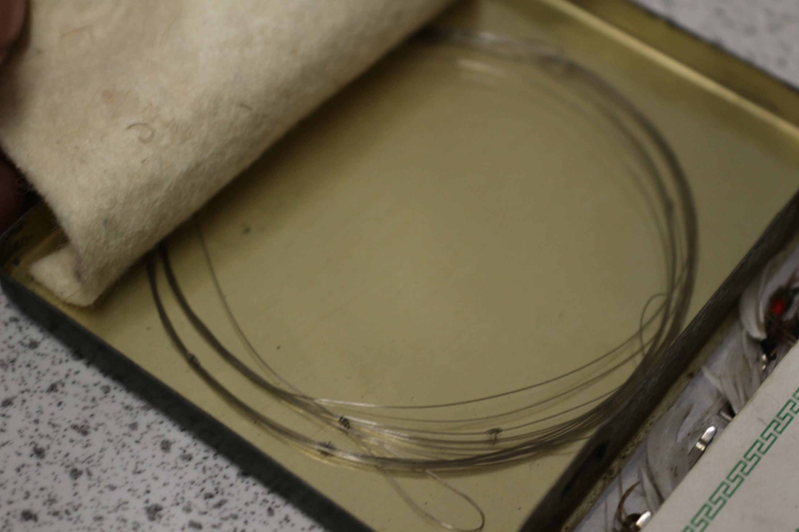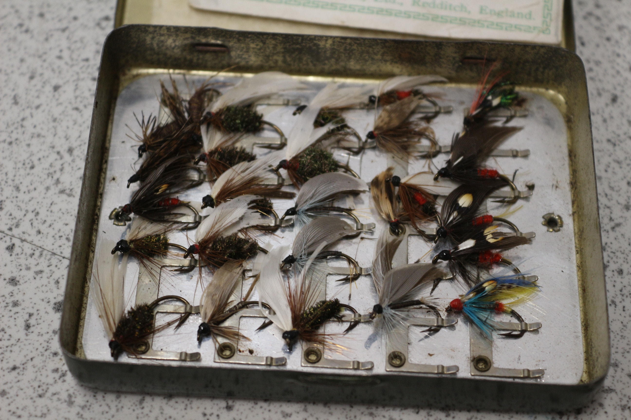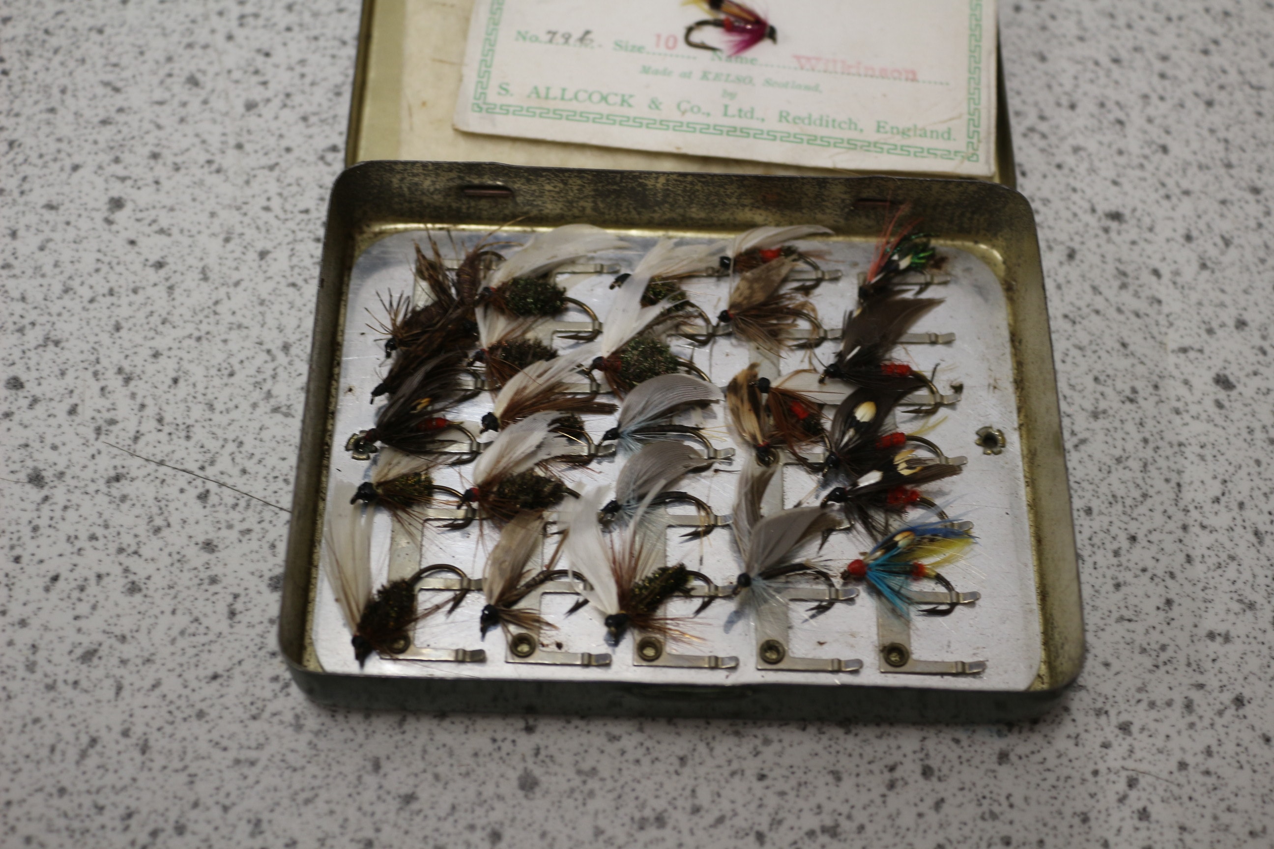 A green metal fly box, labelled “The LOCH LEVEN EYED FLY BOX” and “S. ALLCOCK & Co., Ltd.”, containing approximately 20-25 multi-coloured fishing flies, including “The “SUPERIOR” Salmon Fly” type.