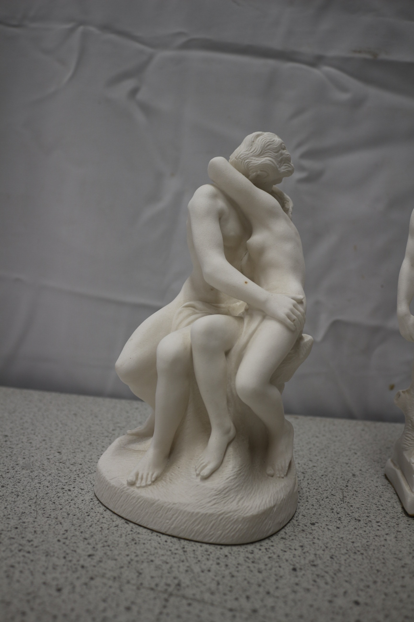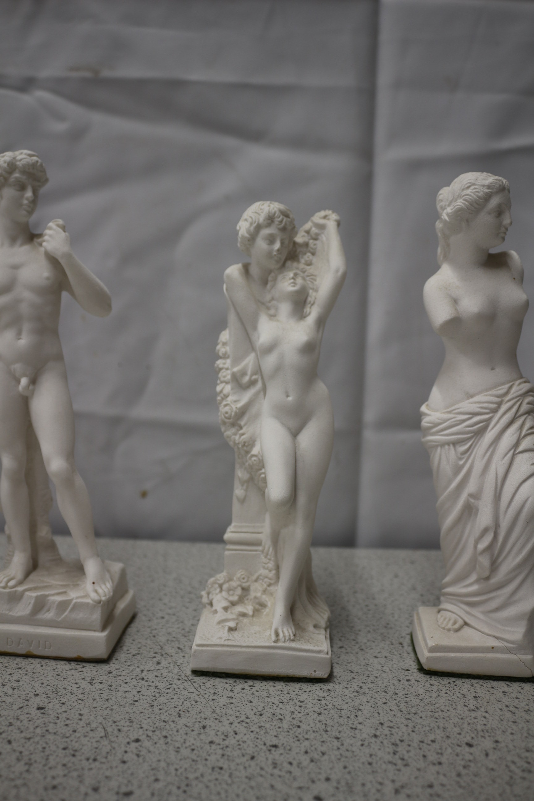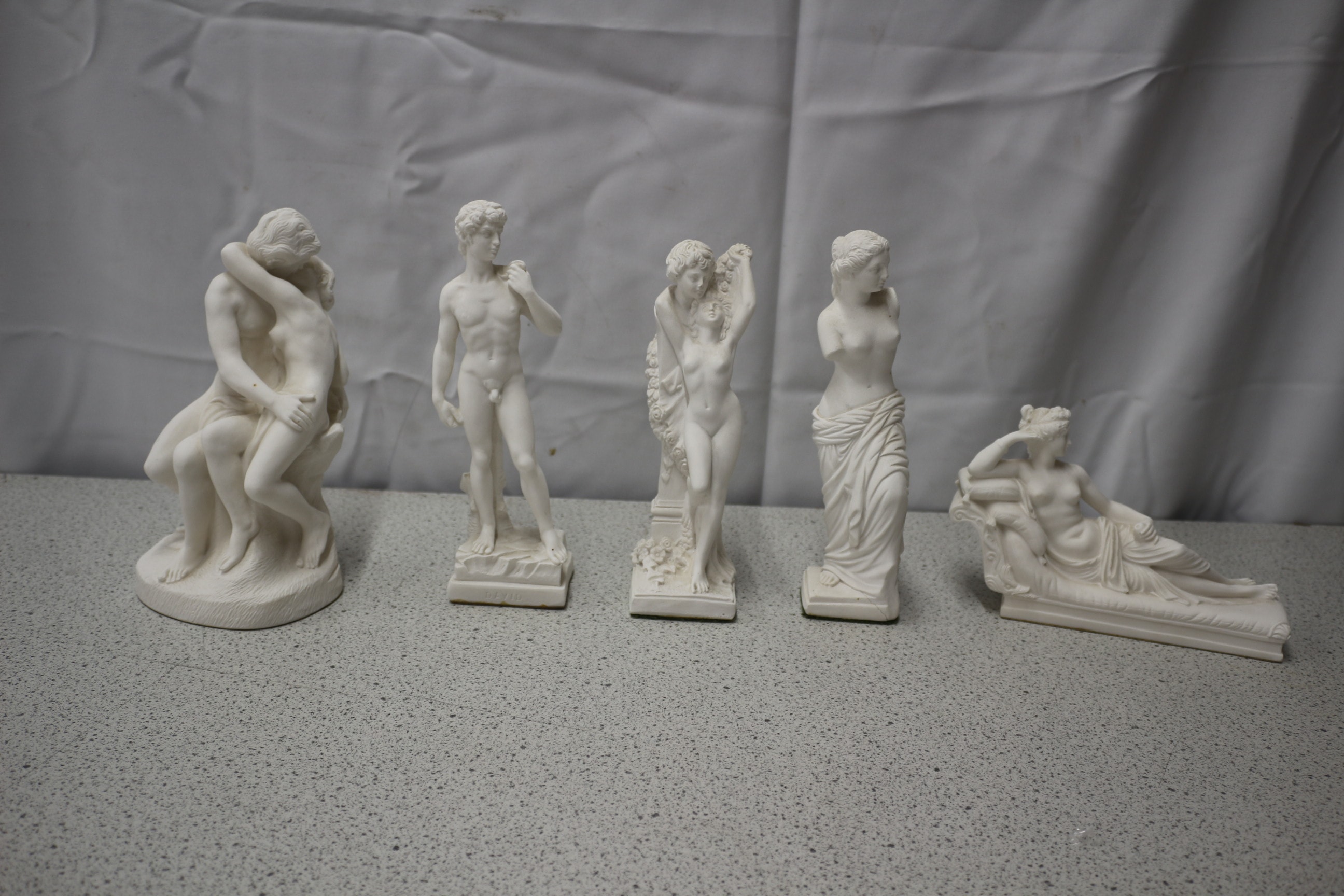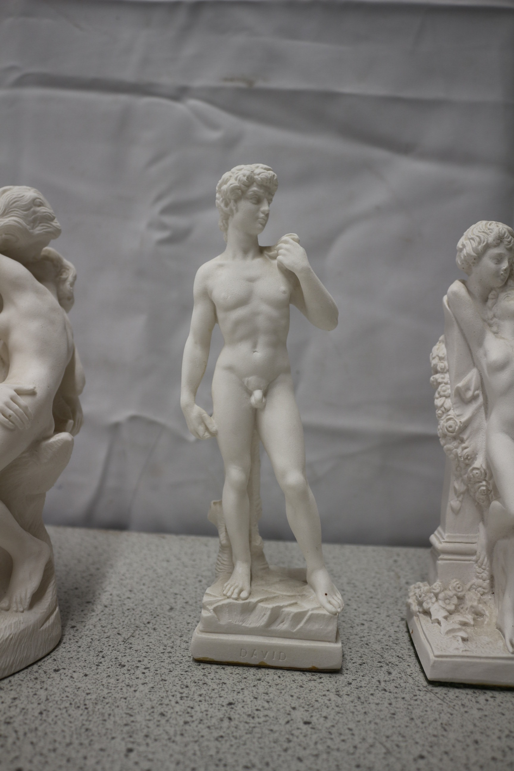 A collection of five white alabaster figurines including two embracing couples, a standing male figure inscribed “DAVID”, a draped female torso, and a reclining female figure.