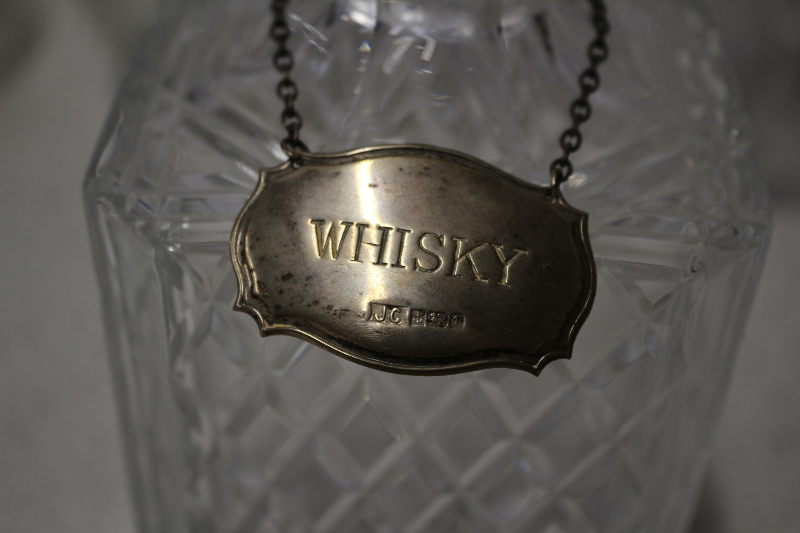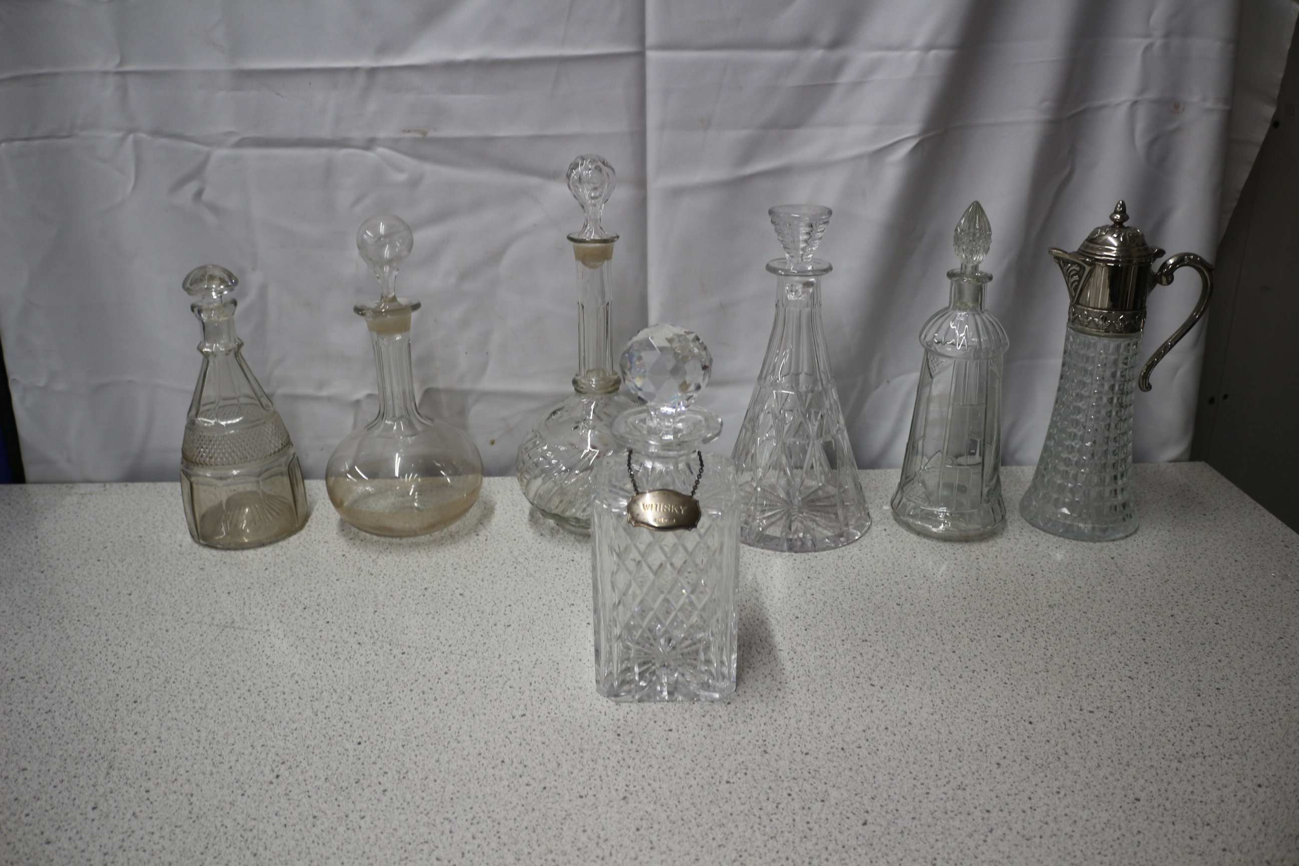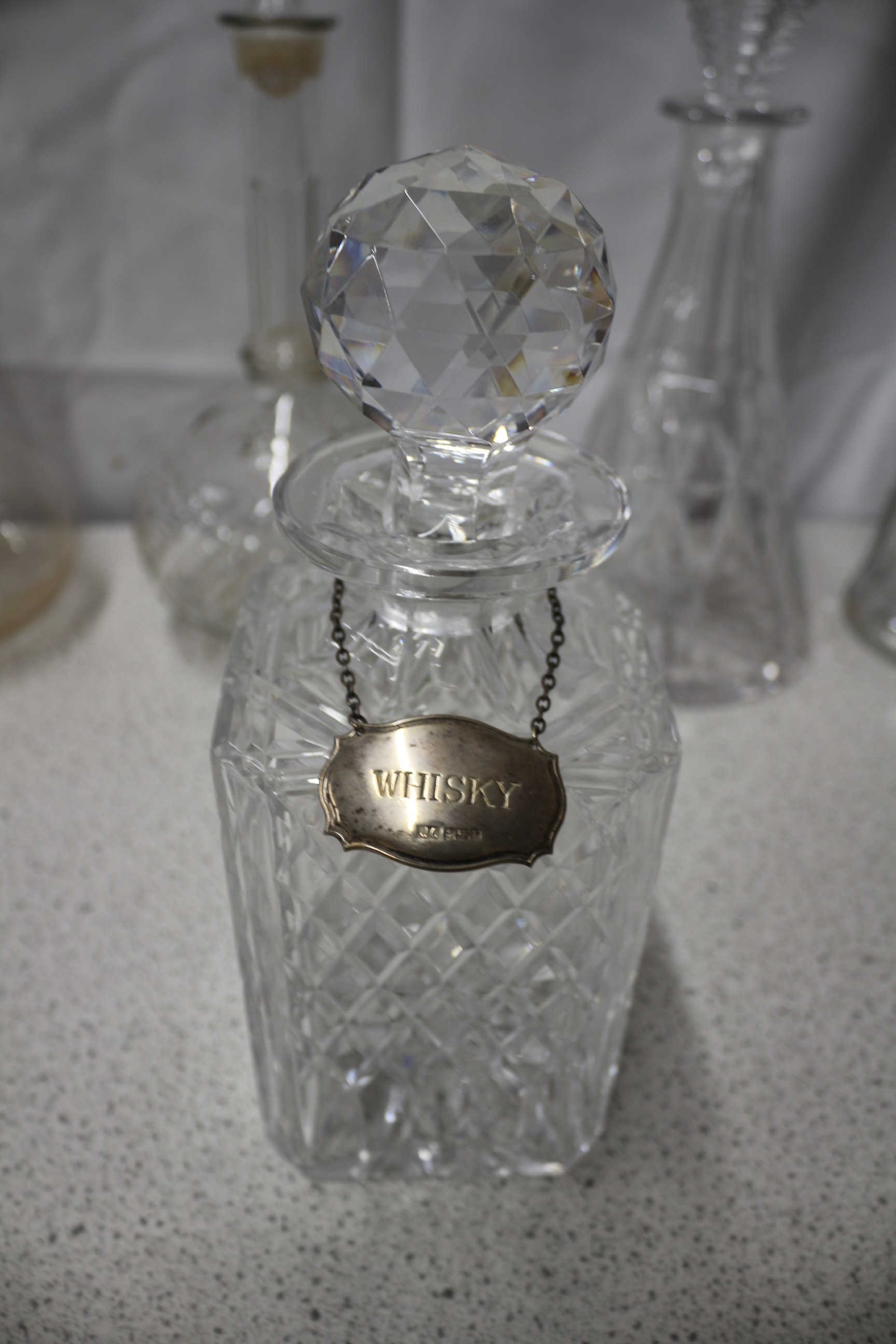 A collection of seven glass decanters and Claret Jug, including one clear faceted glass decanter with a faceted stopper and a silver ‘WHISKY’ label on a chain, bearing maker’s mark ‘J.G&S.’