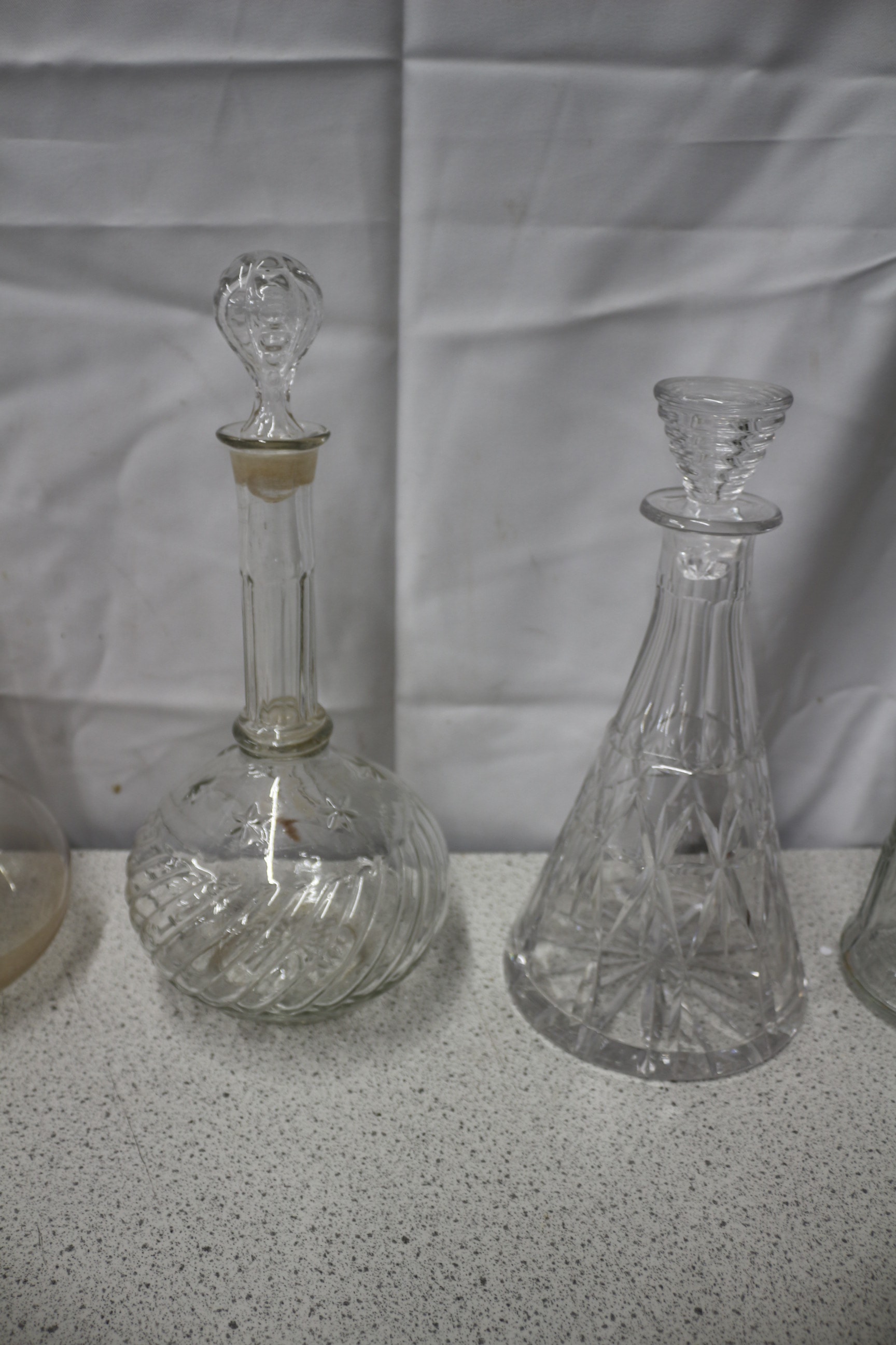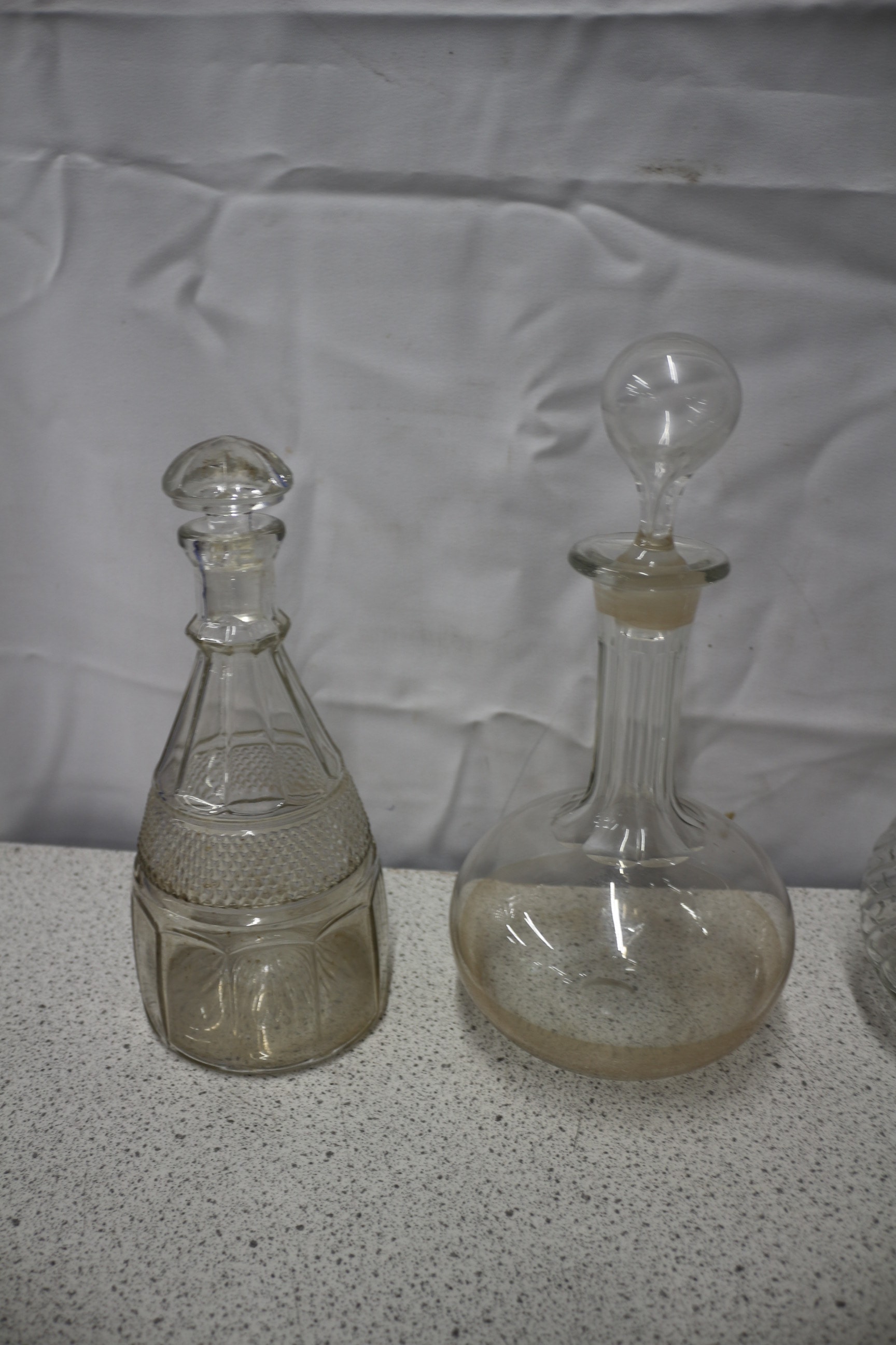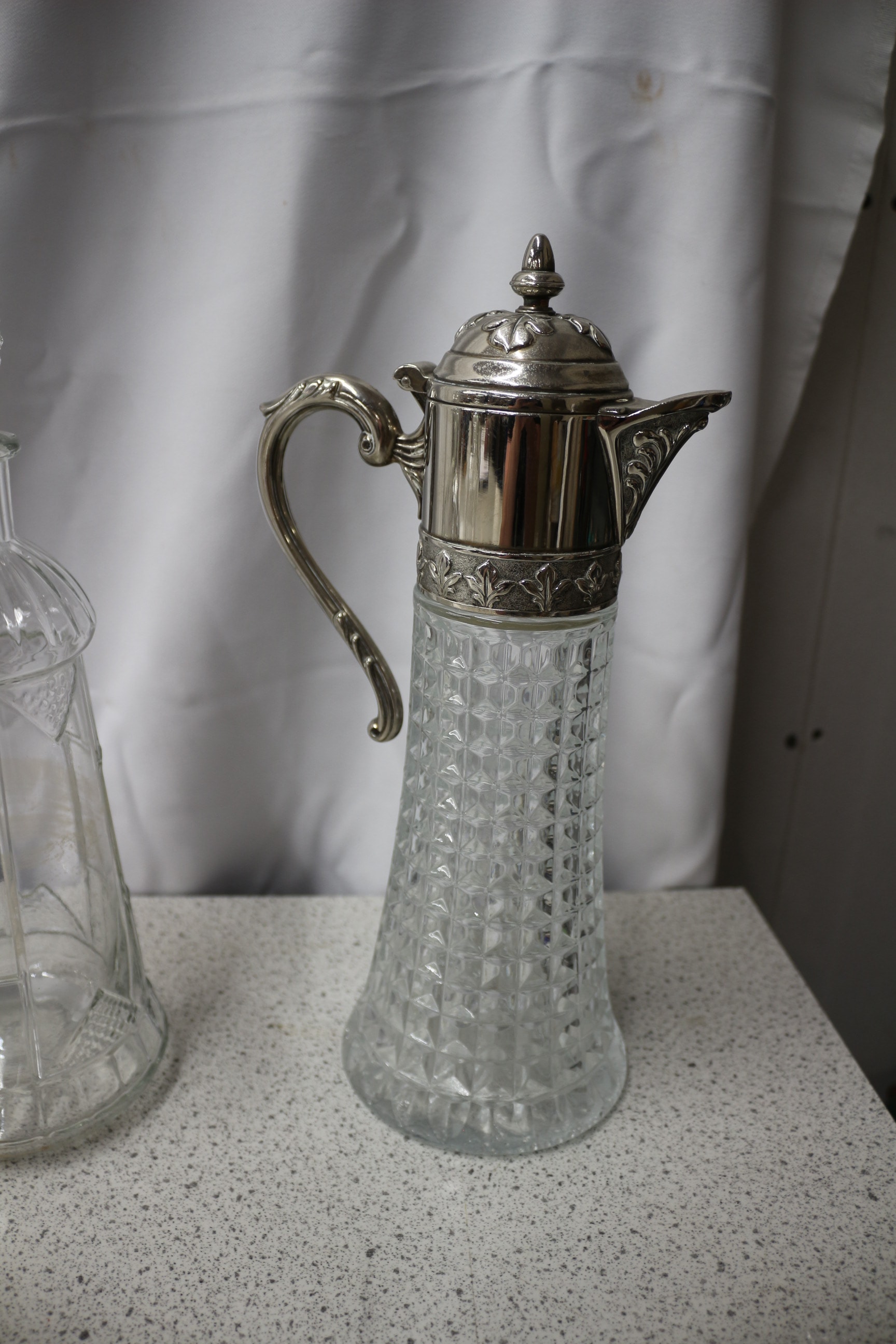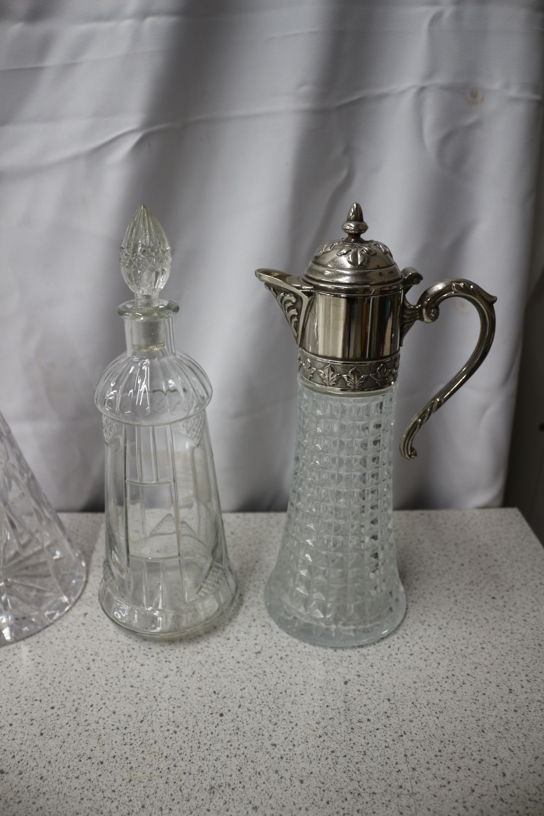 A collection of seven glass decanters and Claret Jug, including one clear faceted glass decanter with a faceted stopper and a silver ‘WHISKY’ label on a chain, bearing maker’s mark ‘J.G&S.’