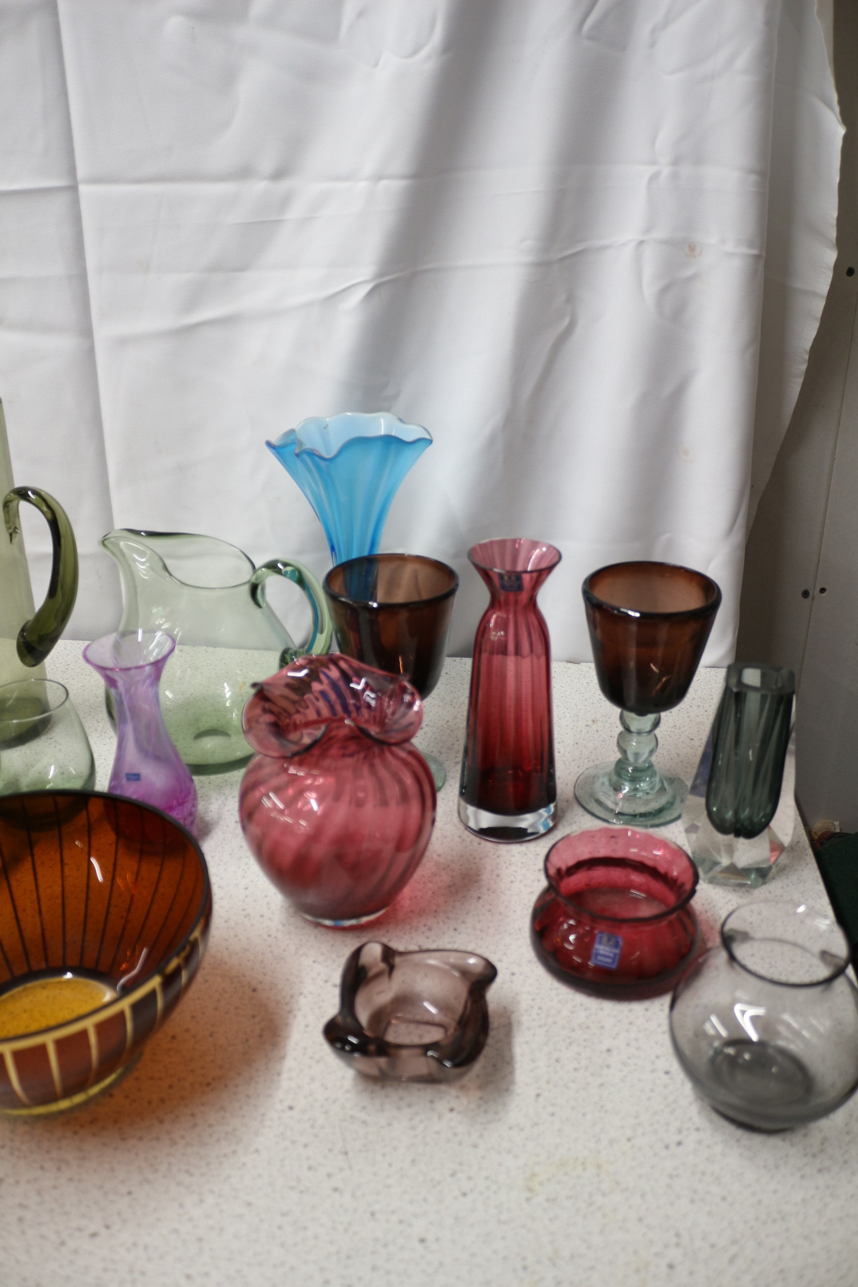 A collection of approximately 40 various coloured glassware items, including vases, pitchers, decanters, drinking glasses, bowls, and goblets. Inc Caithness, Dartington Glass