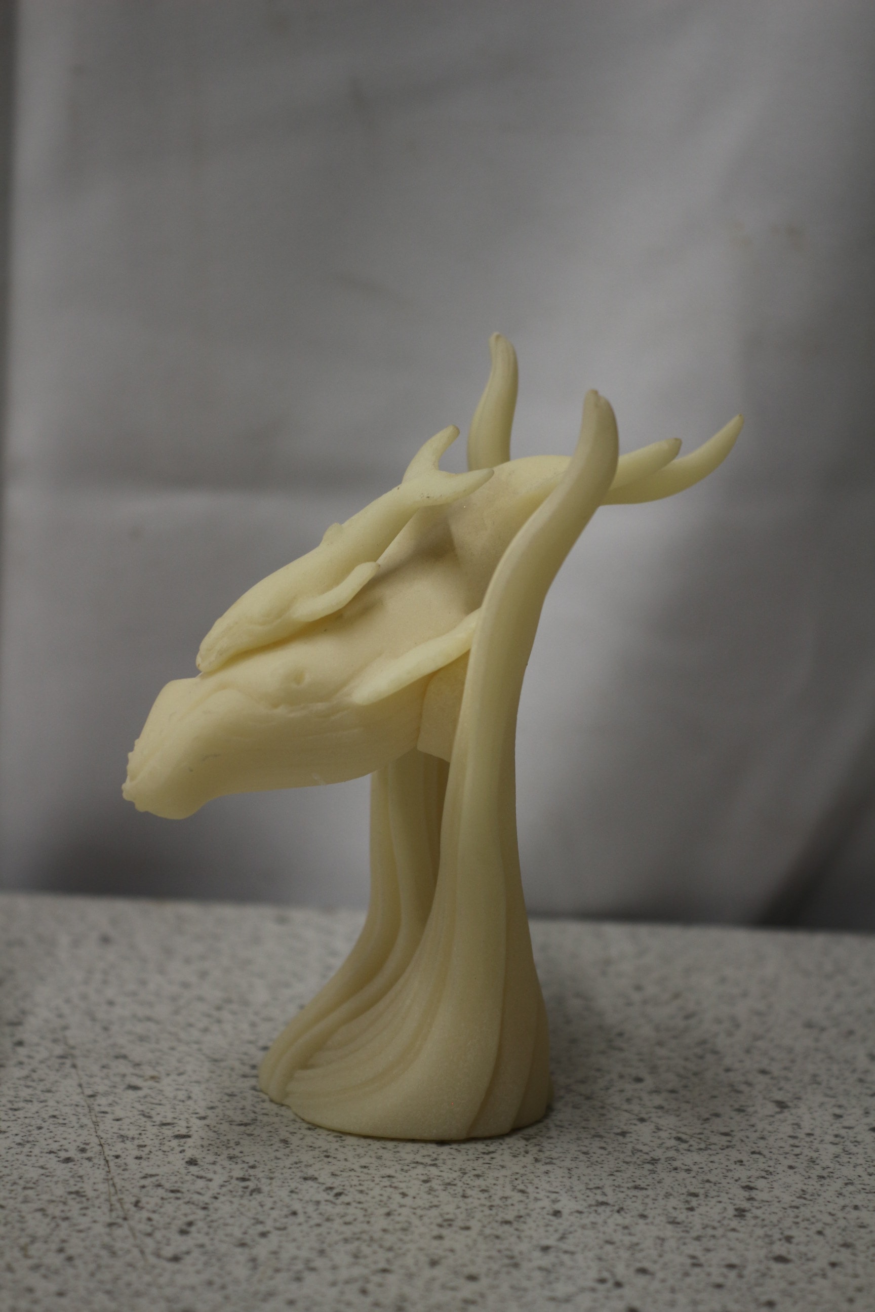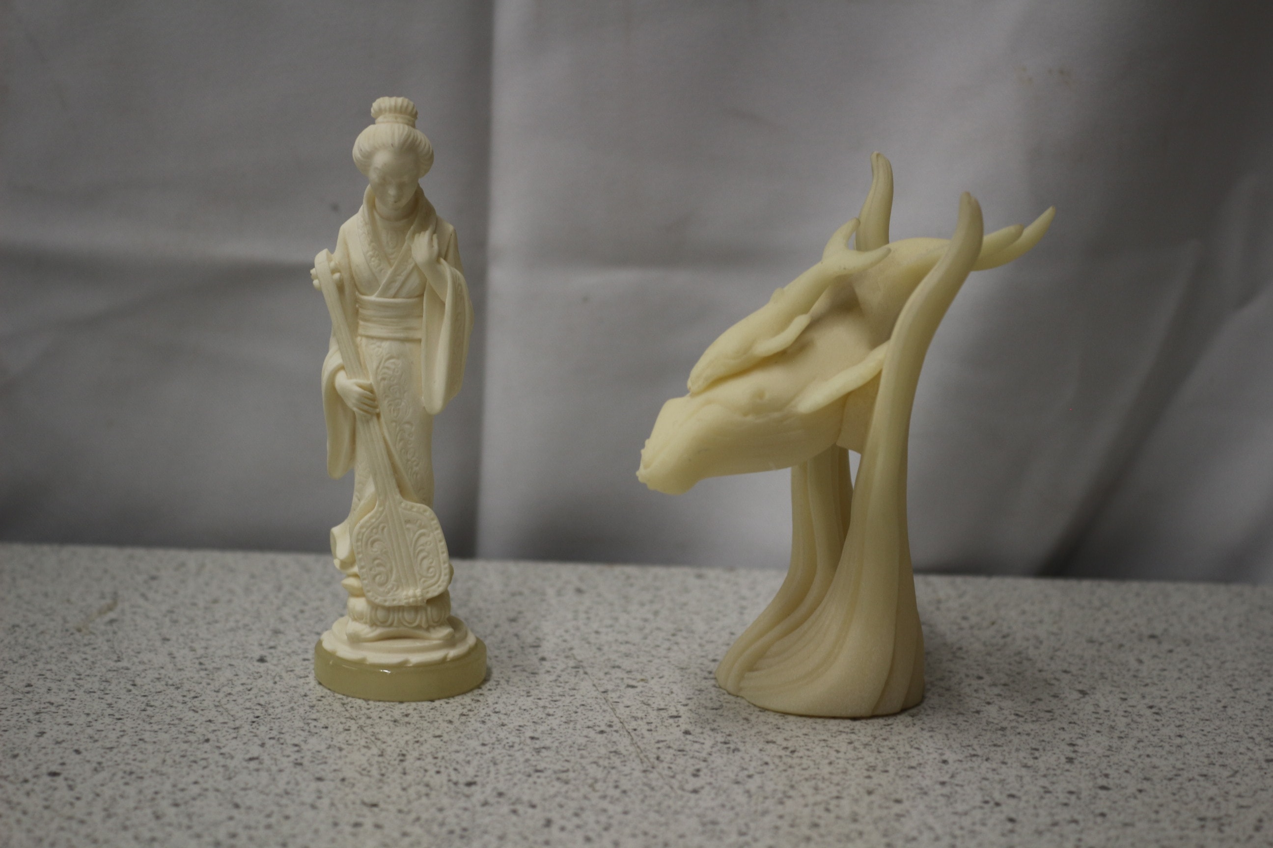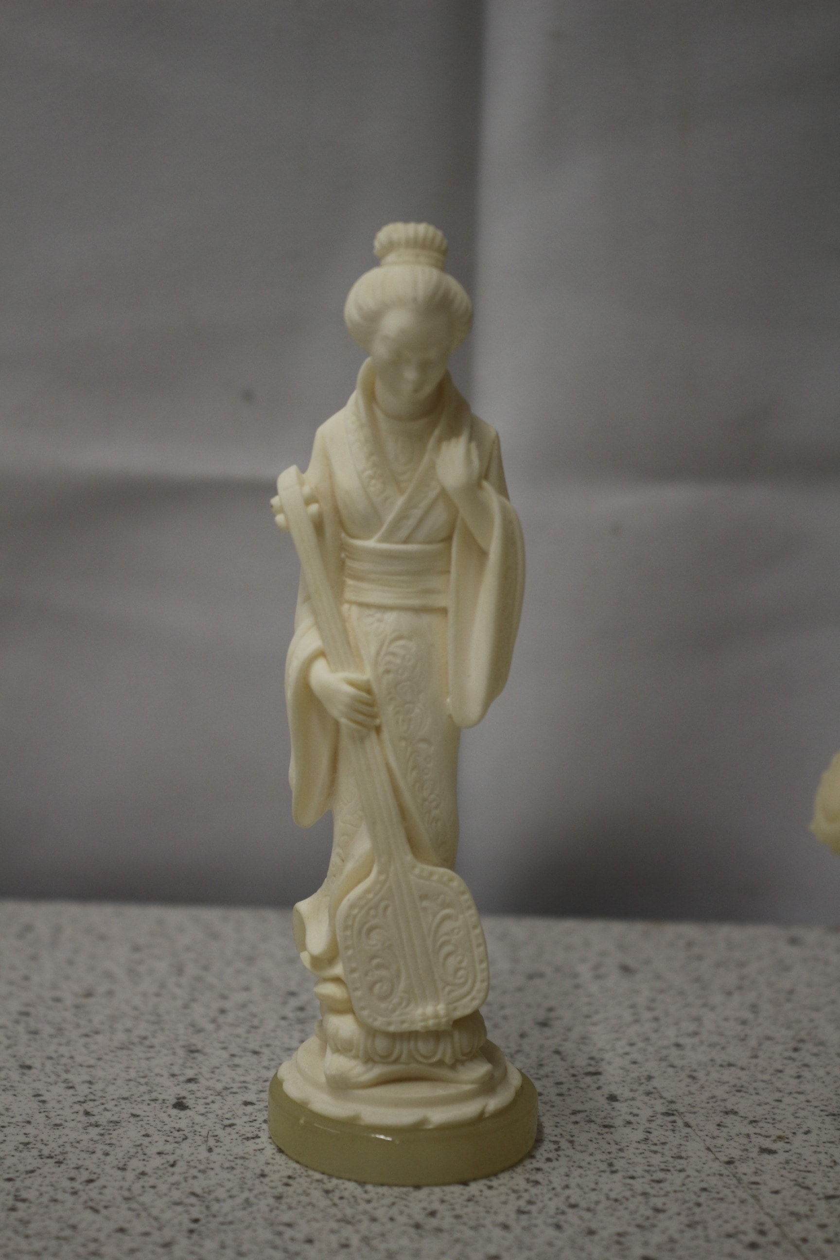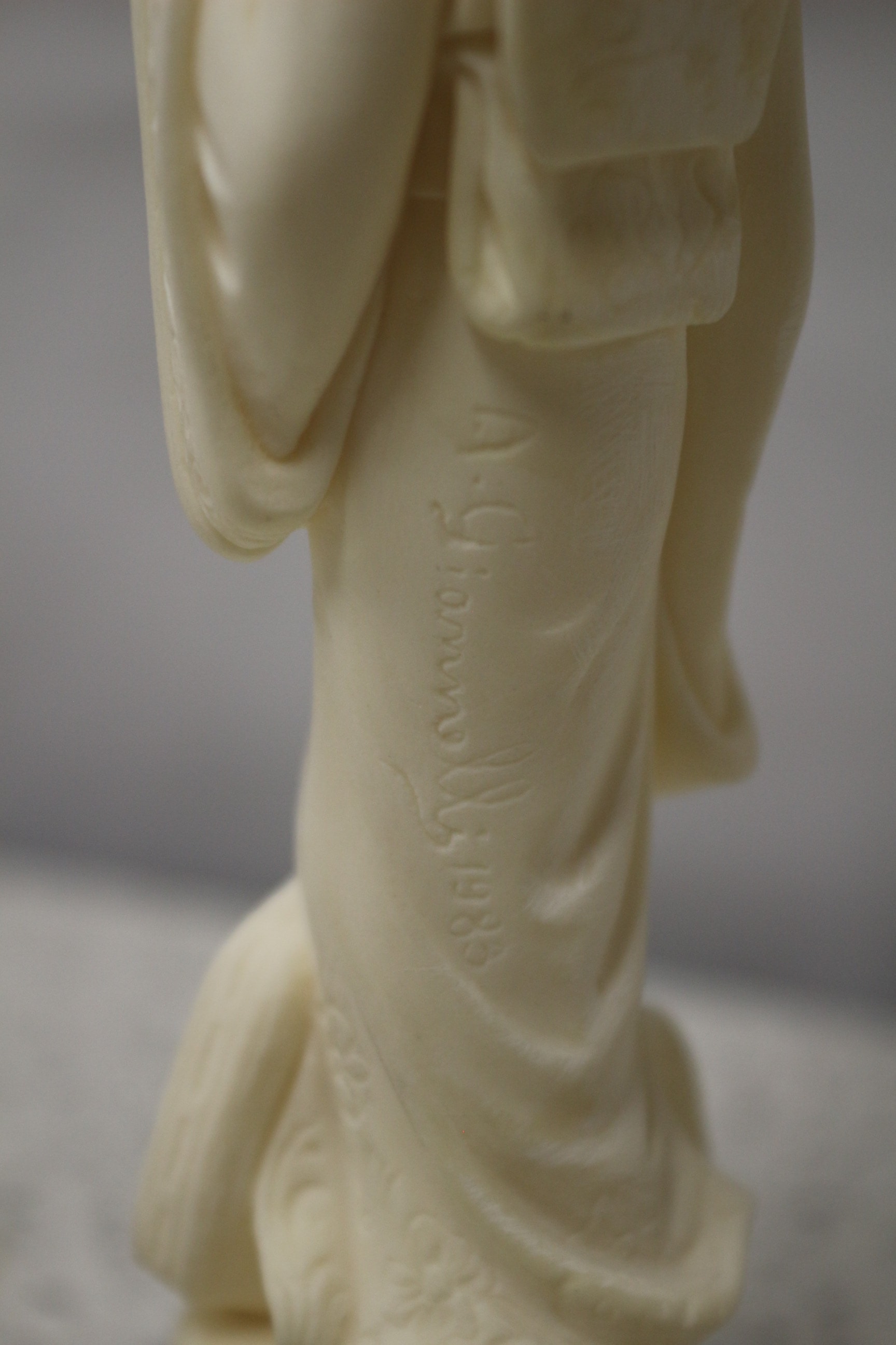 A pair of cream/ivory-white sculptures, comprising a female figurine holding a stringed instrument, inscribed “A. Giannelli 1985” on its back 14cm Tall, and a Whale sculpture.
