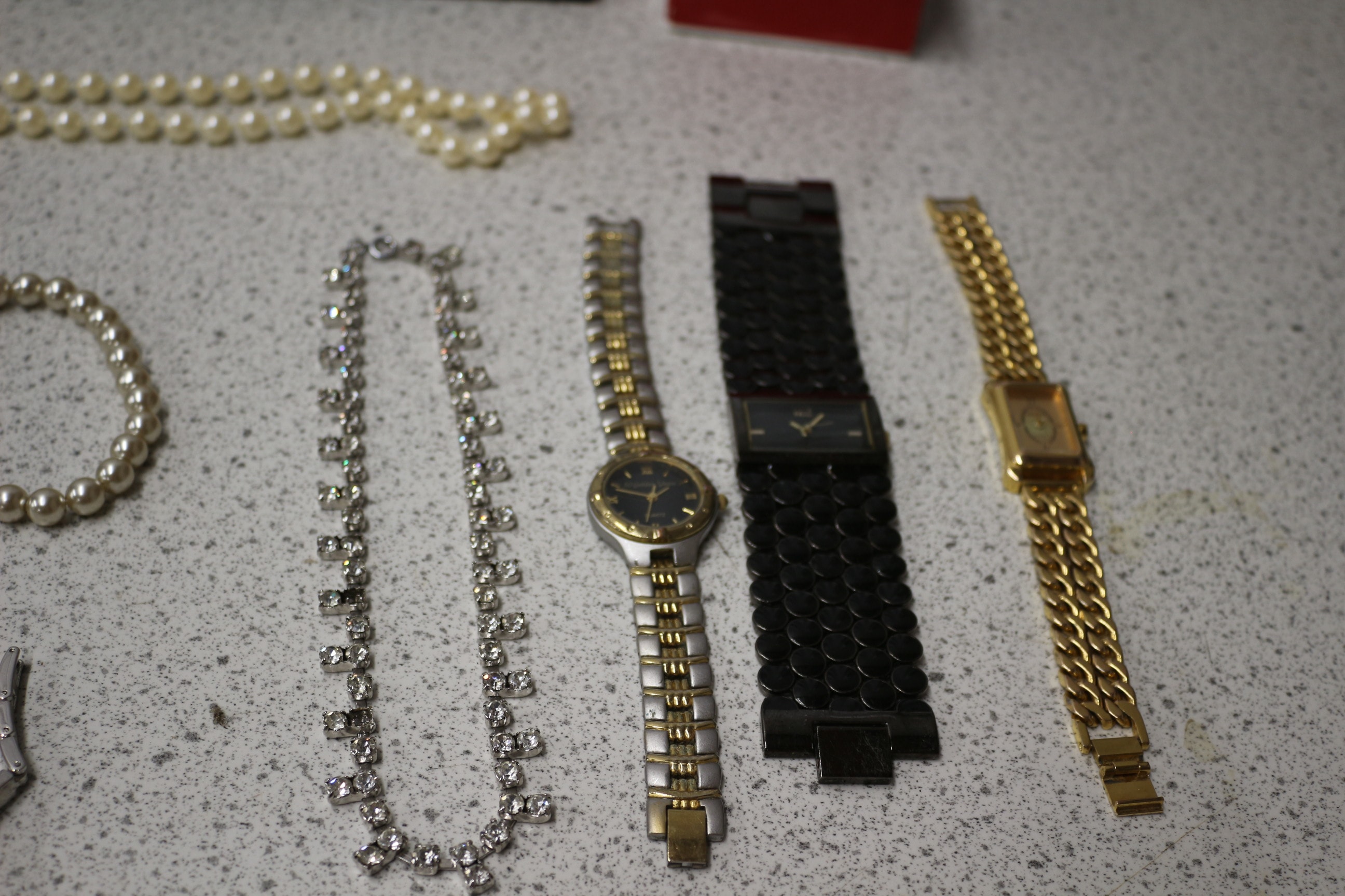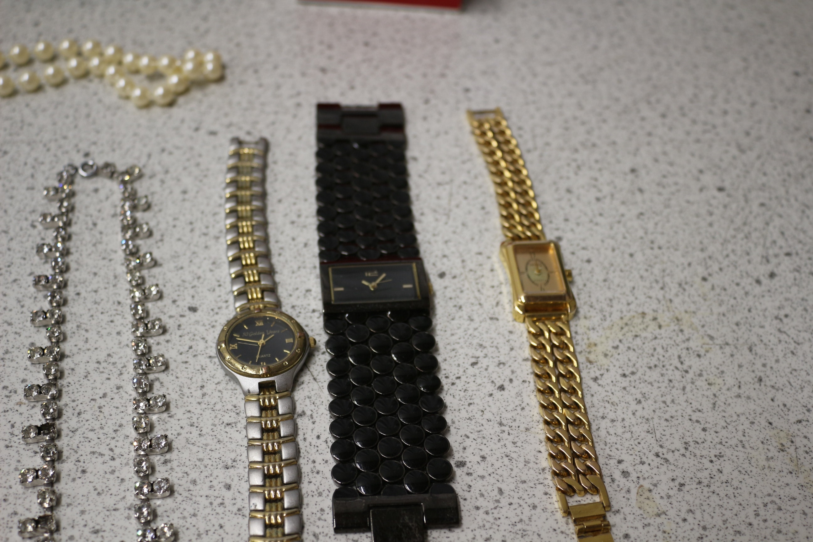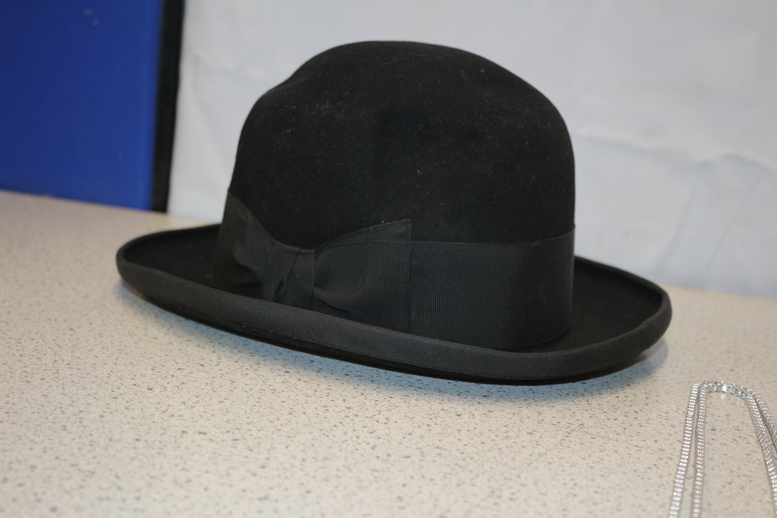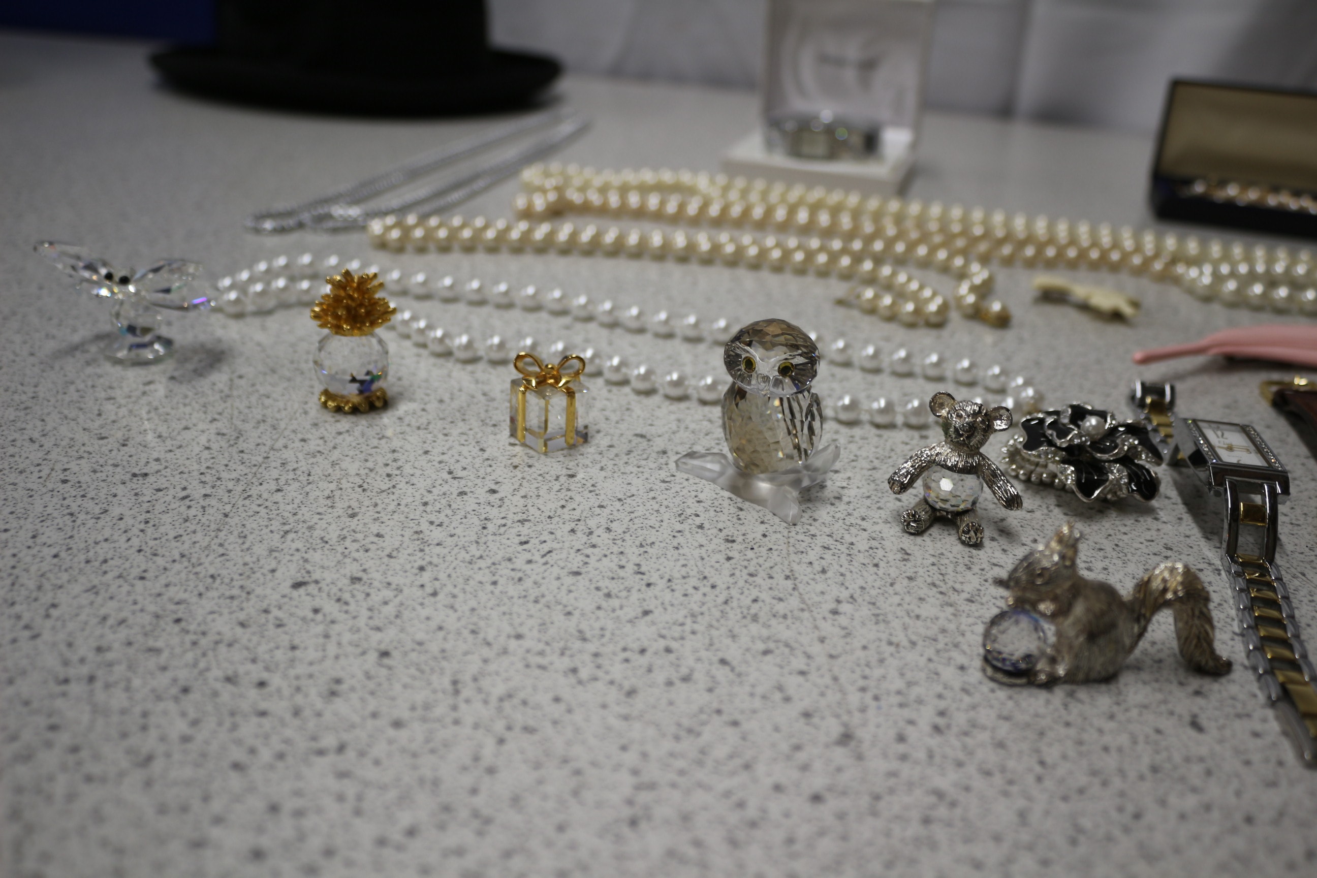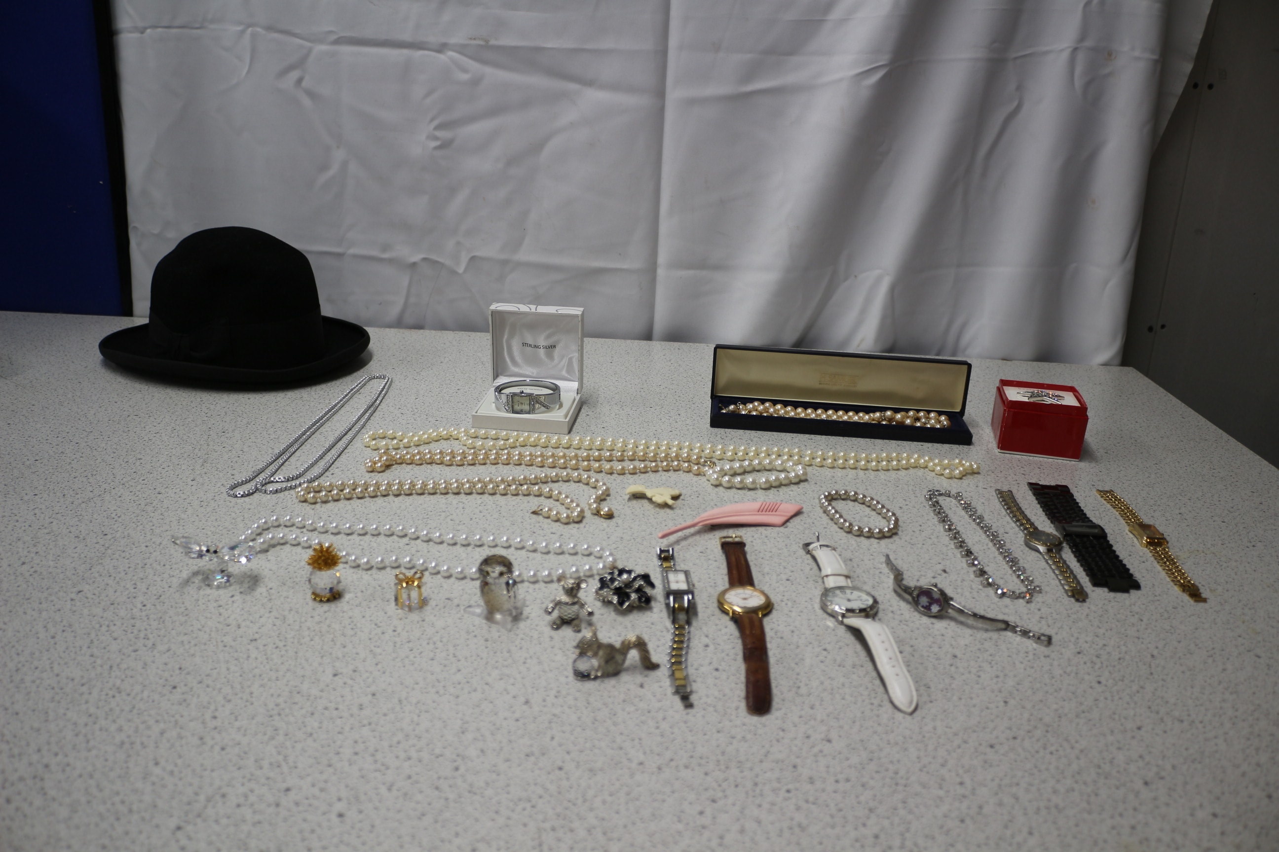 This lot includes one black bowler hat, wristwatches, necklaces, bracelets, two jewellery boxes, small decorative figurines and more.