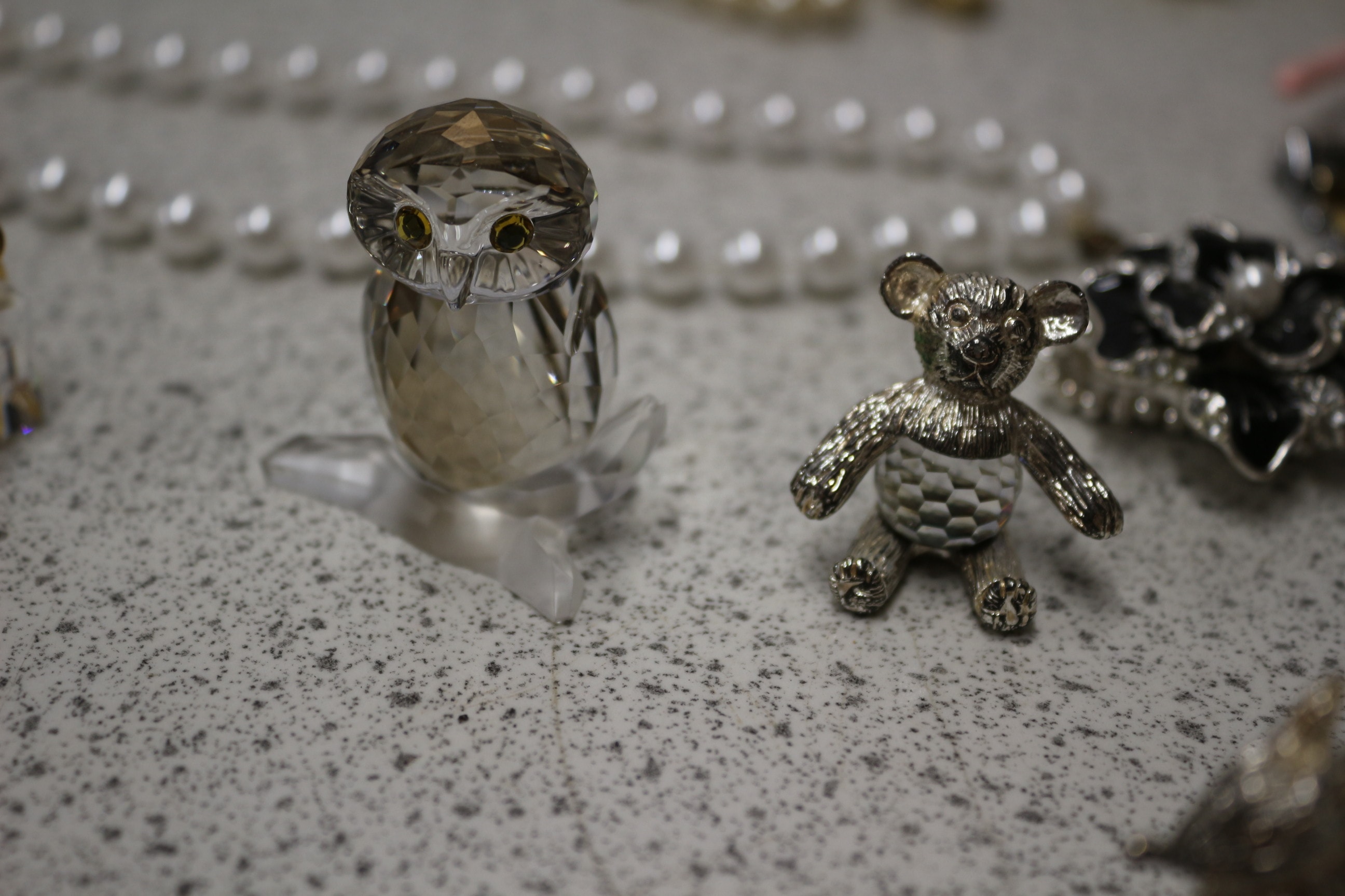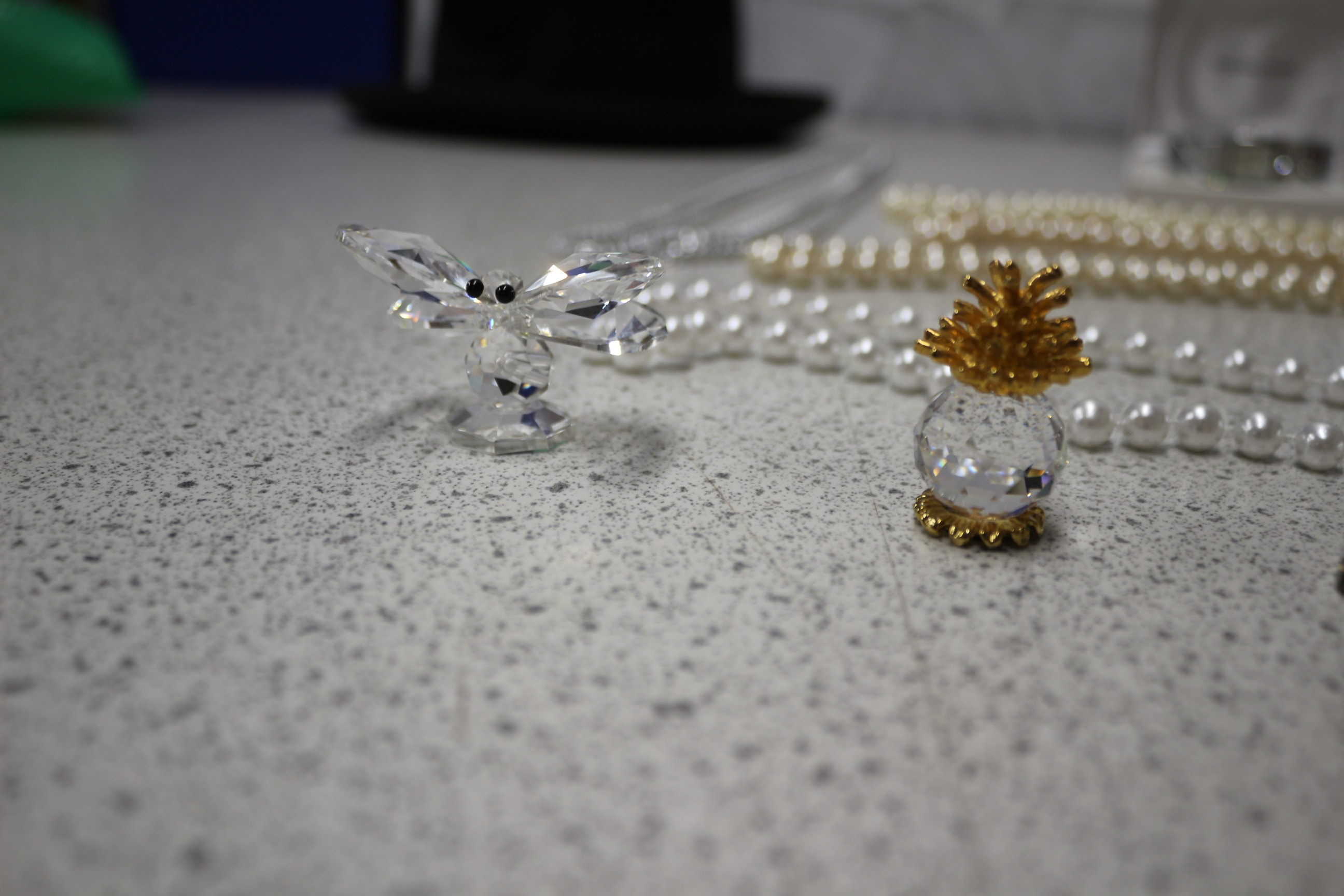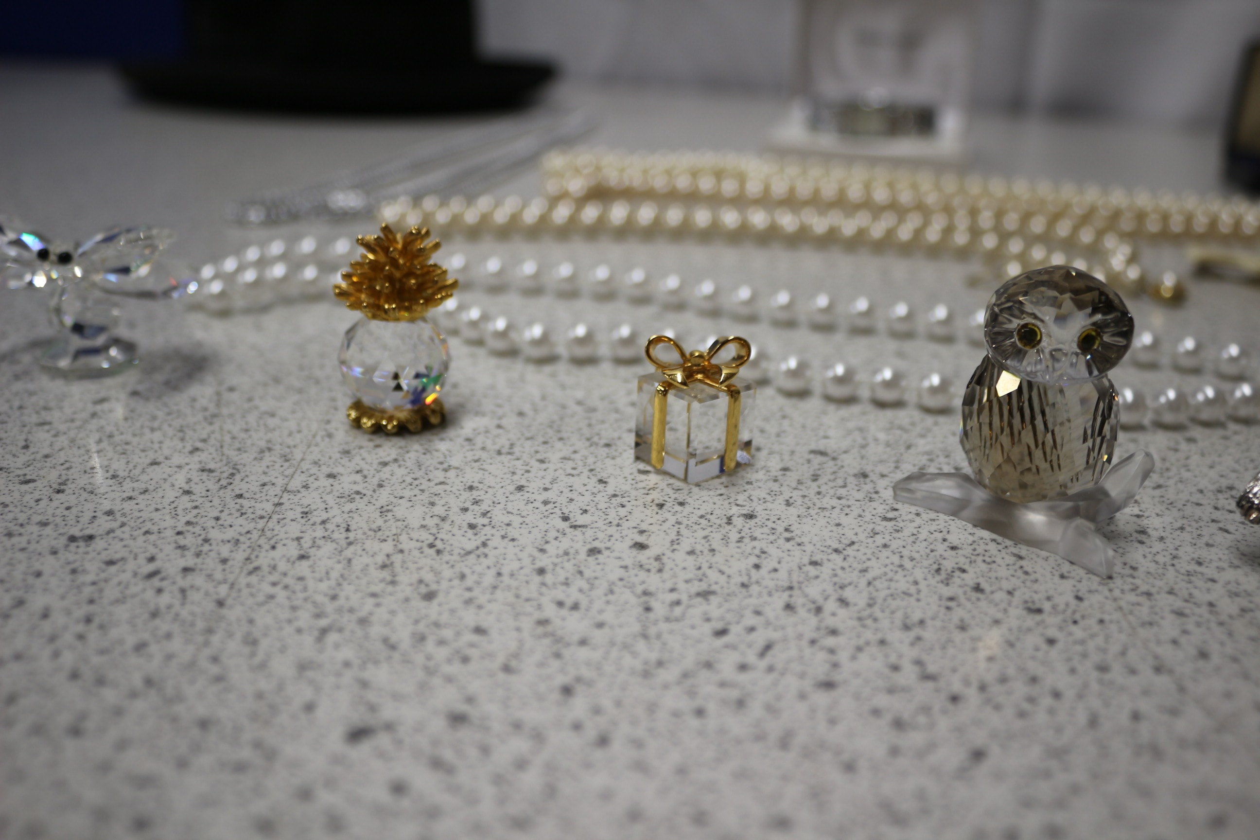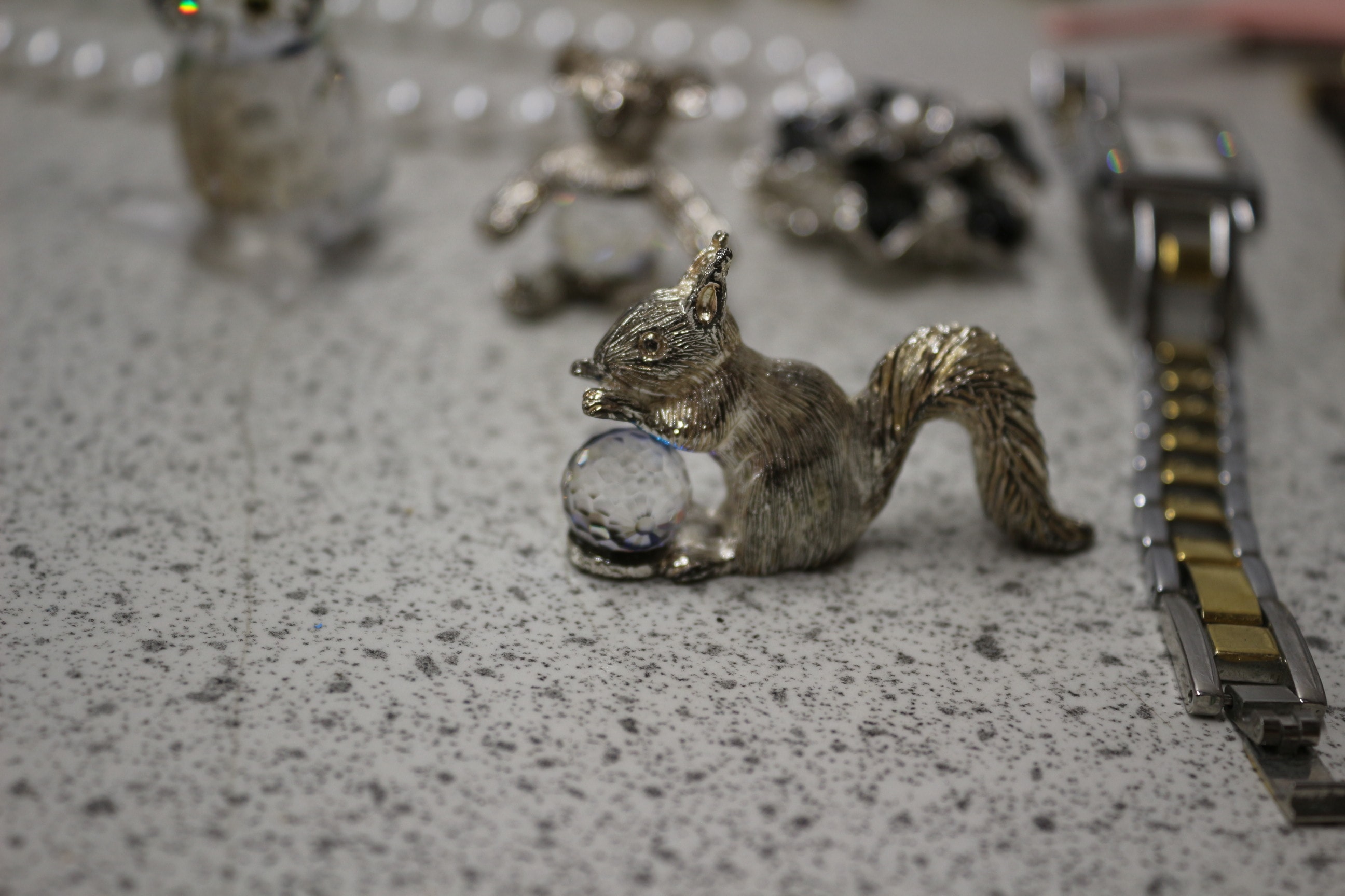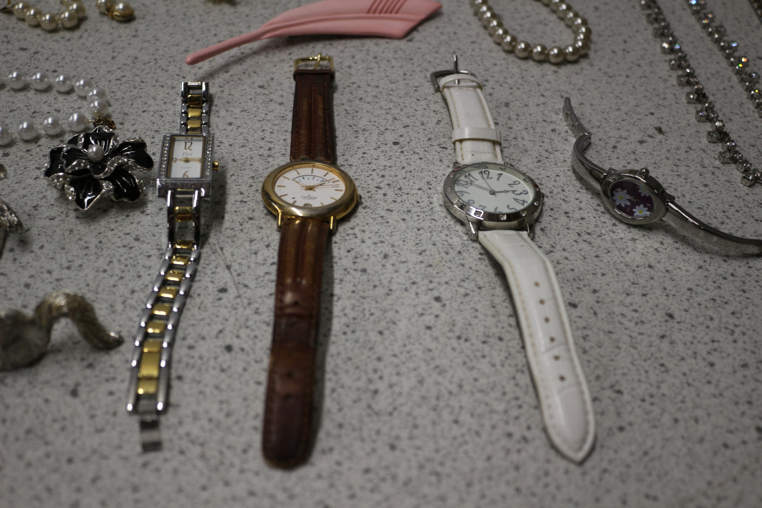 This lot includes one black bowler hat, wristwatches, necklaces, bracelets, two jewellery boxes, small decorative figurines and more.