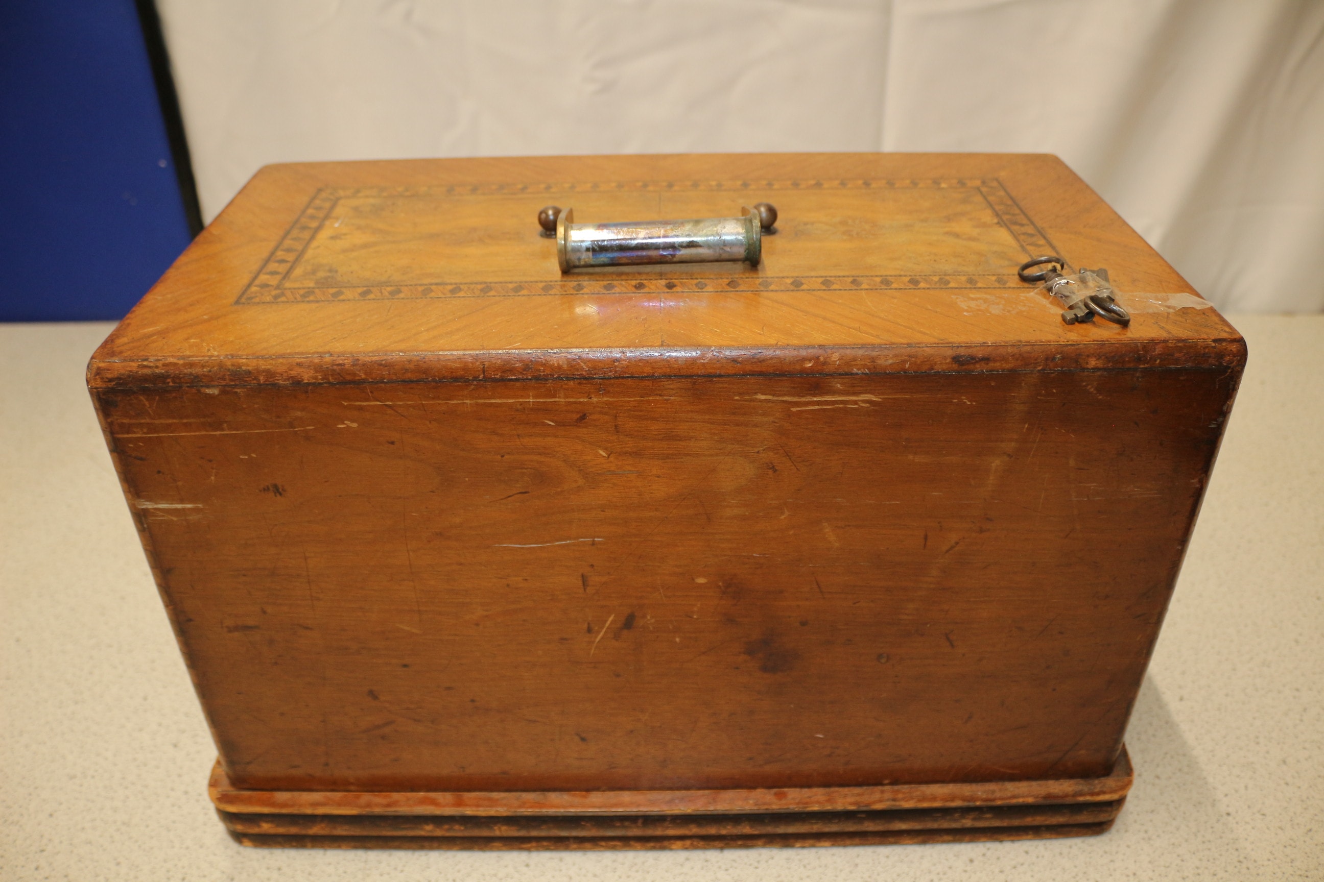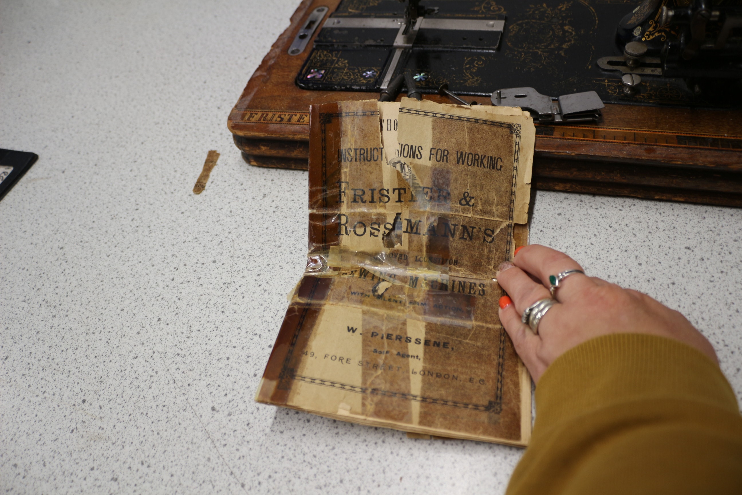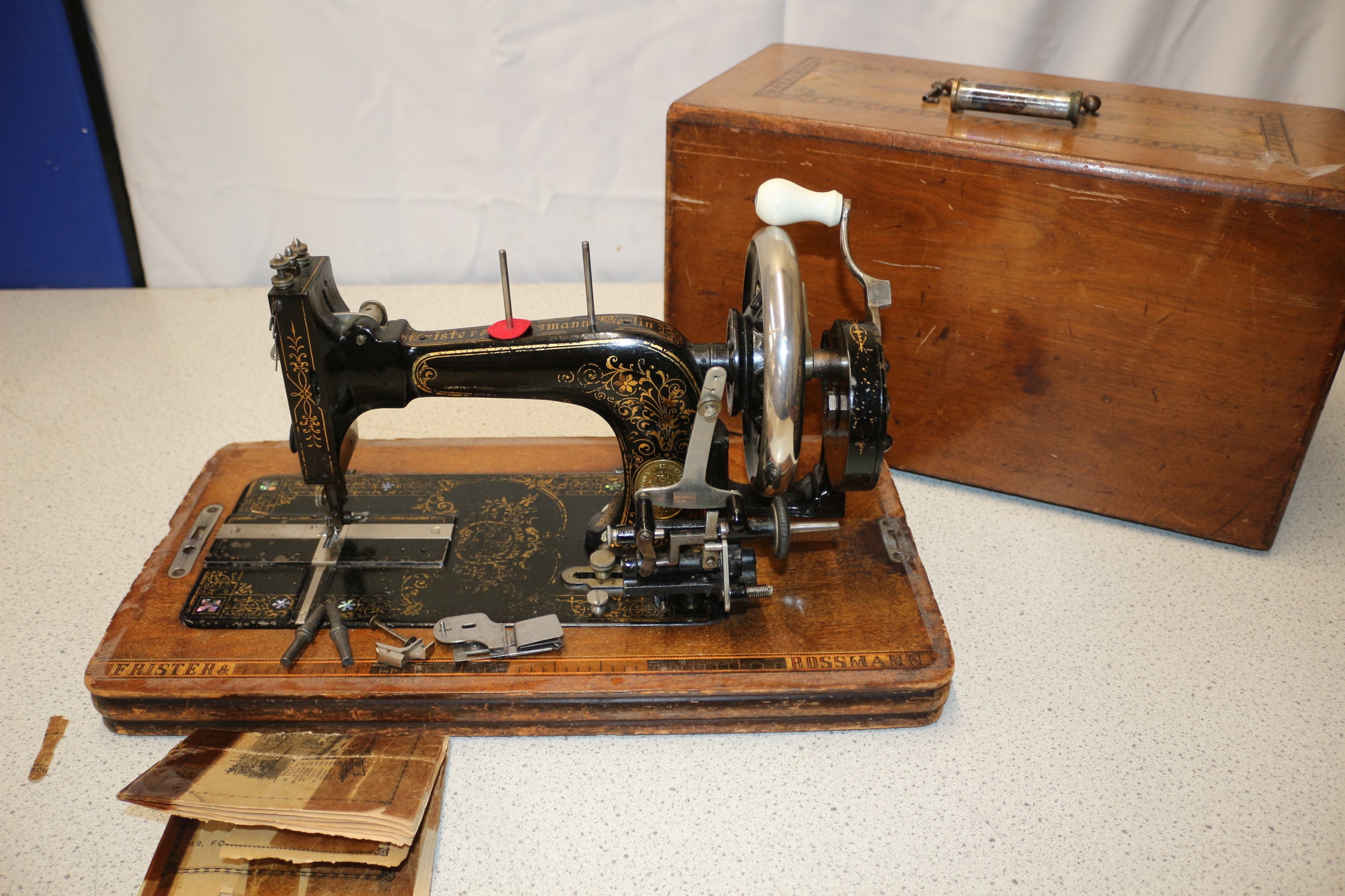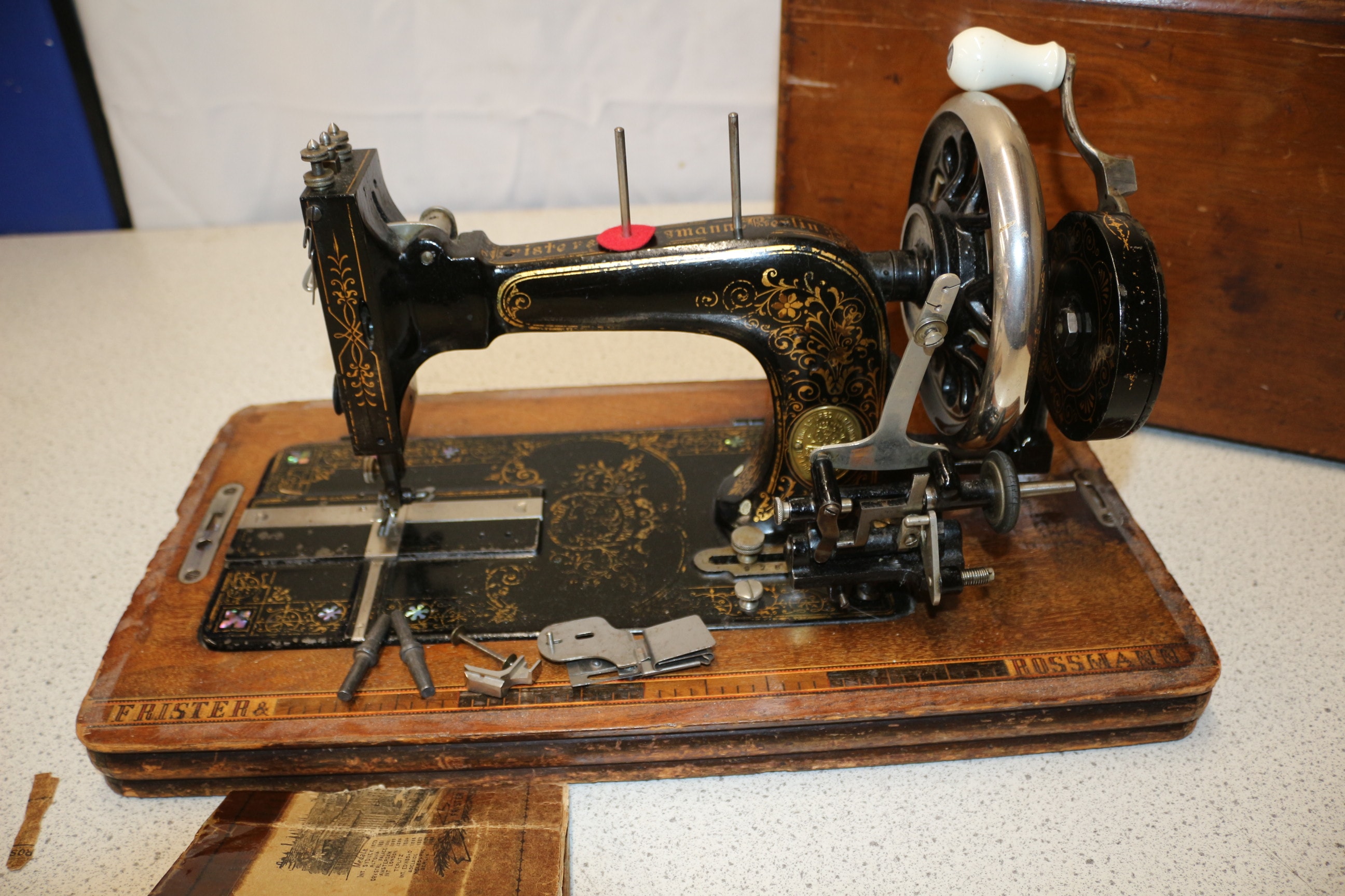 A vintage Frister & Rossmann hand-crank sewing machine, primarily black with gold filigree and silver-tone accents, set on a light brown wooden base, includes its matching wooden cover and instruction manual.