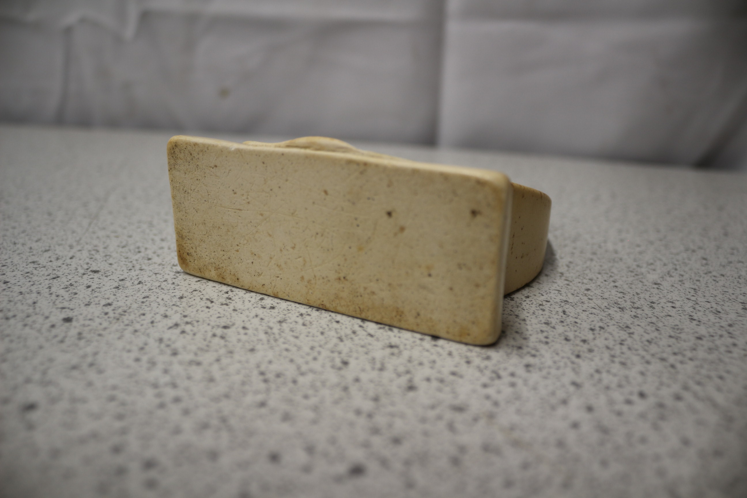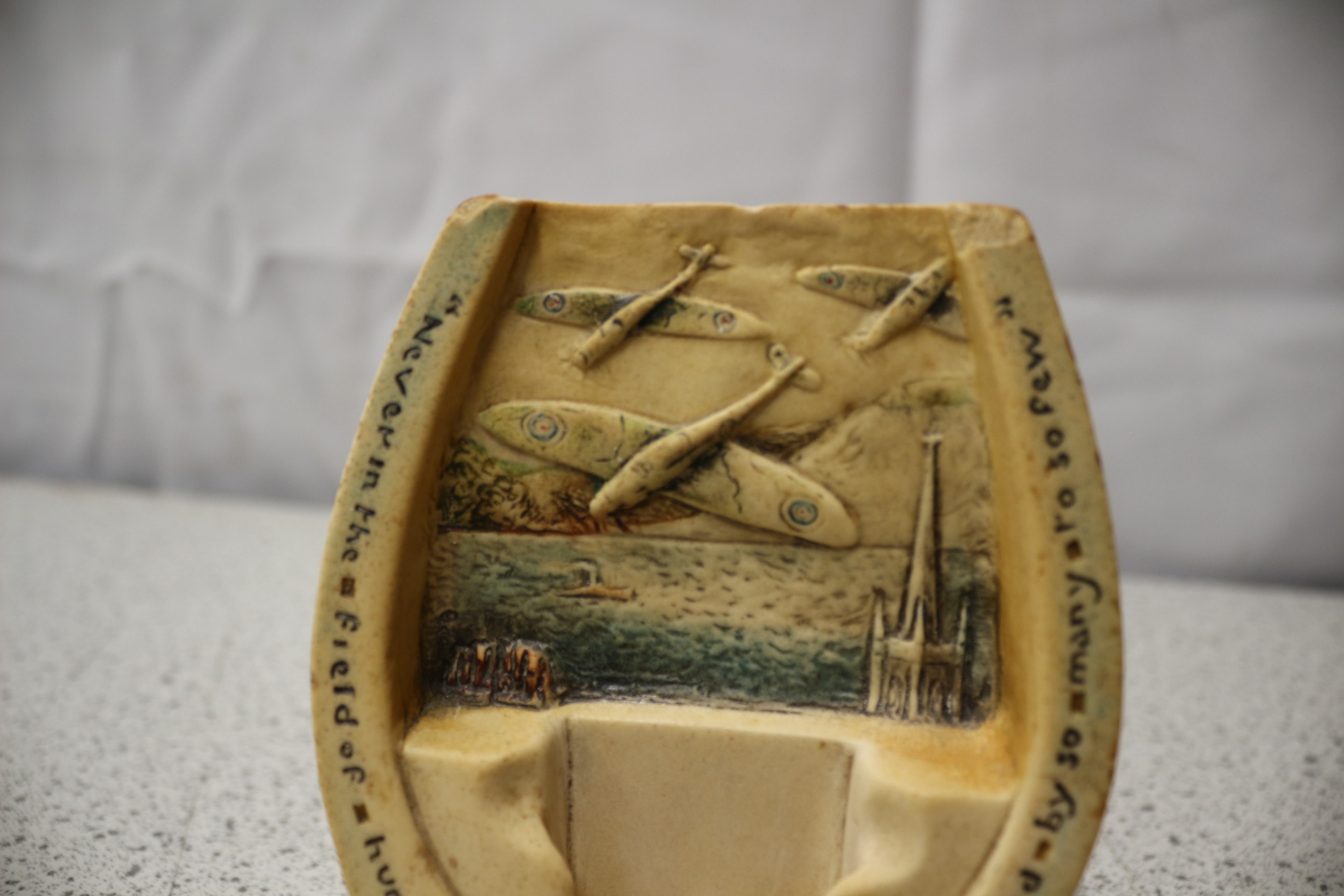 A very rare Osbourn Ivorex commemorative plaque, cream-coloured and molded from composition material, featuring a central oval-shaped recess. Within this recess, a detailed relief scene depicts four fighter aircraft, consistent with British WWII-era Spitfires or Hurricanes and bearing visible roundels, engaged in aerial combat above a landscape with water and a tall, Gothic-style spire, possibly representing a cathedral. Encircling this scene is the painted inscription: “Never in the field of human conflict was so much owed by so many to so few, ” a direct quote from Winston Churchill famously referencing the Battle of Britain. The item is inferred to be from the World War II period or shortly thereafter.