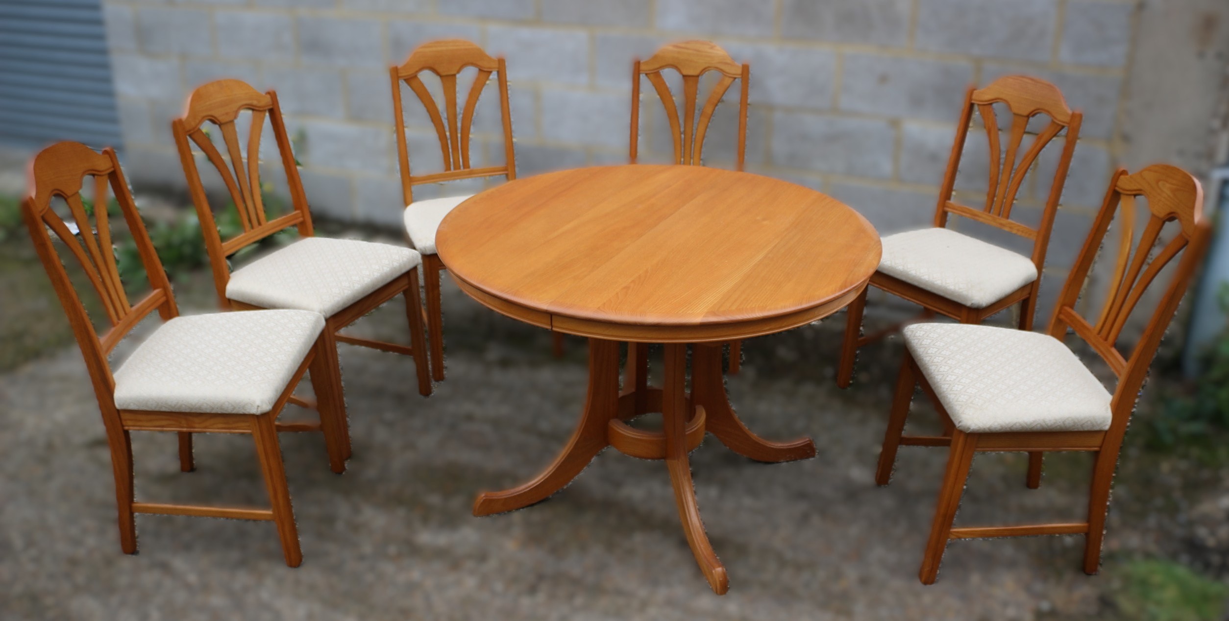 A seven-piece dining set by Jentique, comprising an extendable round-to-oval pedestal dining table and six matching chairs, crafted from teak with a visible grain. The chairs feature distinctive fan-back designs with multiple splats and upholstered seats in a cream-coloured fabric with a subtle geometric pattern. A label on the underside of the table reads “JENTIQUE CRAFTED WITH CARE.”