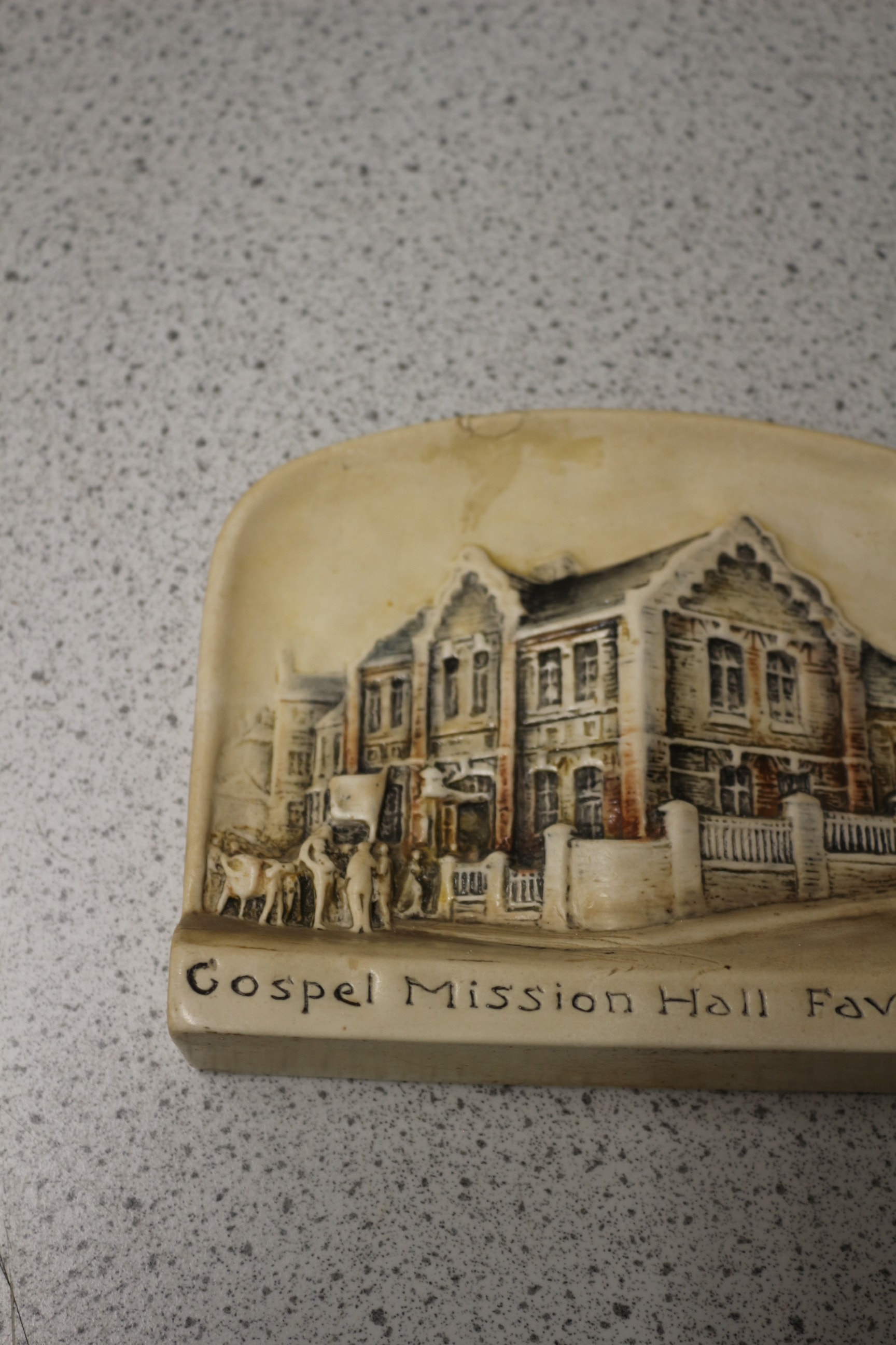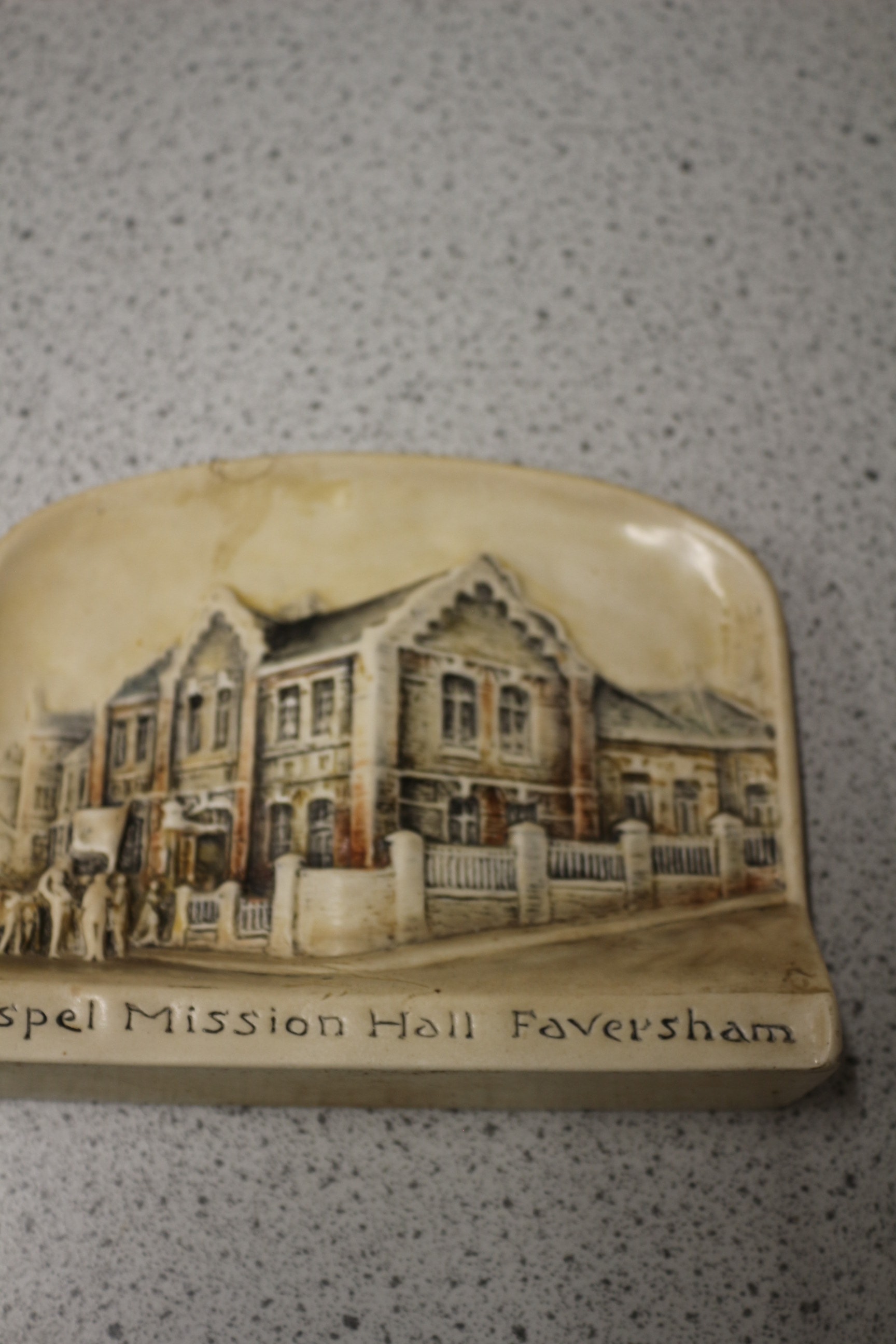 A 1950s Bossons Ivorex architectural relief plaque, depicting the ‘Gospel Mission Hall Faversham’ in a detailed scene, complete with a street scene featuring figures and a carriage. The plaque is hand-painted and made from a molded resin or plaster-like material, branded ‘IVOREX’ by ‘BOSSONS’ with ‘MADE IN ENGLAND’ on the reverse. It reflects late 19th or early 20th-century architecture, typical of commemorative souvenir items. 14.5×17.5cm