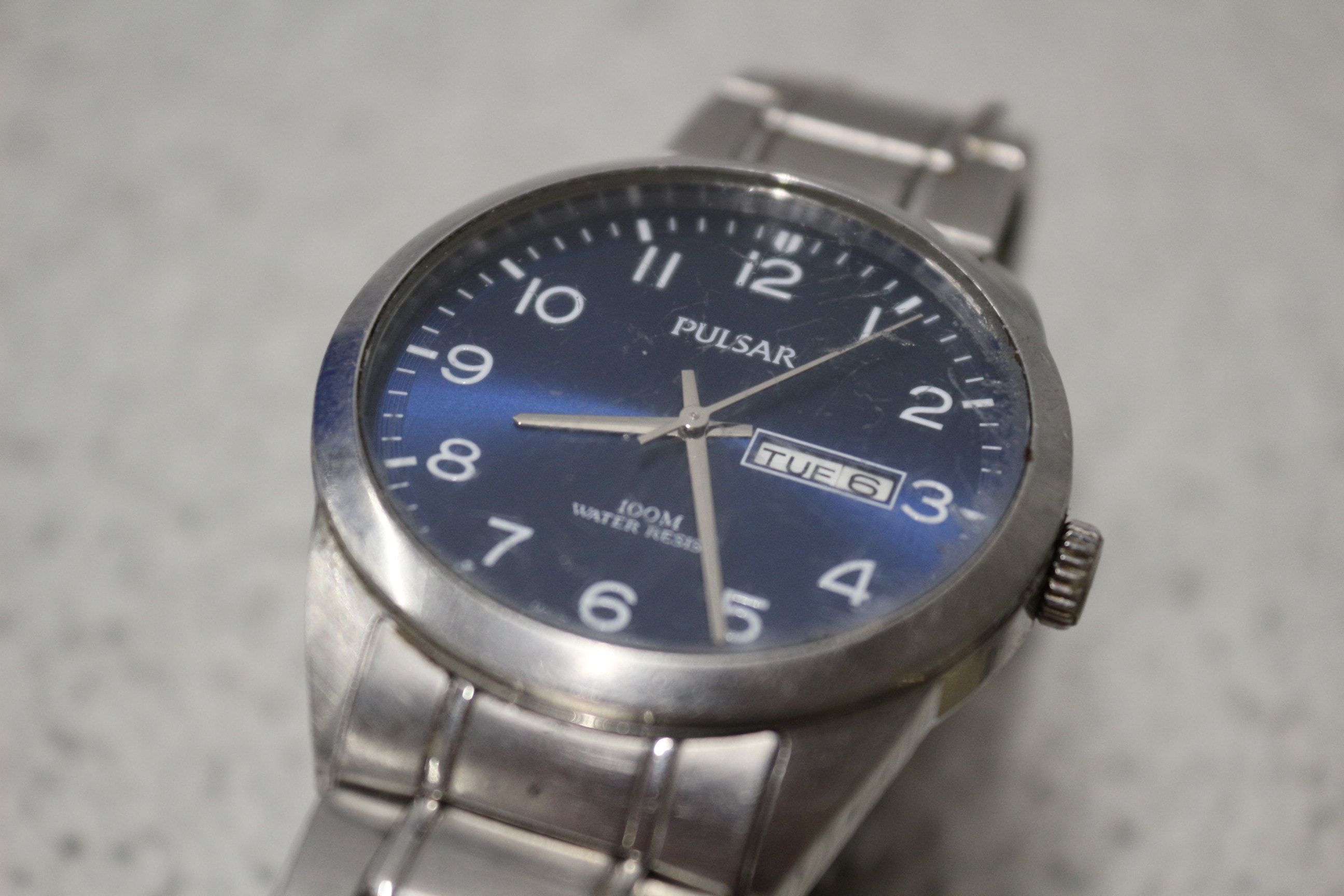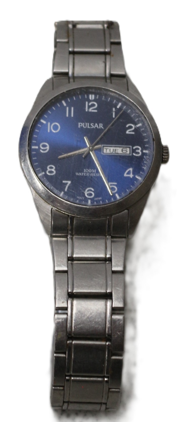 Lot 143: A Pair of Wristwatches: A Pulsar By Seiko VJ33-X022 Men's Blue Dial Day-Date Watch and a Pelex Gold-Tone Quartz Wristwatch