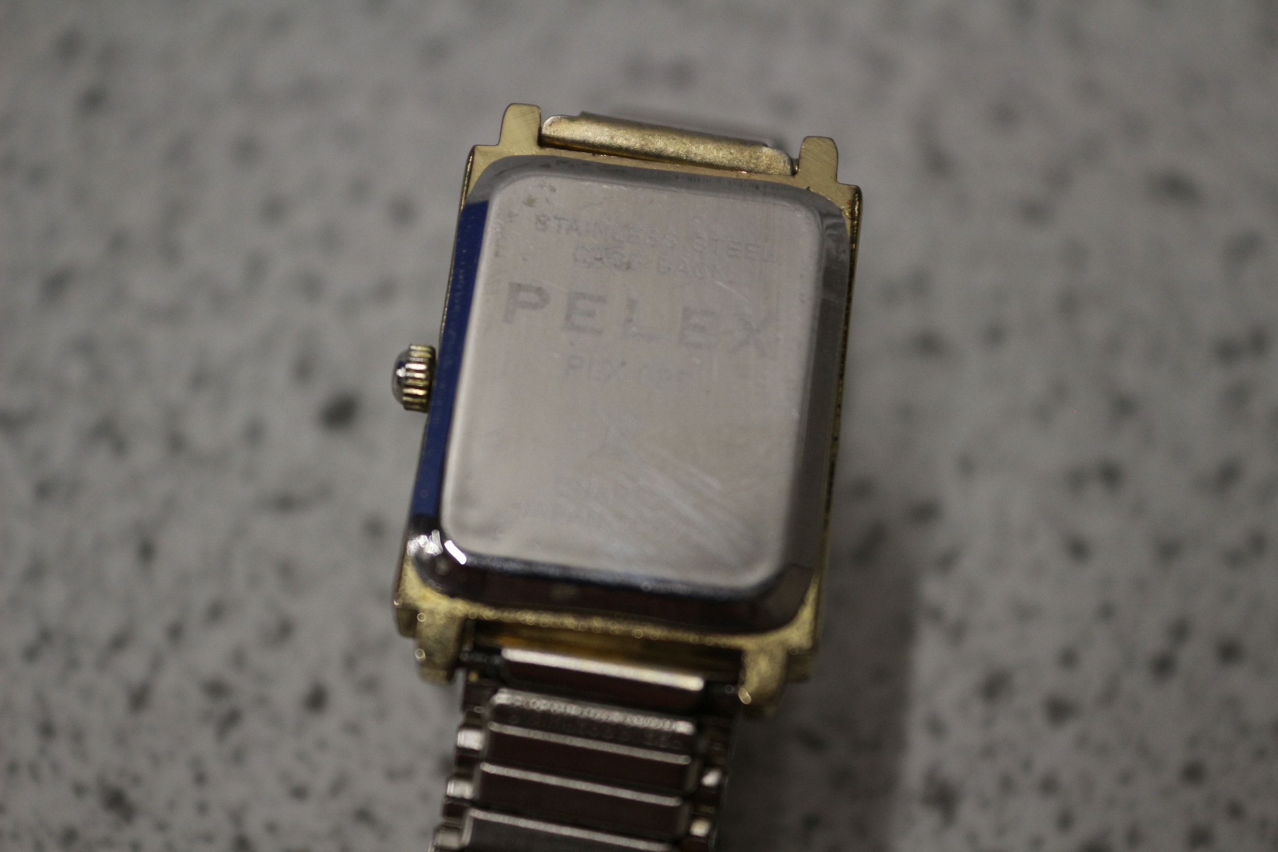 The lot comprises two contemporary analog wristwatches. The first is a Pulsar By Seiko VJ33-X022 men’s-style timepiece, featuring a round, brushed stainless steel case and integrated link bracelet. It has a blue dial with white Arabic numerals, a day/date window displaying “TUE 6”, and is marked “PULSAR”, “100M WATER RESIST”, and “MOV’T JAPAN”. The case back is marked “ST. STEEL”, “10BAR WATER RESISTANT”, “PULSAR”, “840273”, “MOVEMENT JAPAN”, and “V133-X022”. The second watch is a smaller, rectangular-cased Pelex, likely a ladies’ model, with a gold-tone finish and a two-tone flexible expansion bracelet. It features a white dial with black Arabic numerals and is marked “PELEX”, “QUARTZ”, and “MOV’T JAPAN”. Its case back reads “STAINLESS STEEL CASE BACK”, “PELEX”, and “PLX 105 / 205”.
