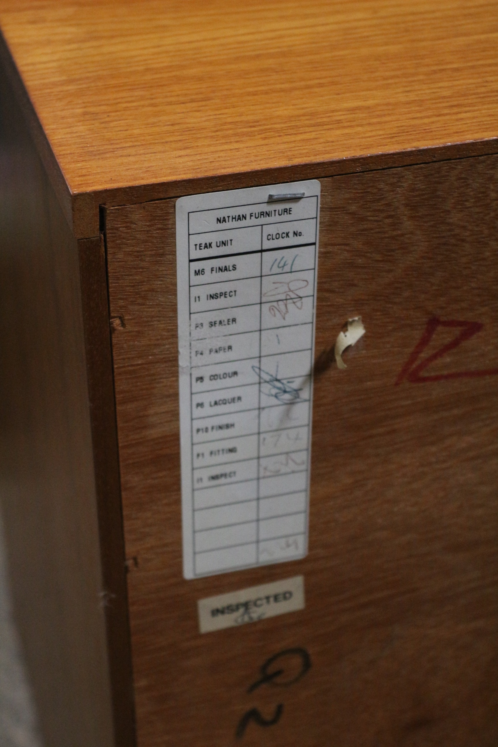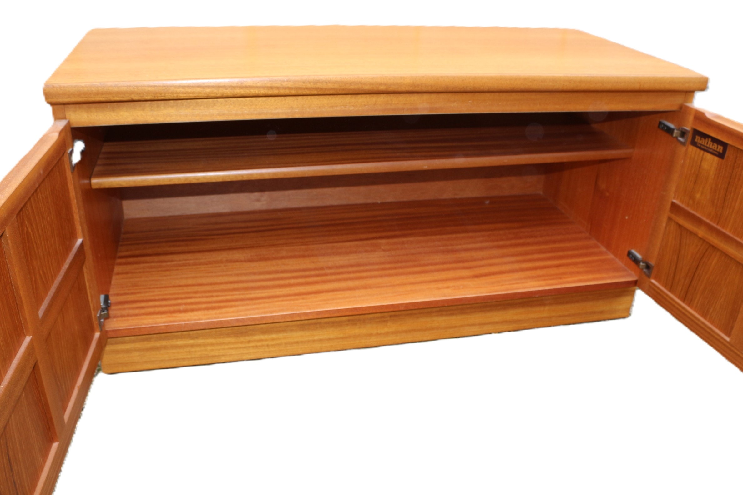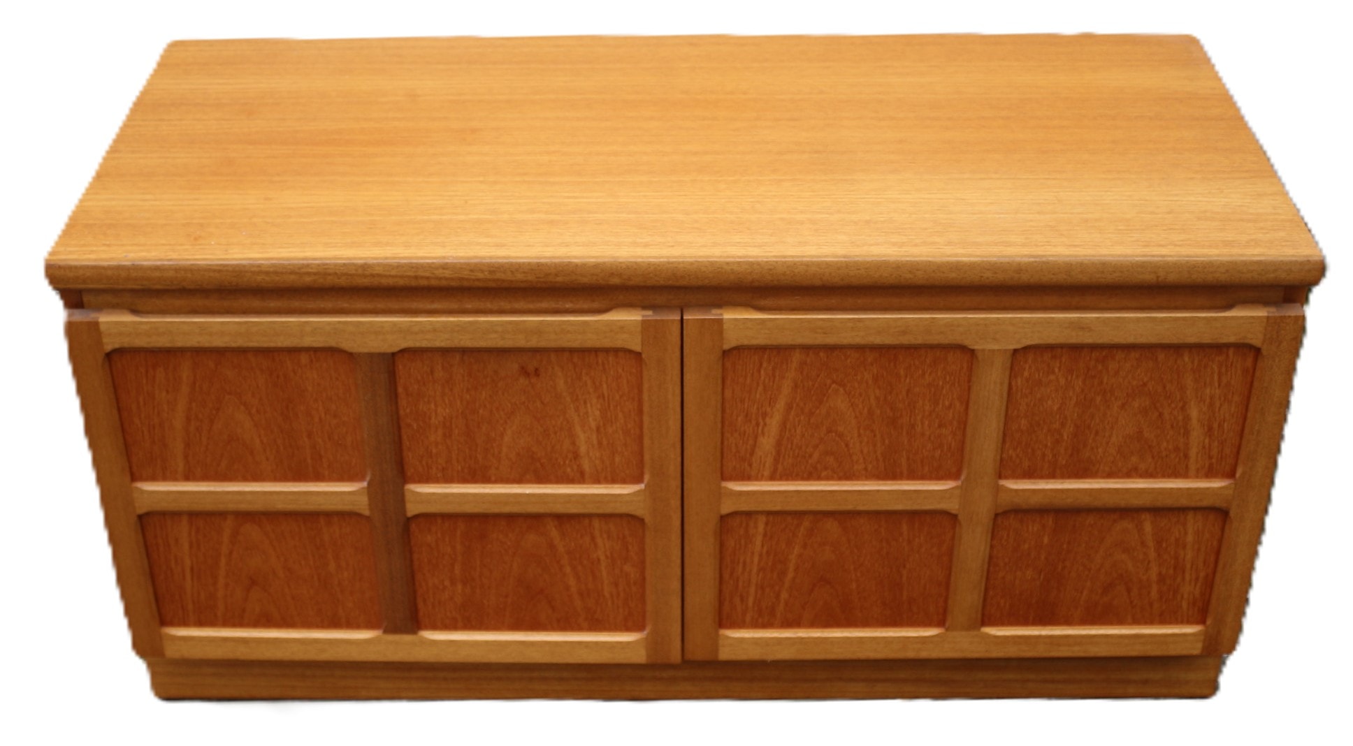 A Mid-Century Modern Nathan Parker Knoll ‘Squares’ teak cabinet, likely dating from the mid-20th century. This rectangular, low-profile sideboard is constructed of teak wood, presenting a warm reddish-brown finish. It features a clean-lined design with a flat top and a flush plinth base. The front is composed of two hinged doors, each adorned with recessed panels arranged in a grid pattern, characteristic of the ‘Squares’ design. The interior reveals two compartments, each containing a single fixed shelf. Visible markings include a “Nathan The master craftsmen.” label on the interior of the right door and a production sticker on the back panel confirming “NATHAN FURNITURE” and identifying it as a “TEAK UNIT, ” accompanied by various handwritten manufacturing and inspection notations. 102.5x46x51cm