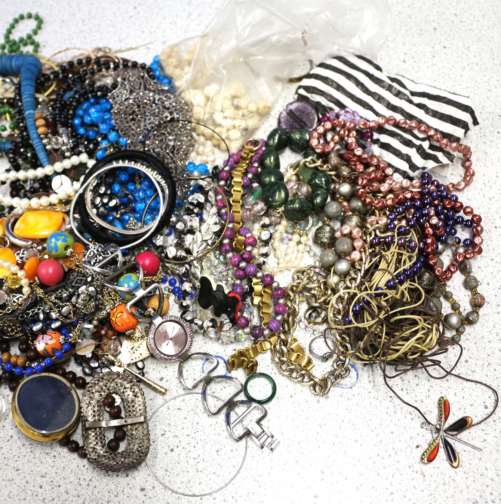 This lot comprises a substantial collection of assorted costume jewellery, primarily consisting of necklaces, bracelets, rings, and pendants, along with loose components and a dragonfly brooch. The items exhibit a wide variety of styles, suggesting a mixed period accumulation likely spanning from vintage to contemporary designs. Materials observed include various base metals in gold and silver tones, a diverse array of beads (glass, plastic, faux pearls, wood, shell, and possibly some semi-precious stones), and other elements such as enamel and resin. No distinct manufacturer’s marks or legible text are visible.