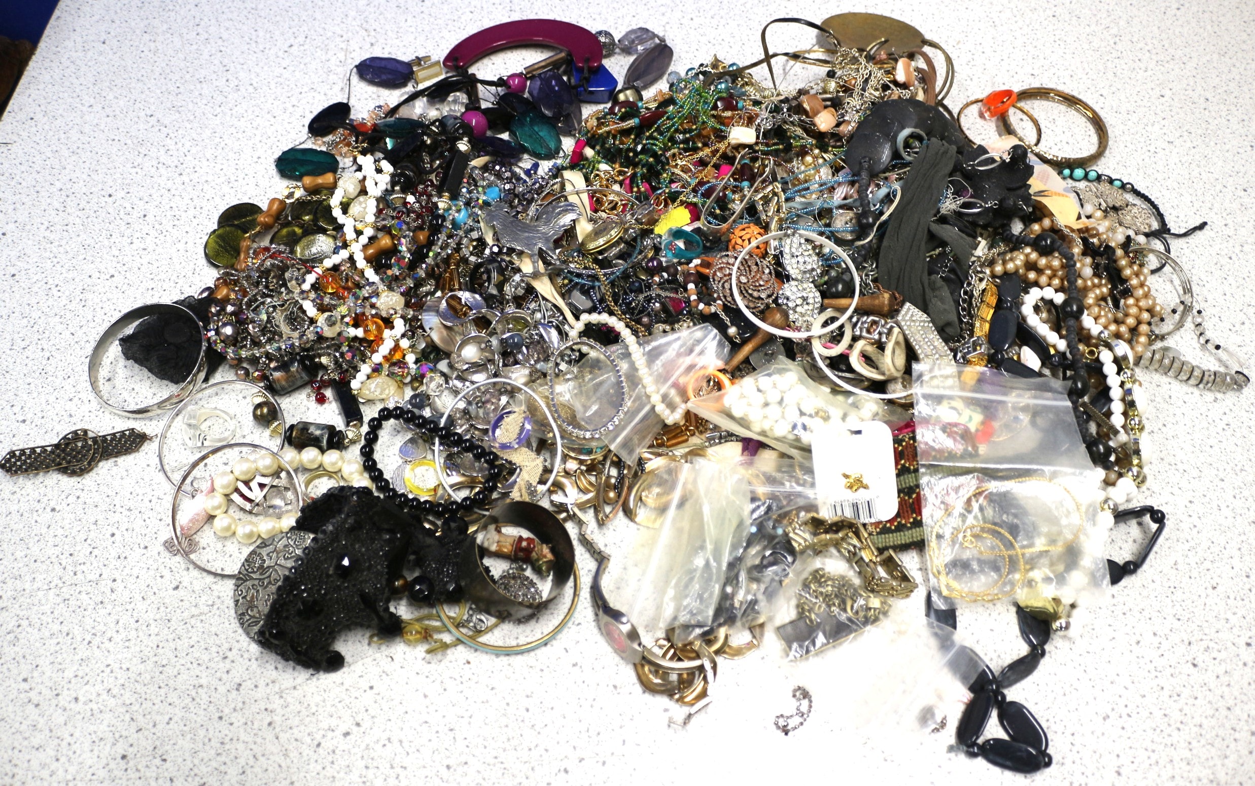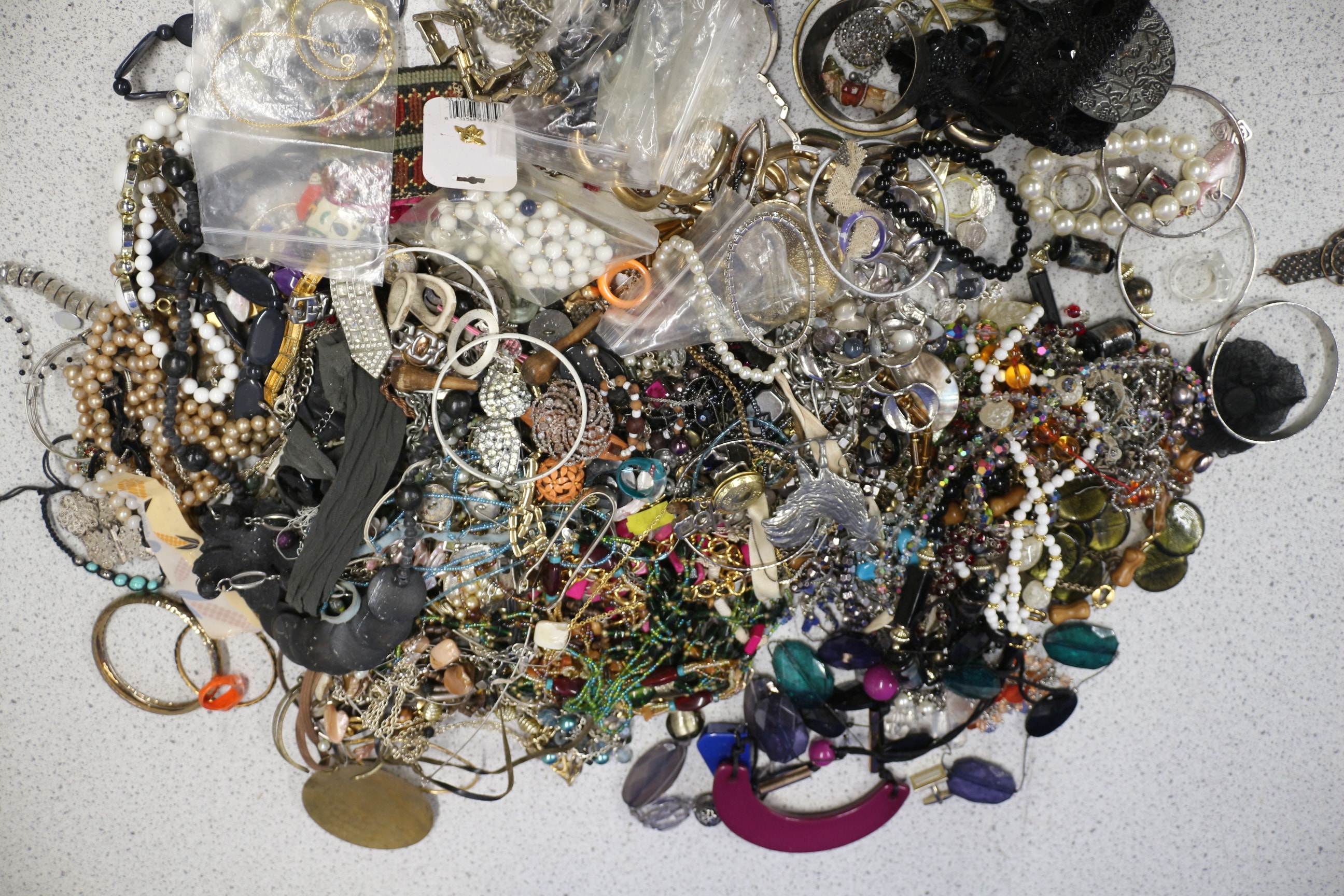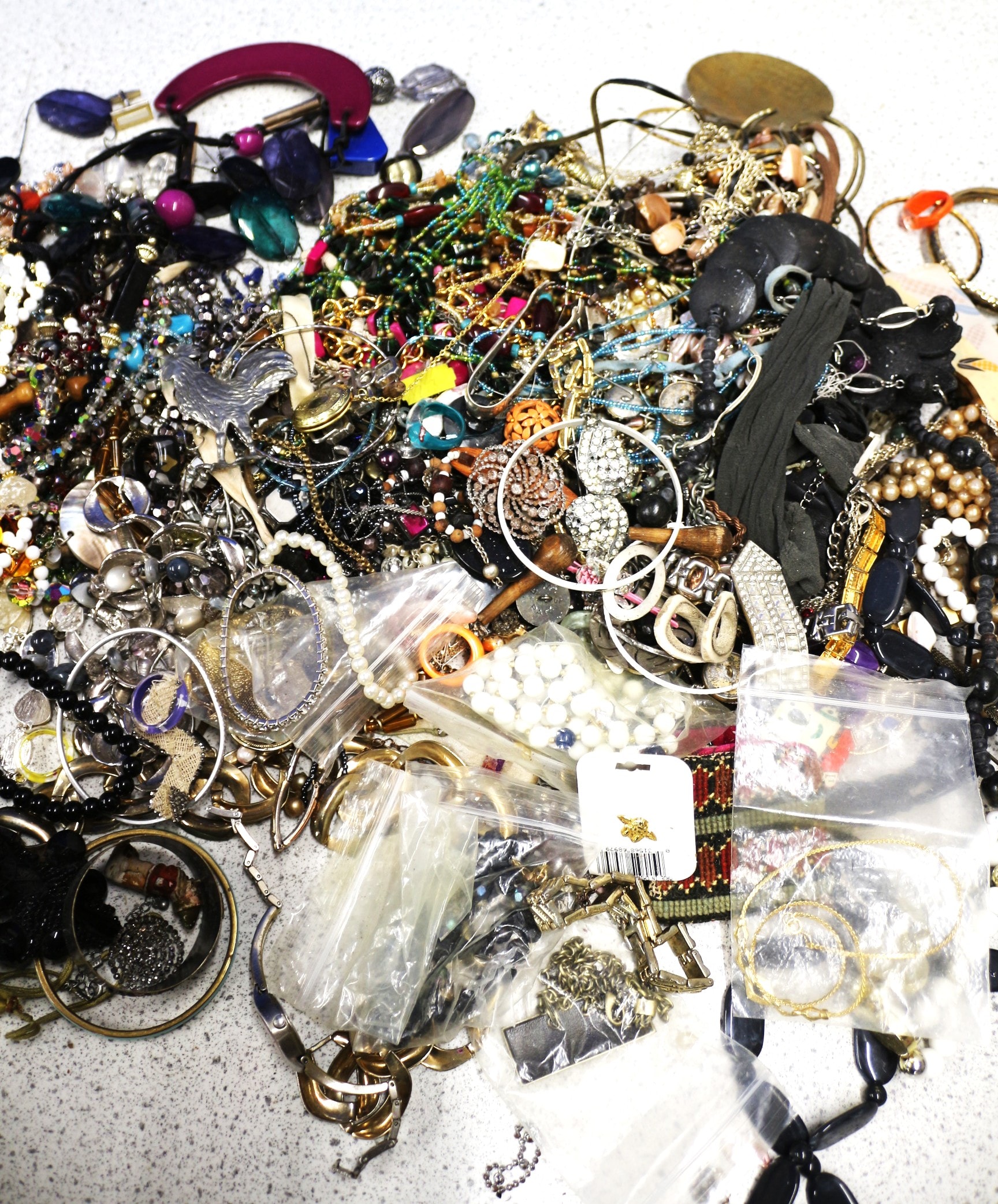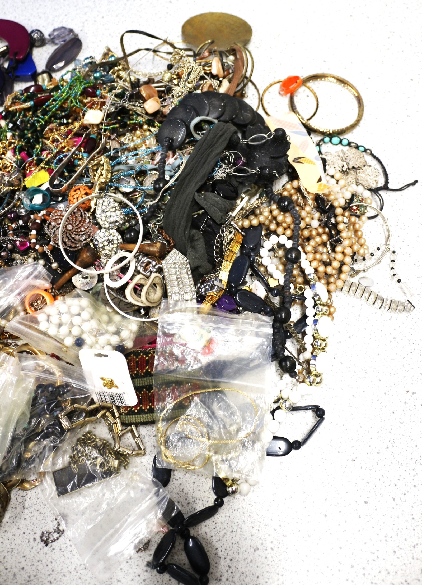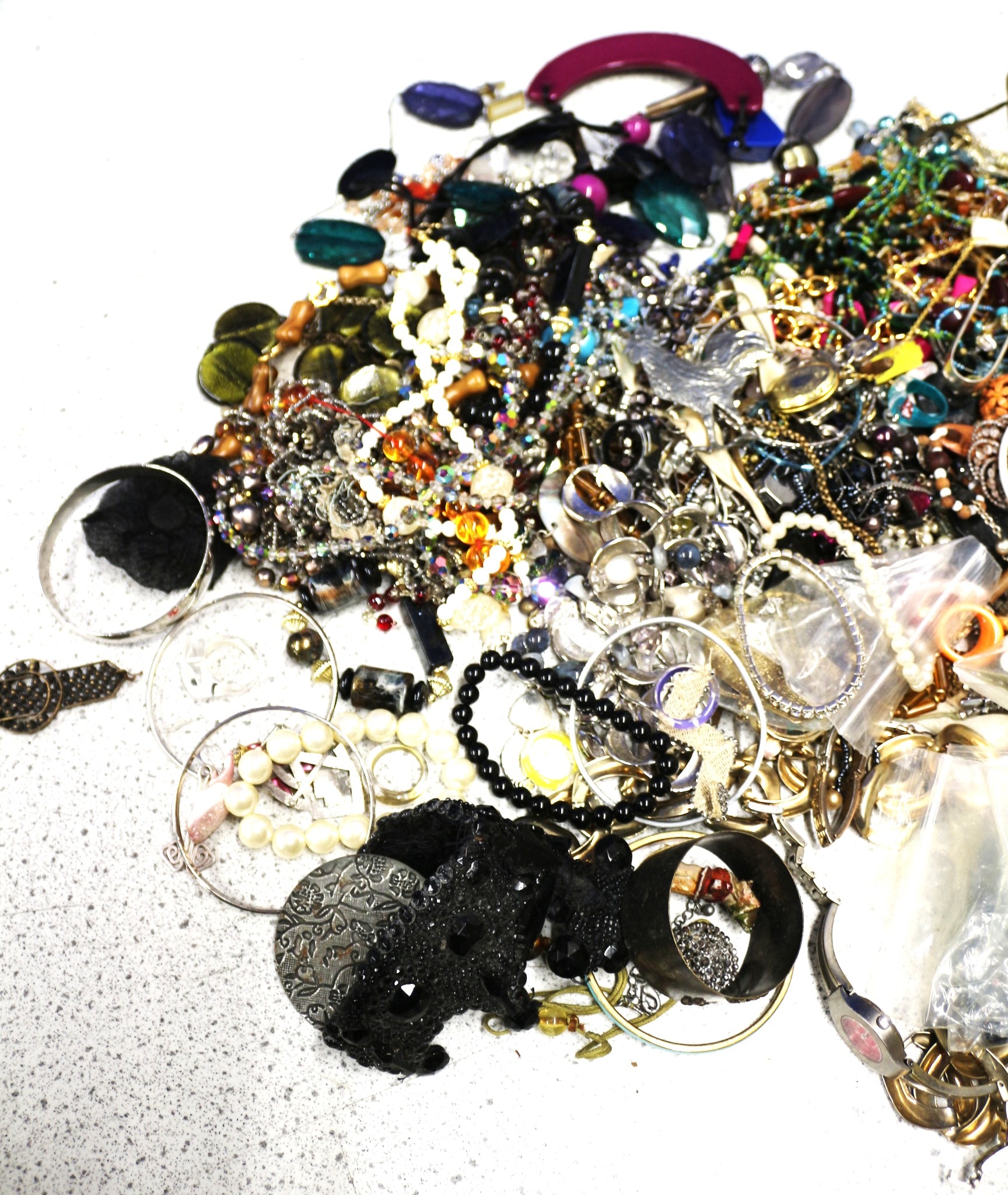 A large, assorted lot of primarily costume jewellery and fashion accessories, presented as a jumbled pile. The collection includes a wide variety of items such as necklaces, bracelets (including bangles and beaded), rings, earrings, and brooches, displaying diverse styles from contemporary to potentially vintage-inspired designs. Observed materials include various base metals (gold-tone, silver-tone), glass and plastic beads, faux pearls, rhinestones, and acrylic/resin elements. While no specific period is uniformly identifiable, the collection appears to span multiple decades, primarily 20th and 21st-century mass-produced jewellery. Some items are contained in small plastic bags.