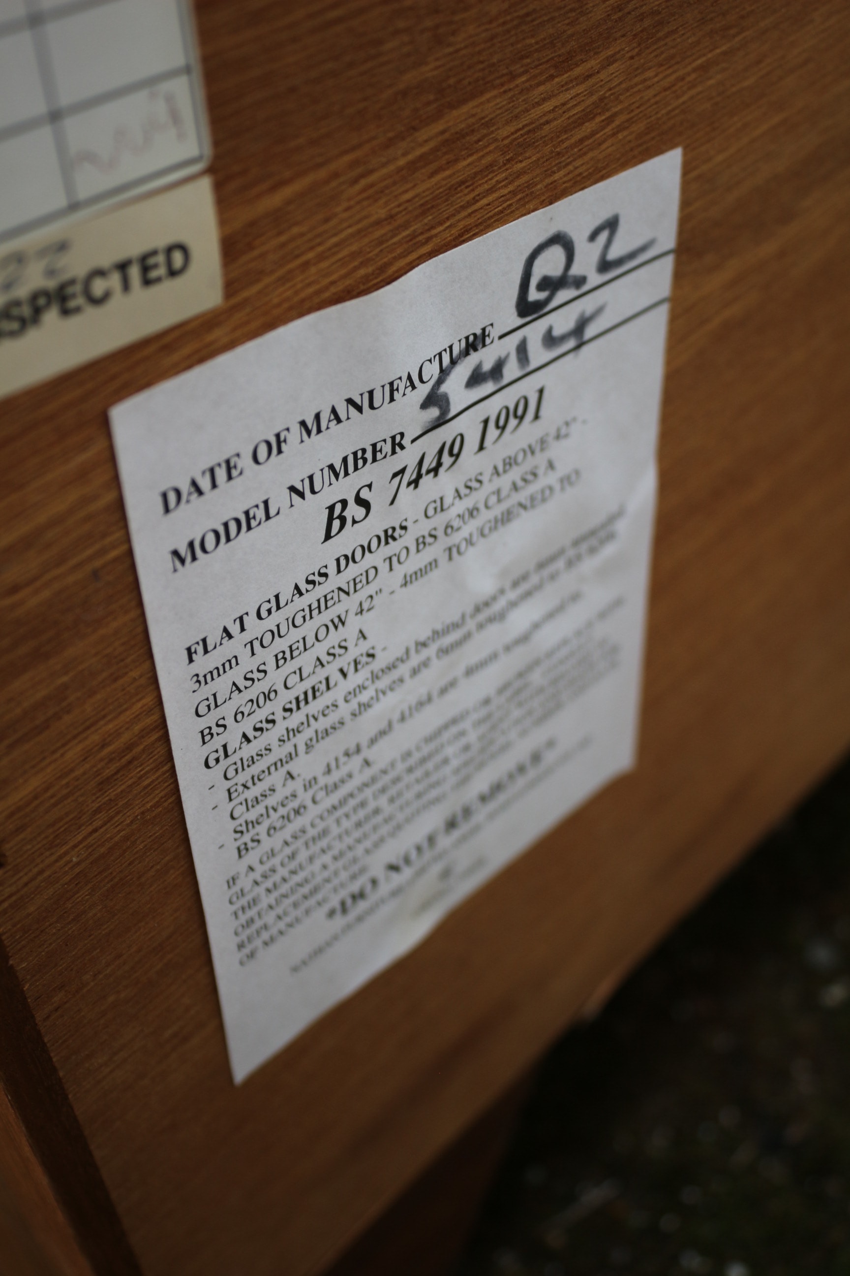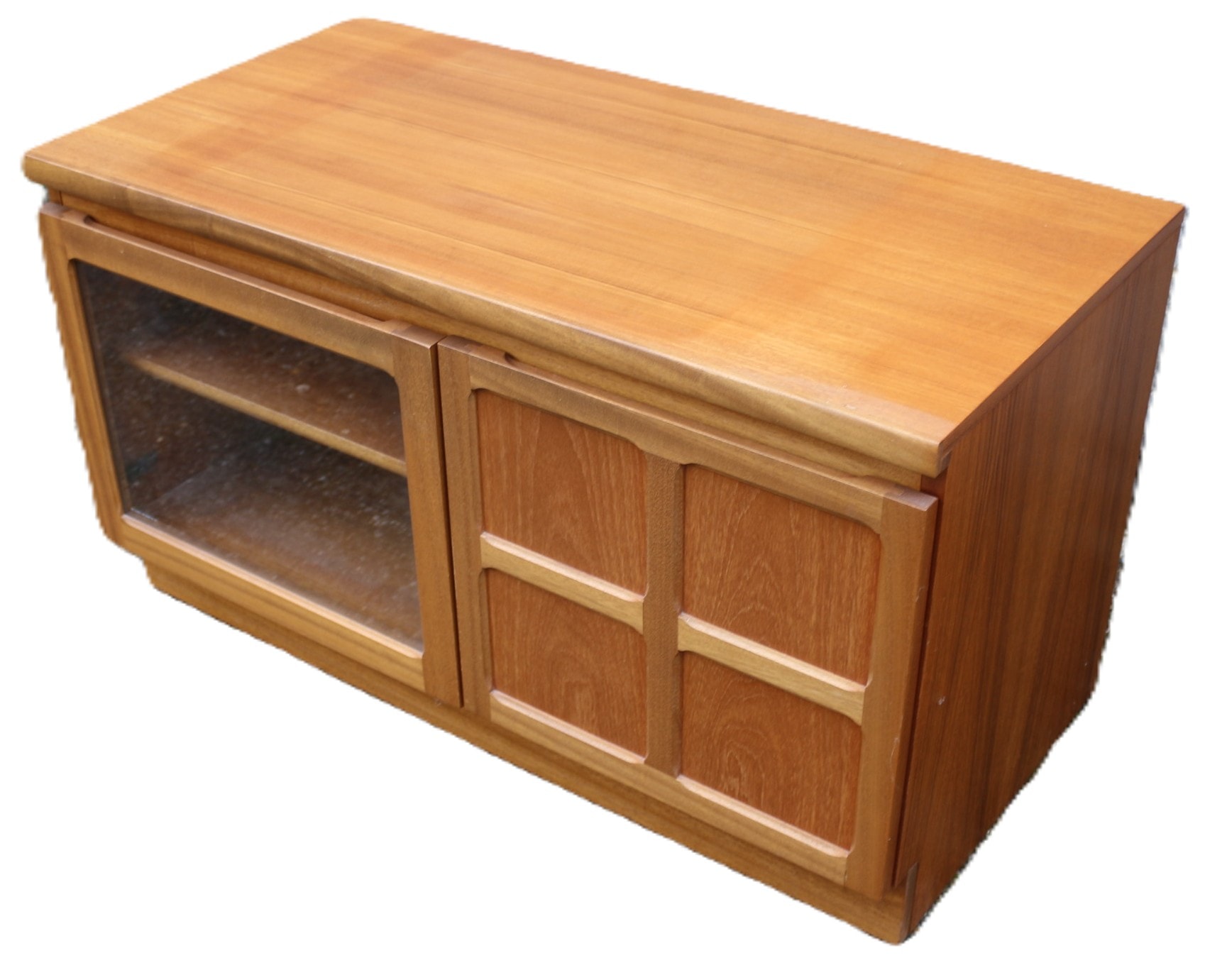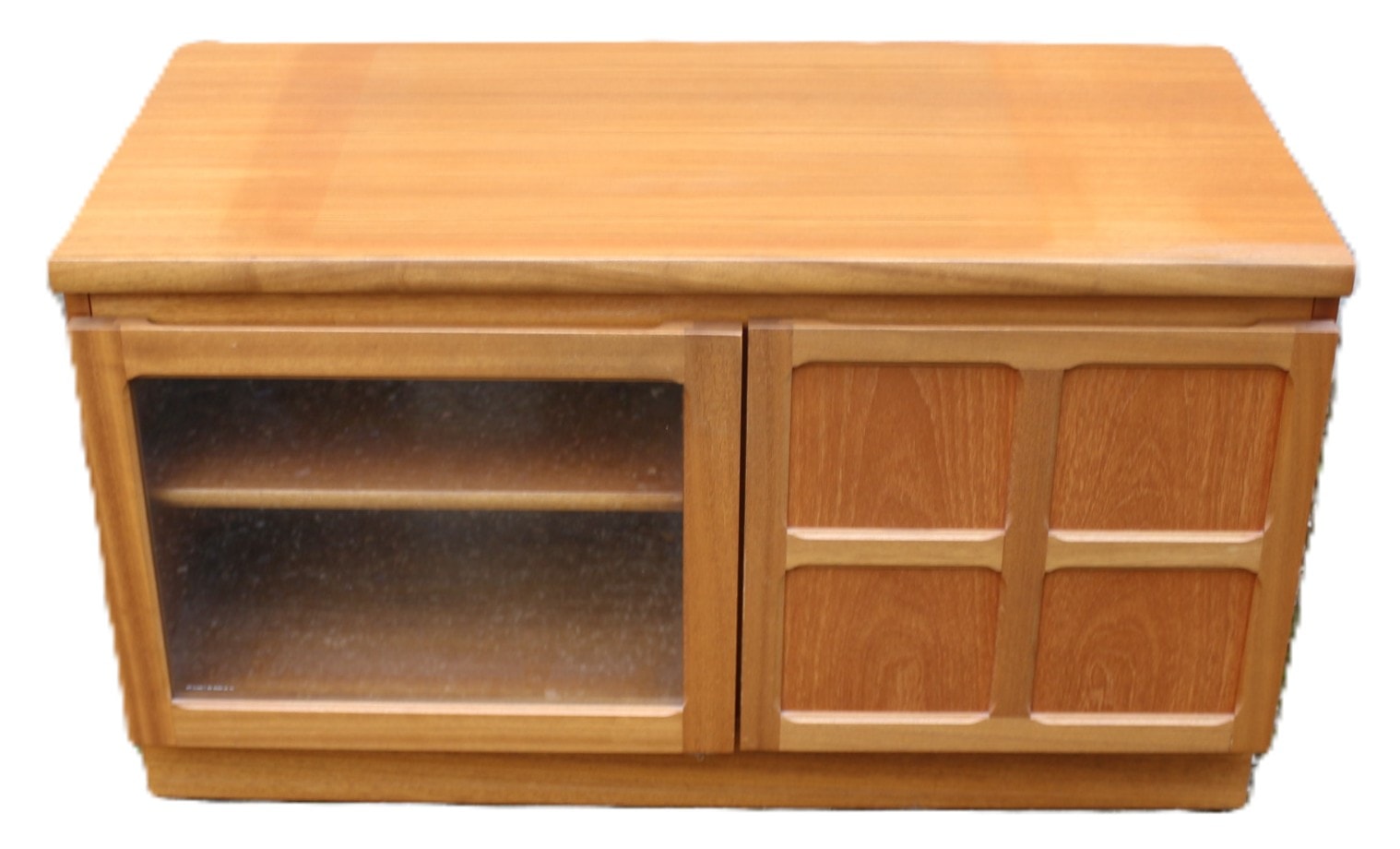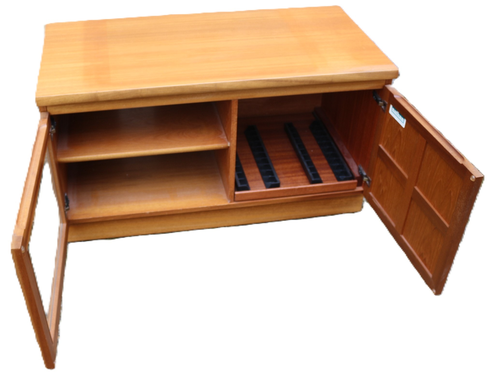 A Mid-Century Modern teak TV media cabinet by Nathan Furniture. This low-profile, rectangular unit features a light-to-medium-toned hardwood construction. The front is divided into two compartments: the left with a framed clear glass door opening to reveal two internal shelves, and the right with a solid wood door featuring a distinct four-panel design, opening to a compartment with black internal dividers, suitable for media storage. The interior of the right door bears a ‘nathan FURNITURE’ blue label. Further internal markings include a production checklist identifying it as a ‘TEAK UNIT’ and a white specification label detailing ‘DATE OF MANUFACTURE Q2’, ‘MODEL NUMBER S414’, and ‘BS 7449 1991’, indicating compliance with British Standards from 1991. 91x46cm 51cm Tall