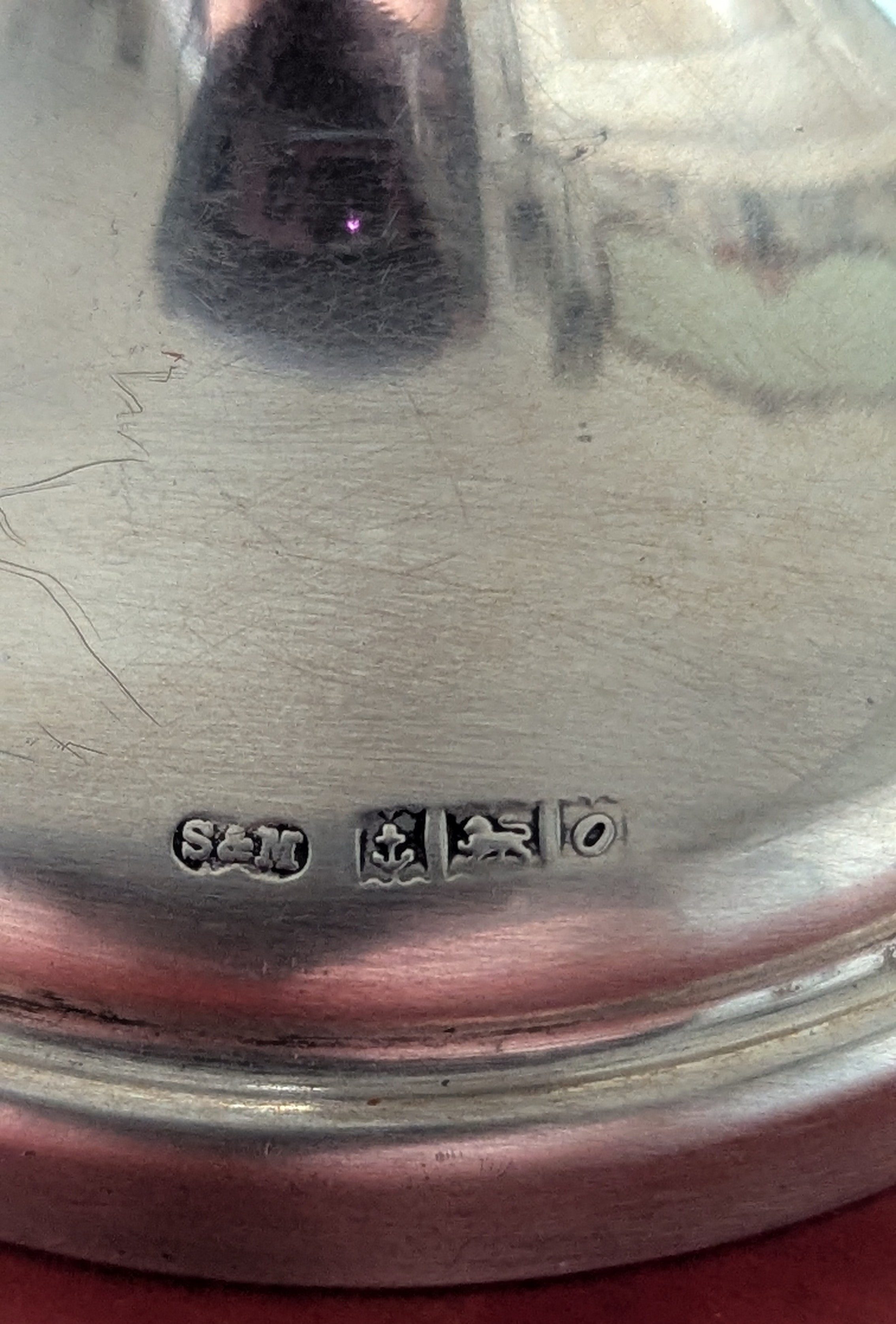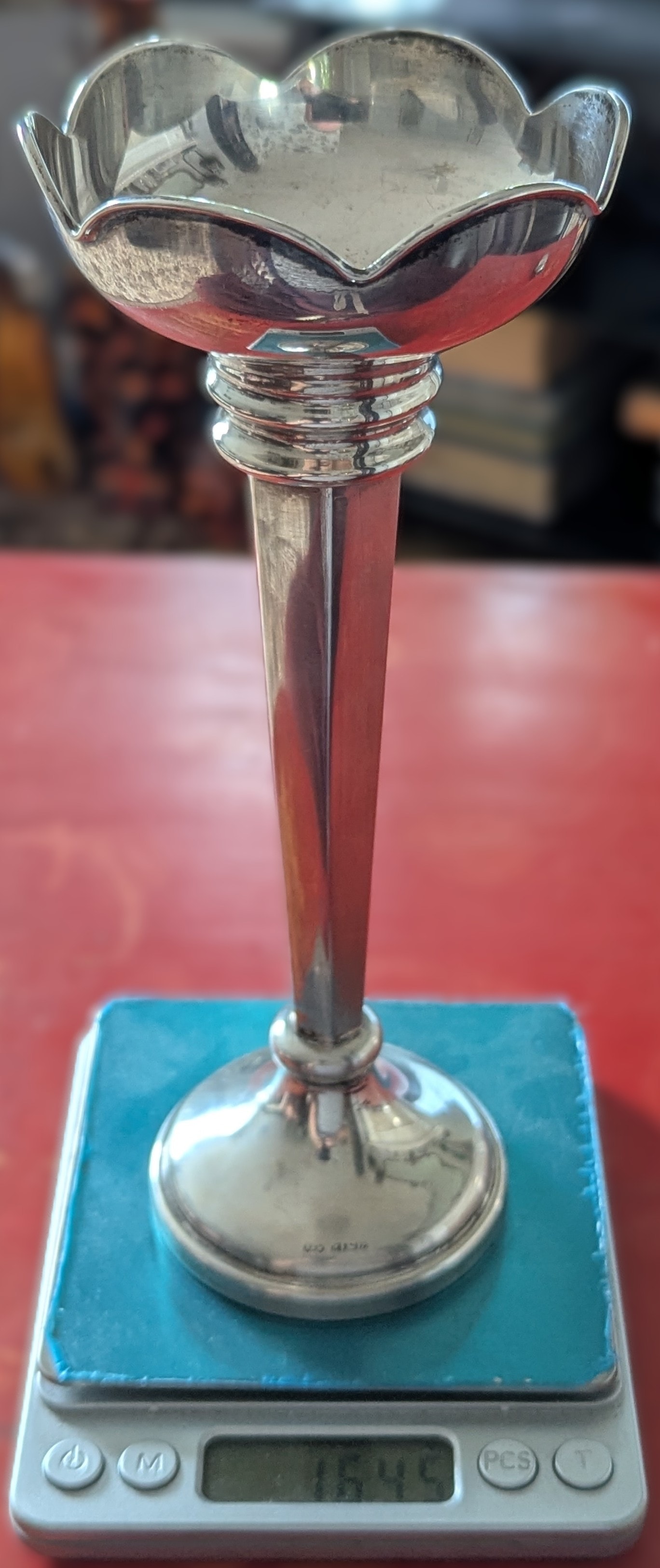 A polished sterling silver trumpet-form flower vase or single stem holder, featuring a tall, faceted stem rising from a circular, weighted base. The vase culminates in a flared rim with a distinct scalloped edge, indicative of a traditional or classical style. Visible hallmarks on the base include the maker’s mark "S&M, " an anchor symbol for the Birmingham Assay Office, a lion passant denoting sterling silver, and a date letter ‘O’ denoting the year 1963. The underside of the base is covered with a black felt-like material.