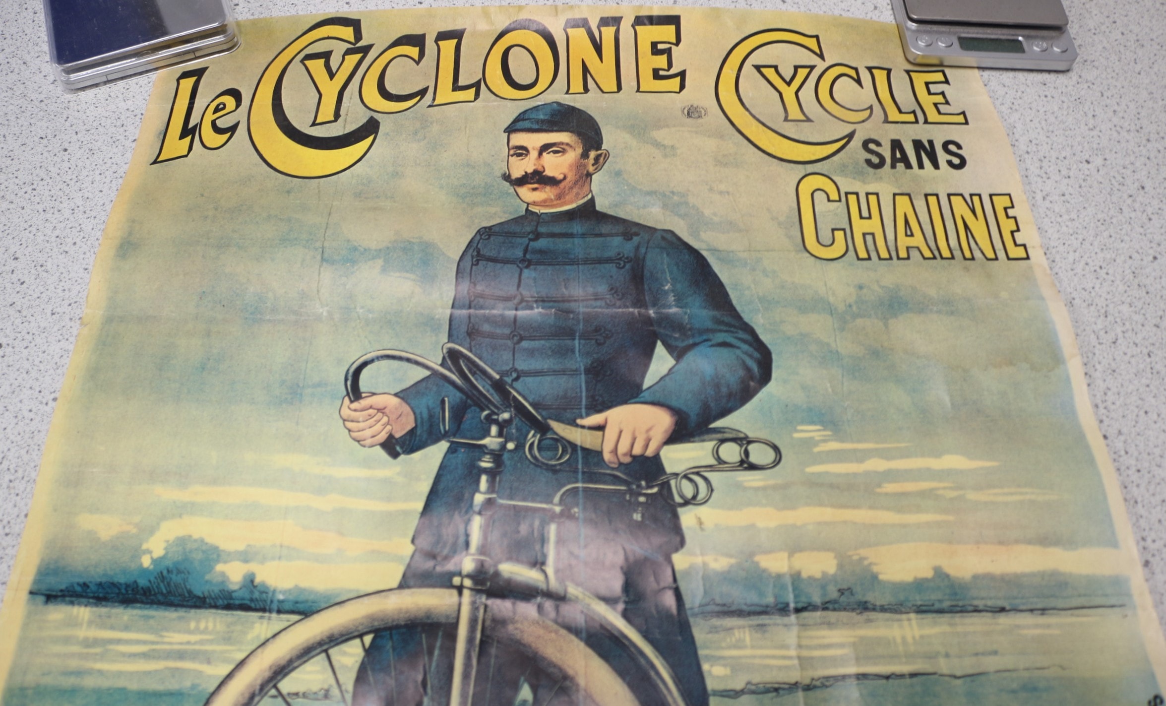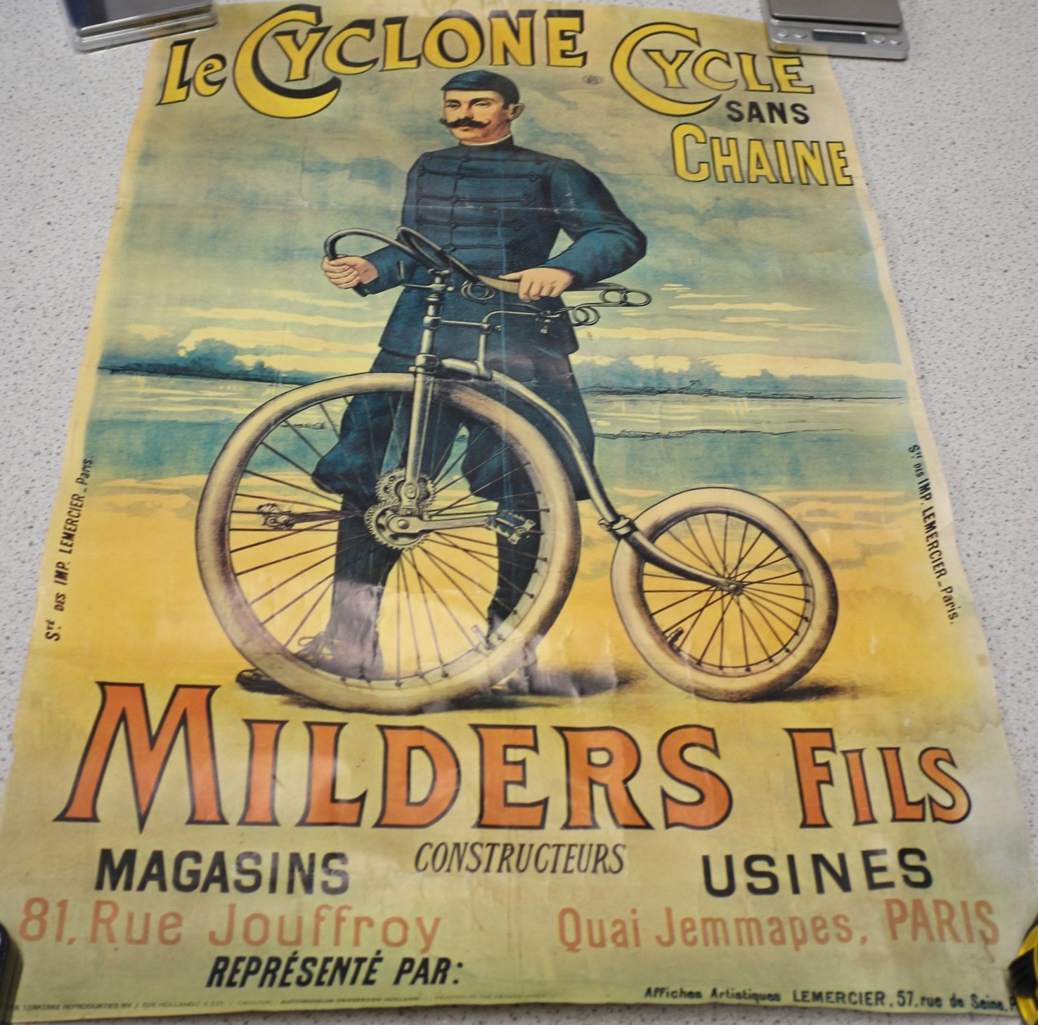 A large format colour lithographic advertising poster for “Le Cyclone Cycle Sans Chaine” by Milders Fils. Dating from the late 19th or early 20th century Belle Époque period, the poster depicts a well-dressed man in a blue uniform and cap, with a prominent mustache, standing proudly next to a “chainless” safety bicycle against a serene landscape background. Prominent text includes “LE CYCLONE CYCLE SANS CHAINE” at the top, advertising the product, and “MILDERS FILS” as the company, with further details like “MAGASINS CONSTRUCTEURS USINES” and addresses: “81, Rue Jouffroy Quai Jemmapes, PARIS.” The printer, “Sté des IMP. LEMERCIER. Paris.”, is credited along the sides and bottom. Printed on paper. 49x73cm