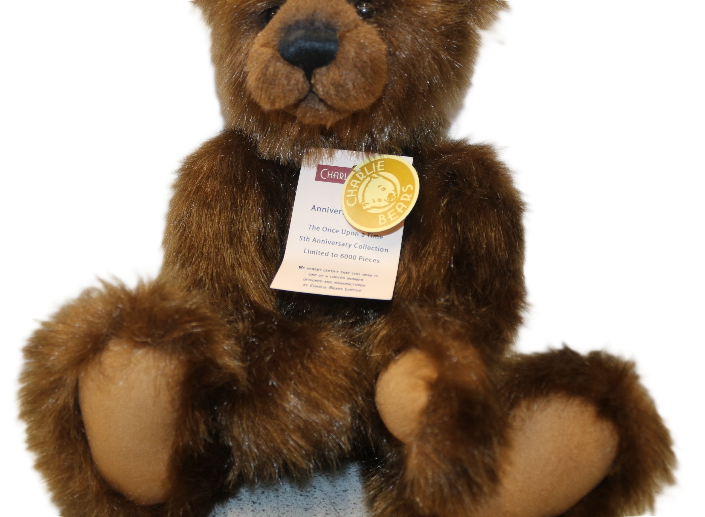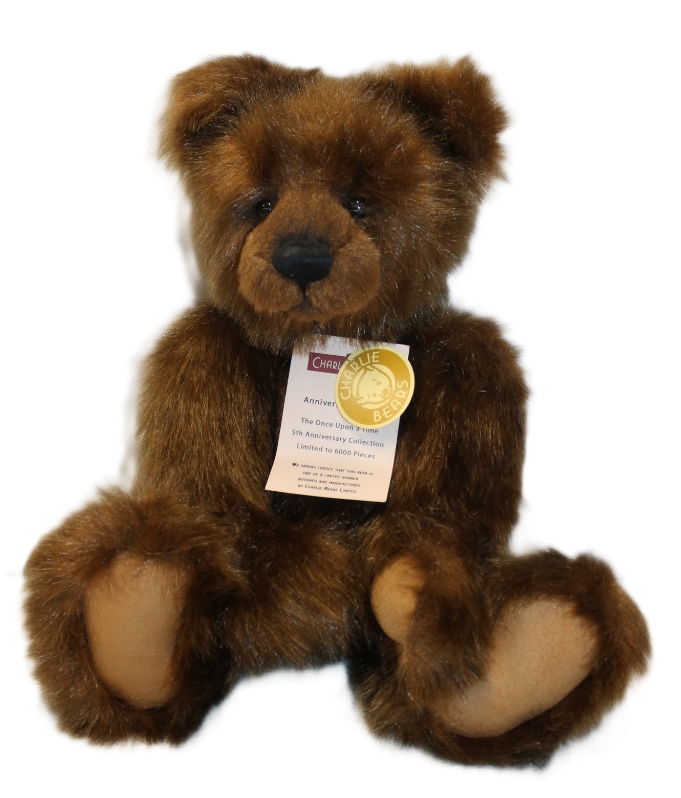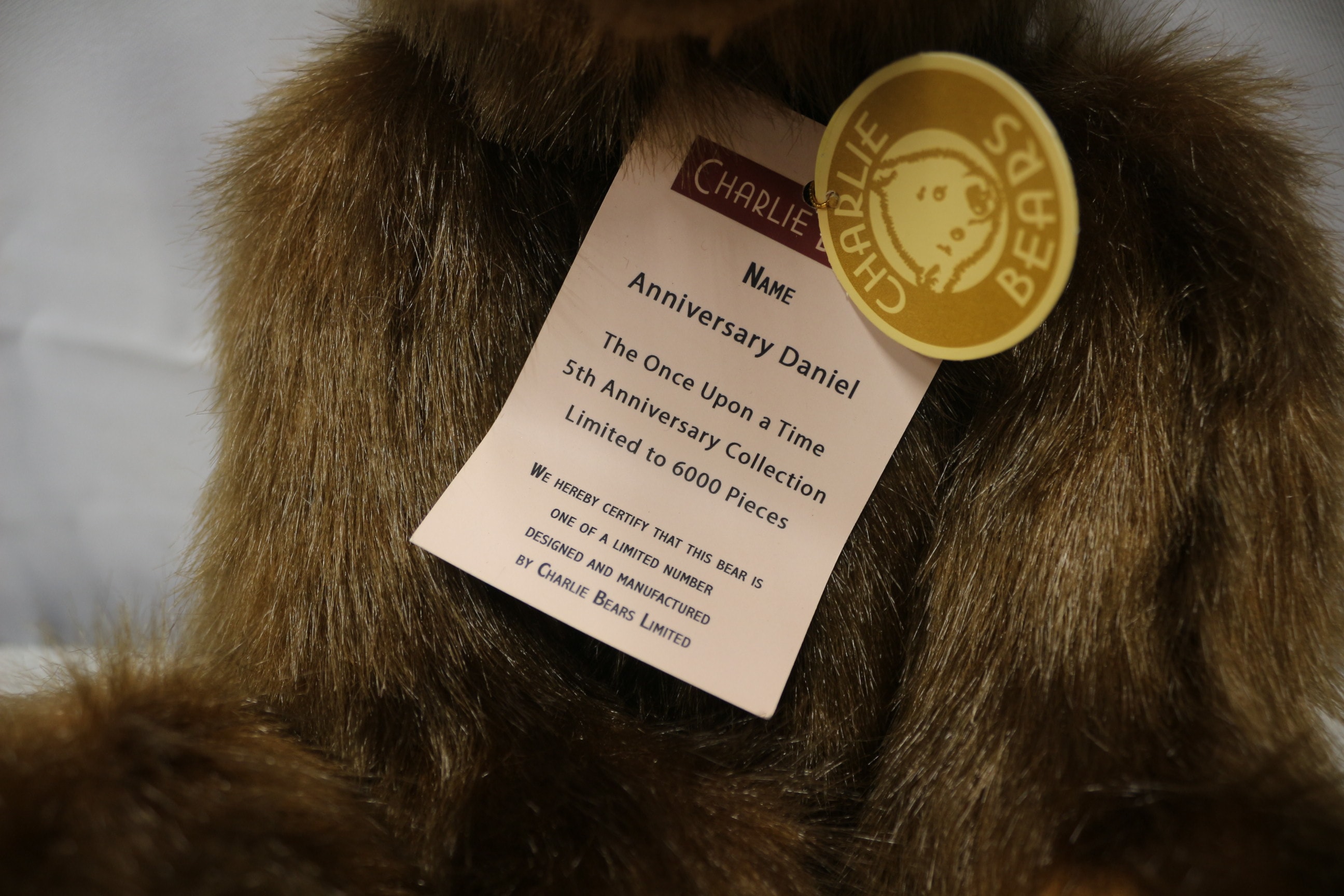 A limited edition Charlie Bears ‘Anniversary Daniel’ teddy bear, model CB114886, from The Once Upon a Time 5th Anniversary Collection. Crafted from shaggy brown faux fur with lighter tan paw pads, a black stitched nose, and dark eyes. The bear is accessorized with a black fabric collar featuring a small brass-toned bell. It is noted as a limited edition of 6000 pieces and includes its original Certificate of Authenticity signed by Charlotte Morris, Managing Director of Charlie Bears Limited, and all manufacturer’s tags. 40cm Tall