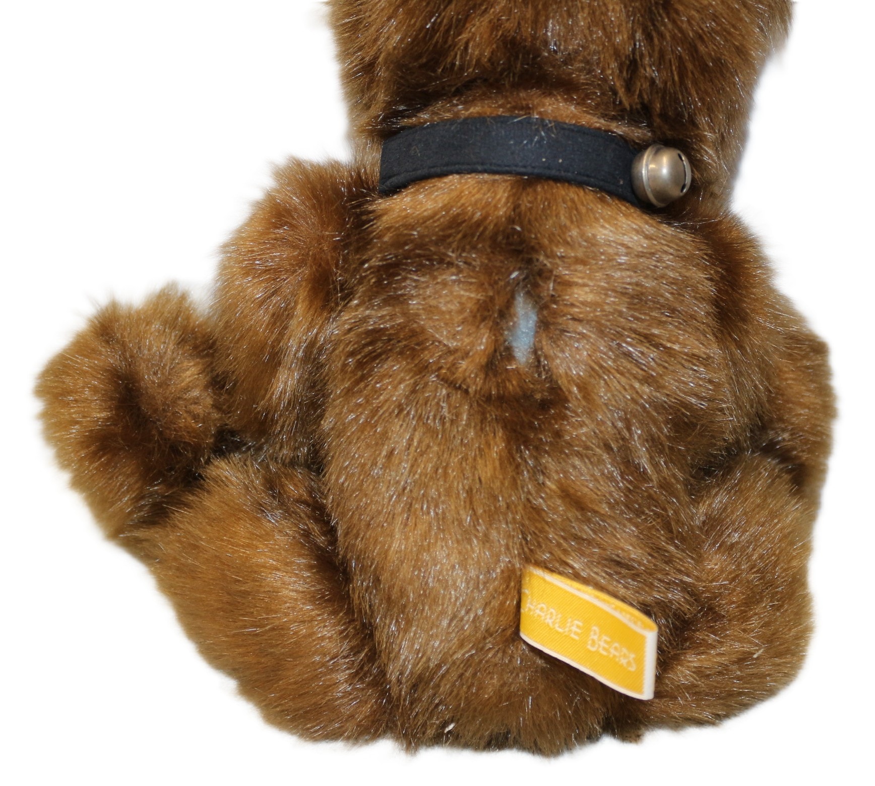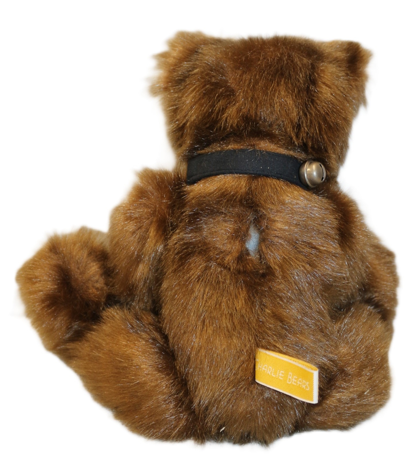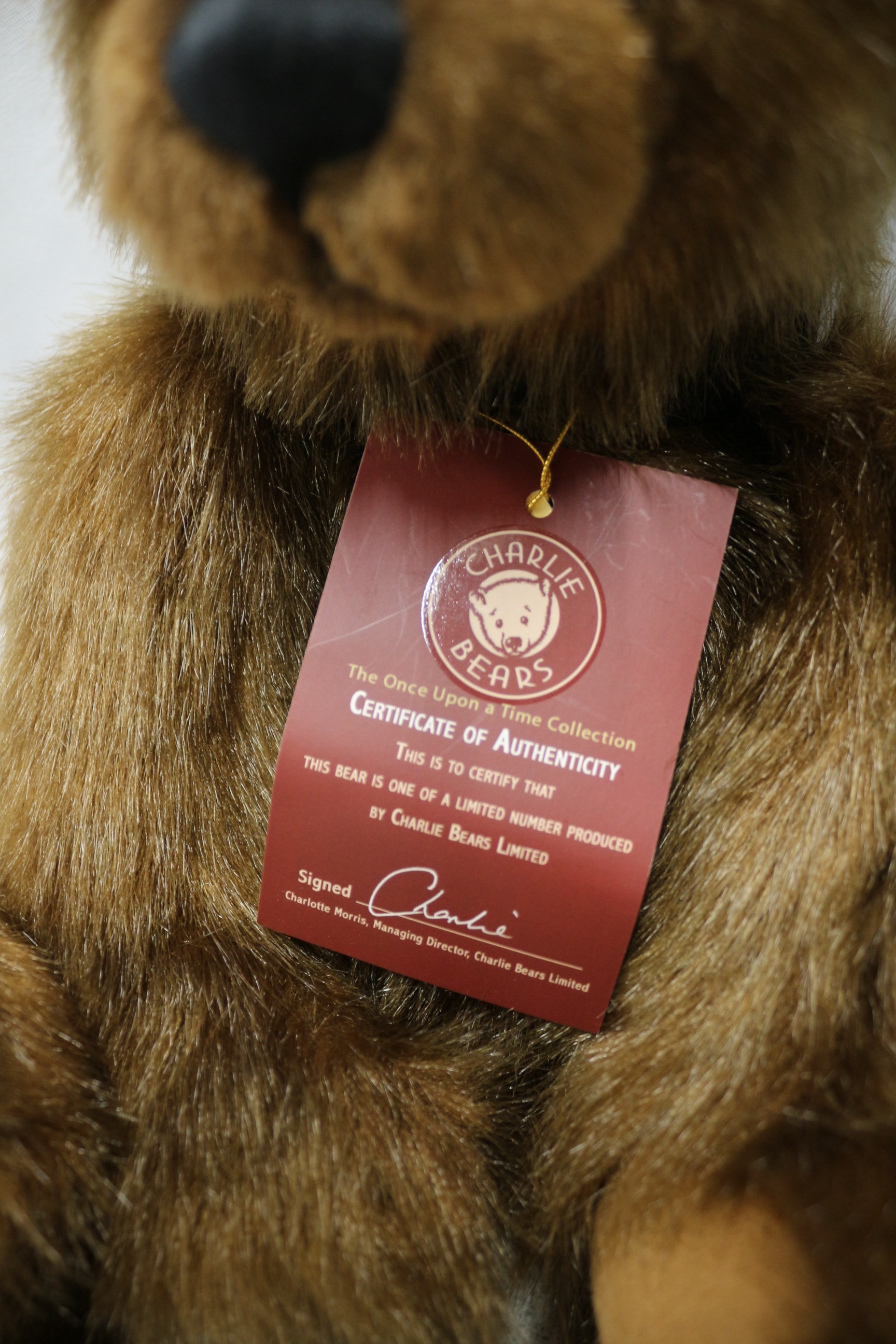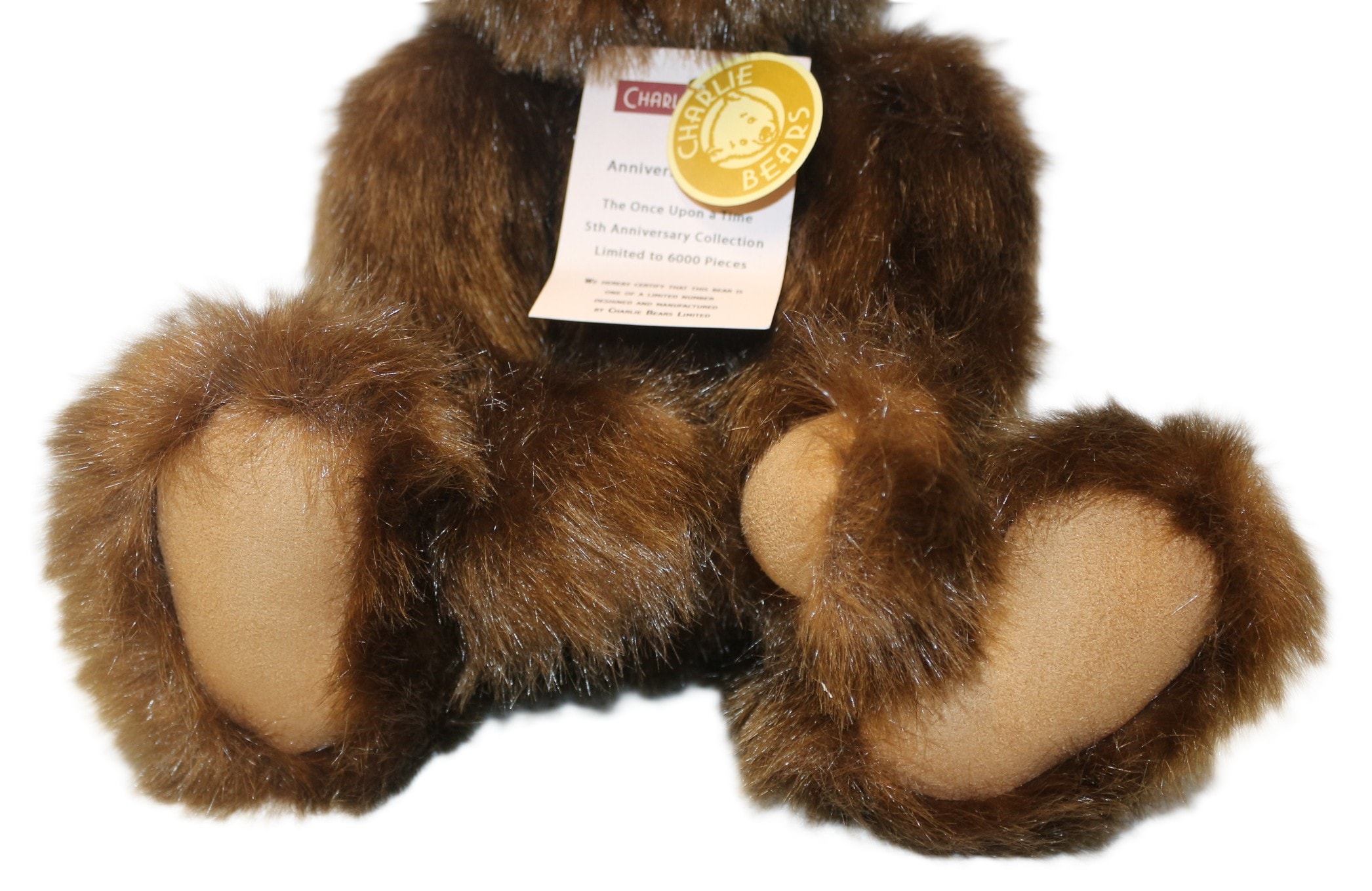 A limited edition Charlie Bears ‘Anniversary Daniel’ teddy bear, model CB114886, from The Once Upon a Time 5th Anniversary Collection. Crafted from shaggy brown faux fur with lighter tan paw pads, a black stitched nose, and dark eyes. The bear is accessorized with a black fabric collar featuring a small brass-toned bell. It is noted as a limited edition of 6000 pieces and includes its original Certificate of Authenticity signed by Charlotte Morris, Managing Director of Charlie Bears Limited, and all manufacturer’s tags. 40cm Tall