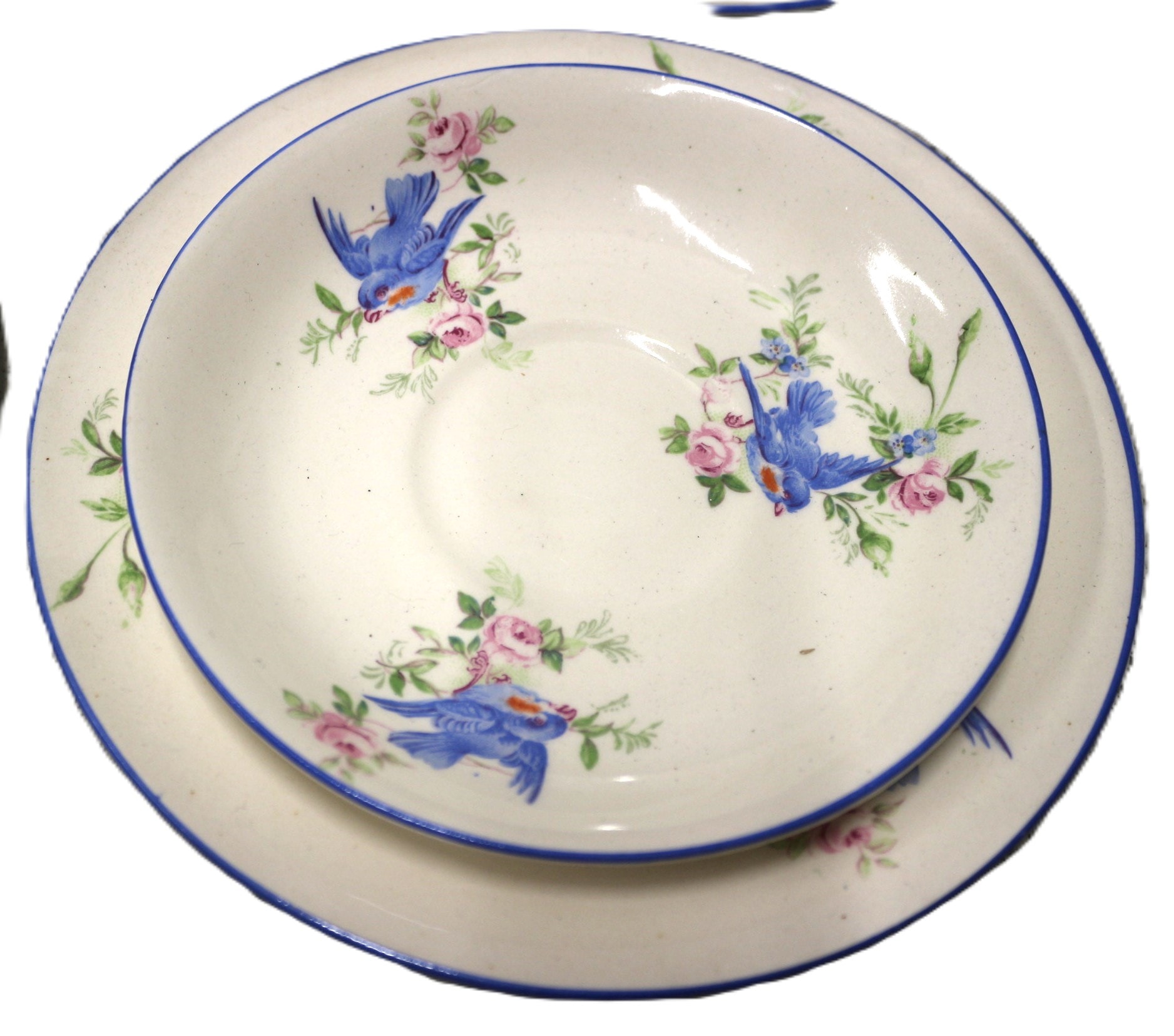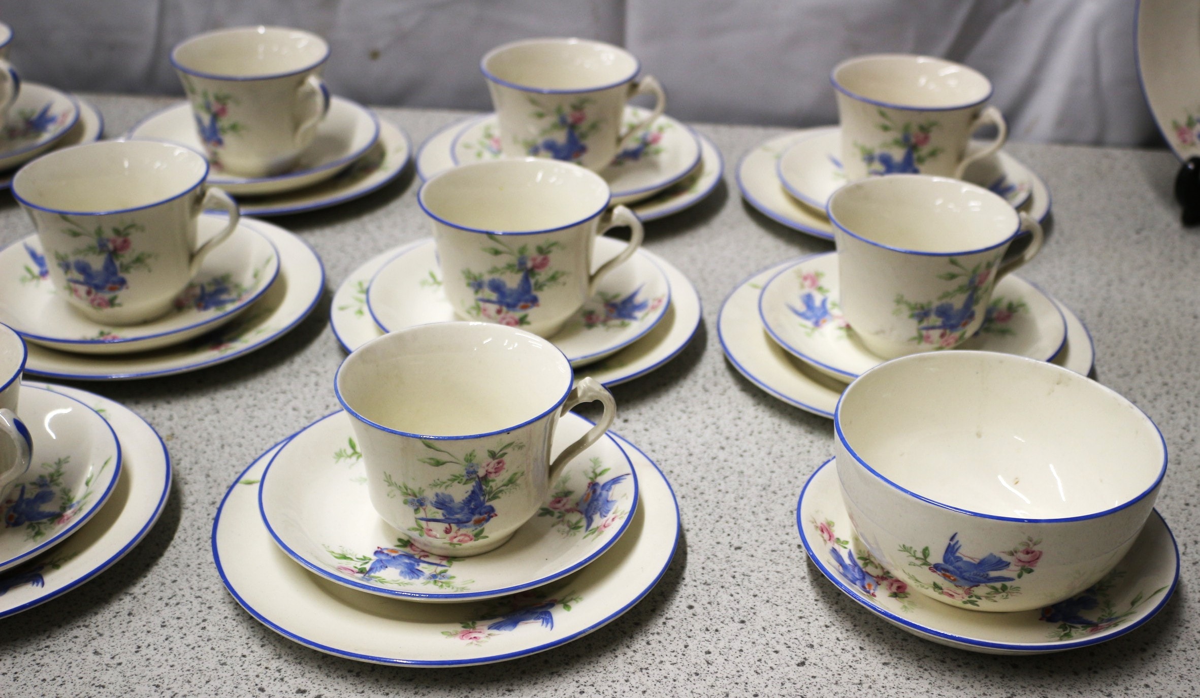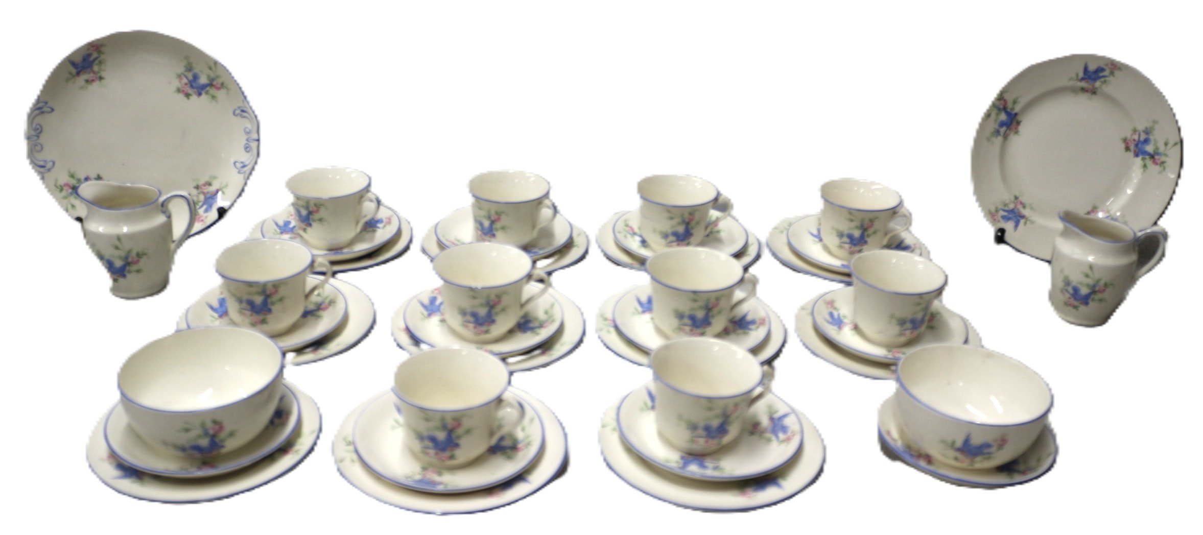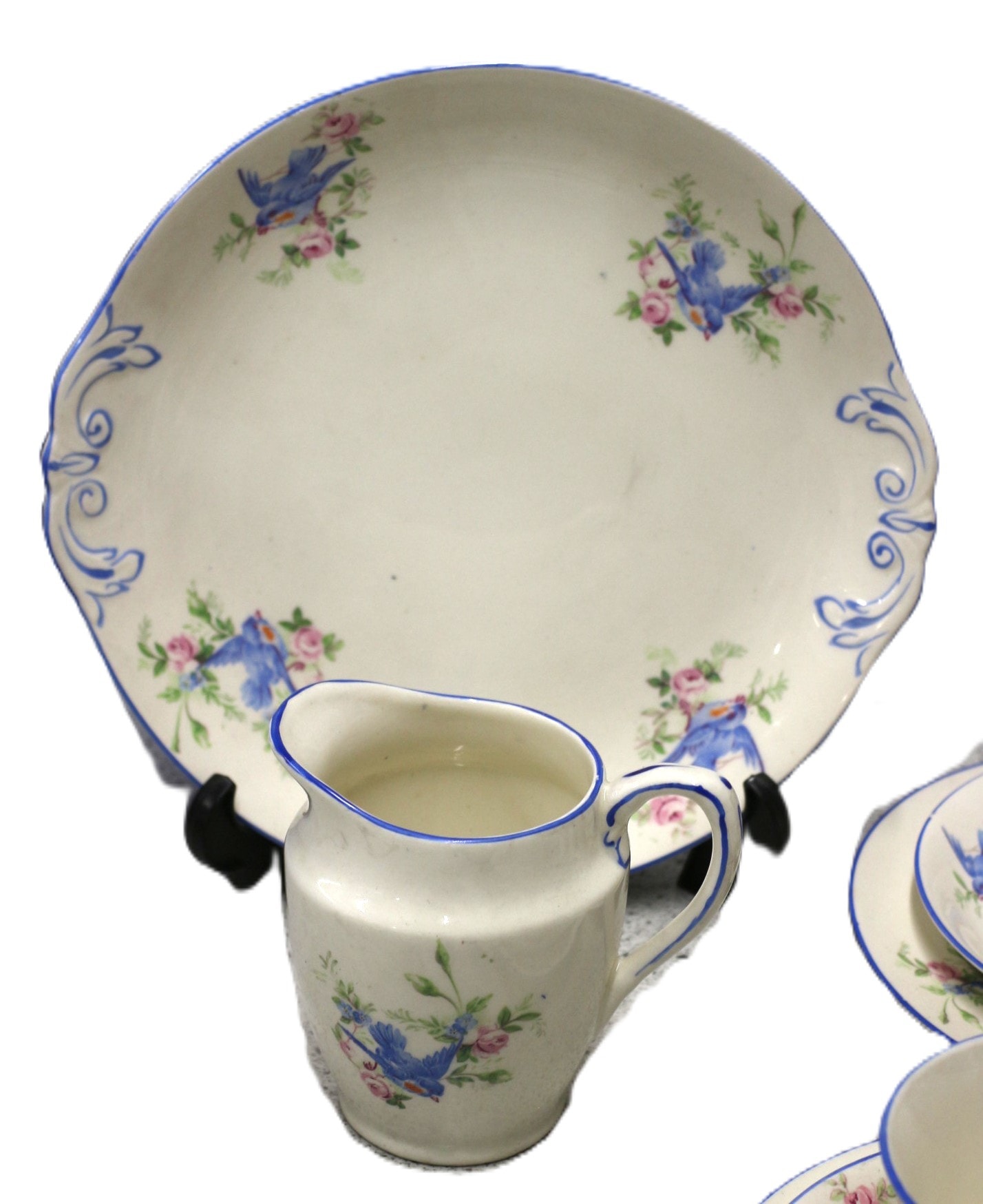 This lot comprises a partial ceramic Scotch Ivory dinnerware or tea service, likely from the early/mid-20th century, encompassing at least two platters, two pitchers, ten cups, ten saucers, ten small side plates, and two bowls. Each piece features an elegant transfer-printed or hand-painted design of stylized blue birds nestled among pink roses and green foliage, all edged with a contrasting blue line. The material appears to be glazed earthenware or porcelain. No visible maker’s marks or textual inscriptions are discernible for precise dating or attribution.