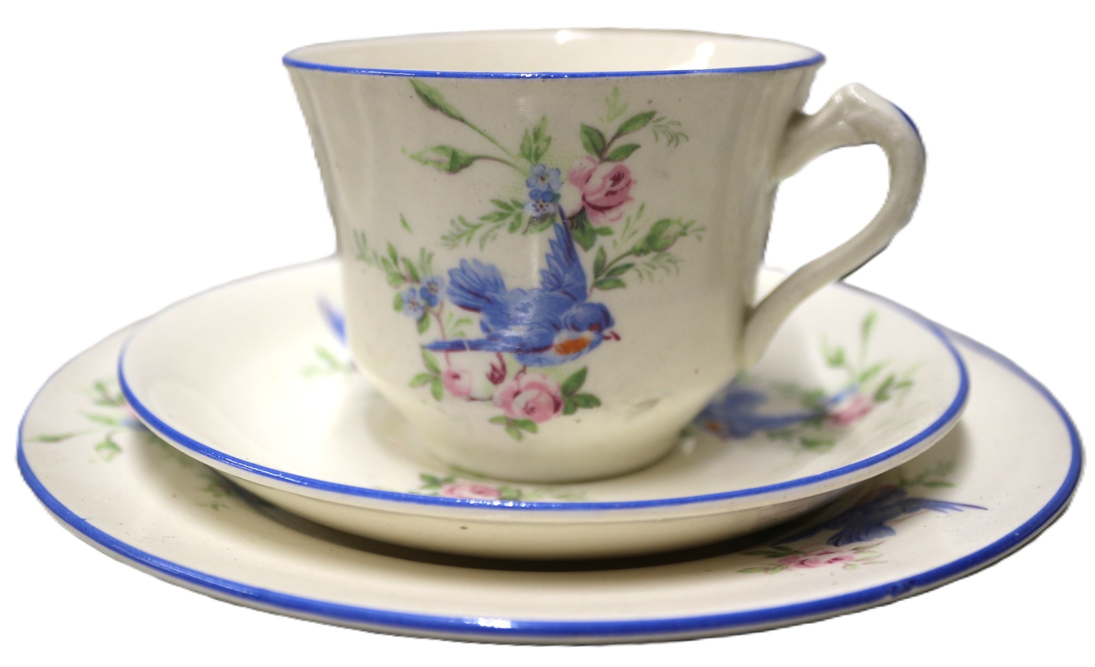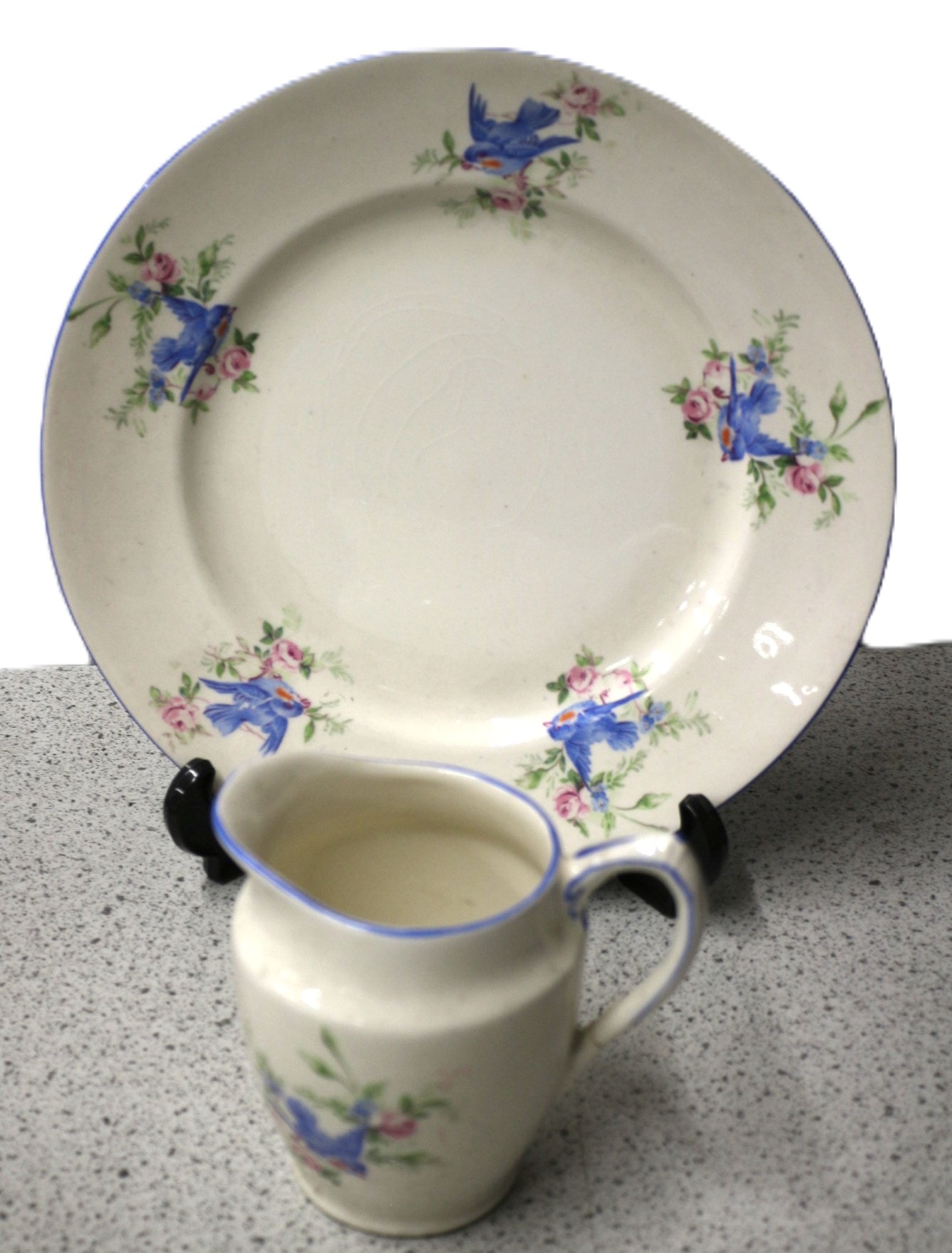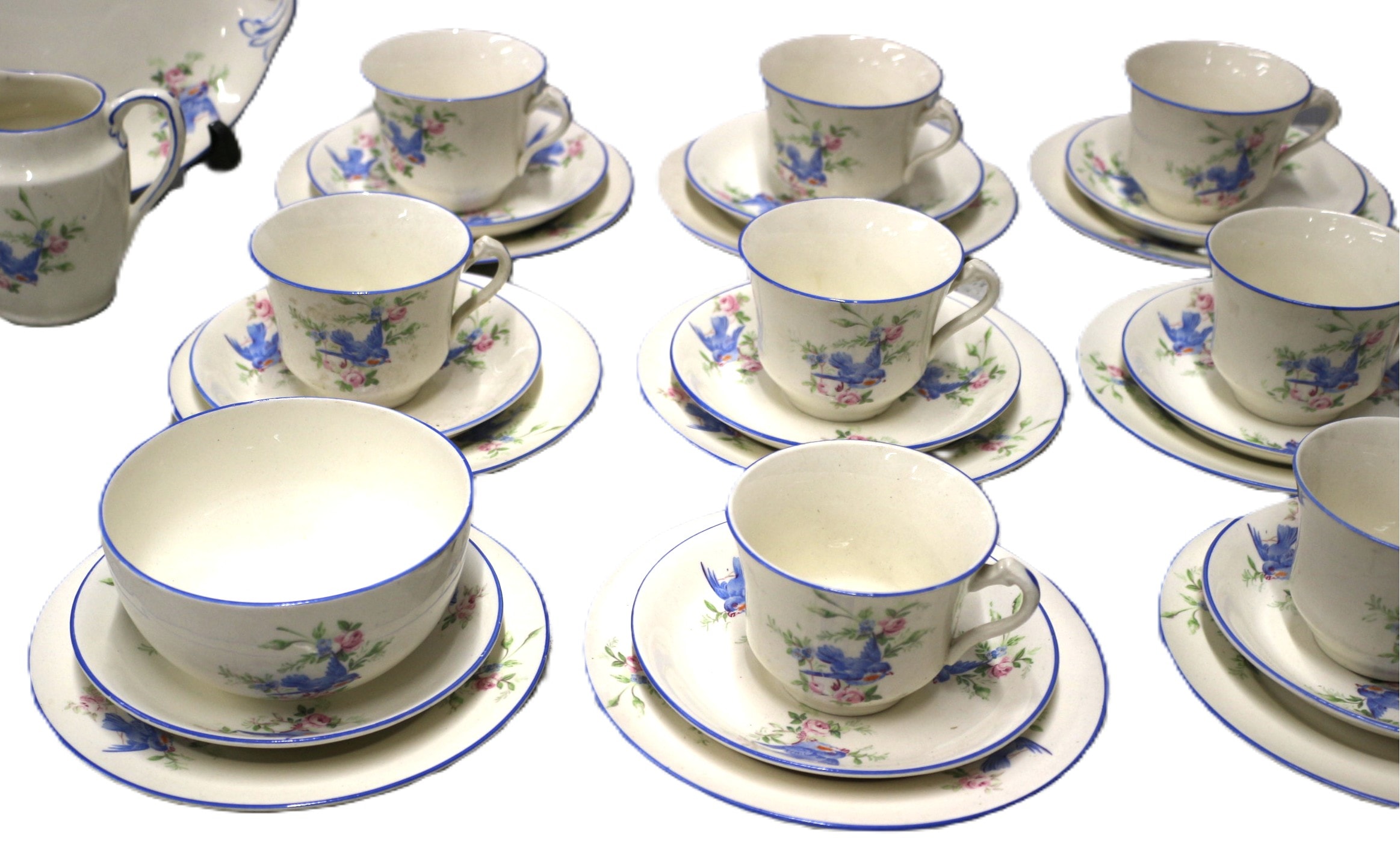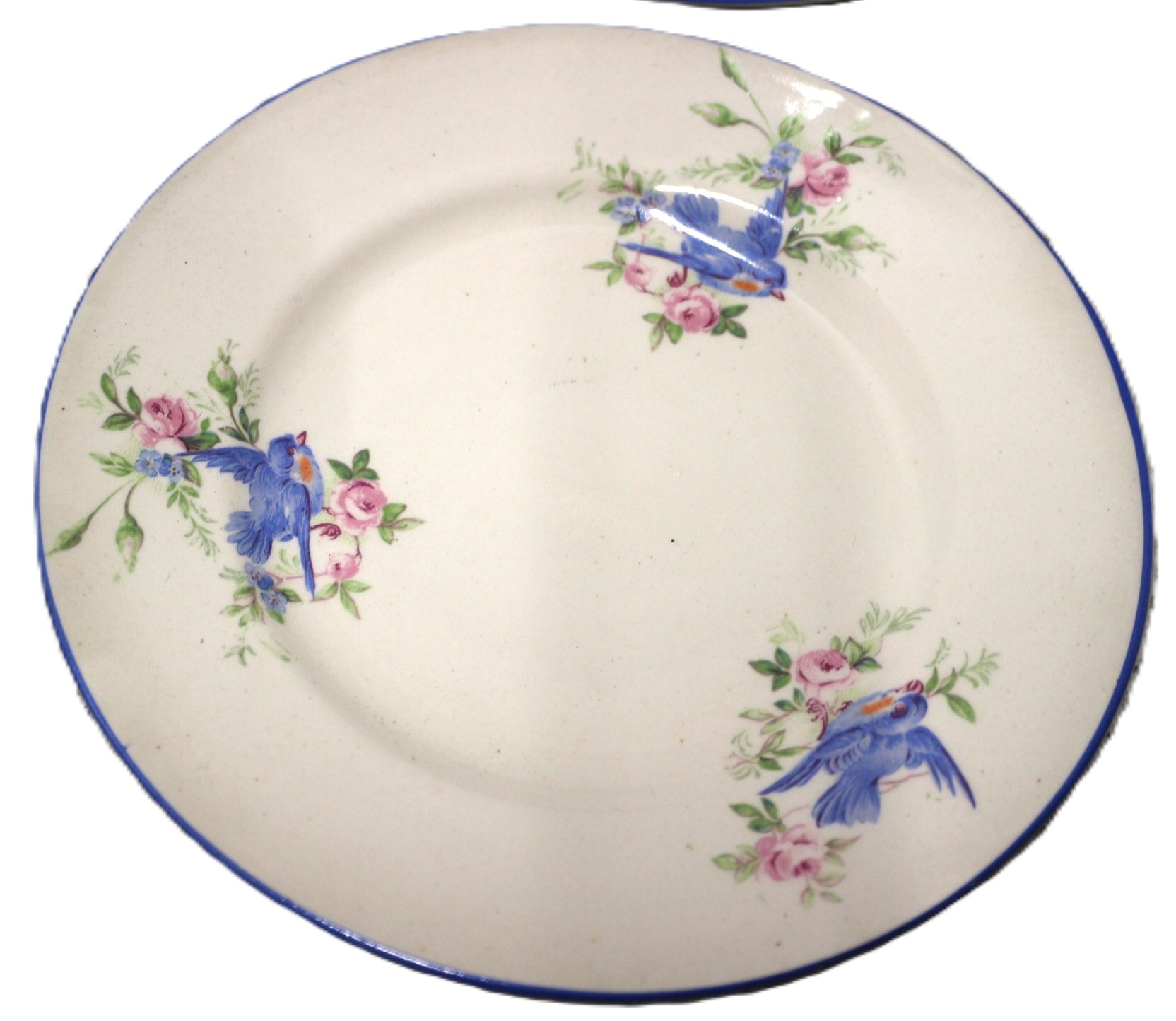 This lot comprises a partial ceramic Scotch Ivory dinnerware or tea service, likely from the early/mid-20th century, encompassing at least two platters, two pitchers, ten cups, ten saucers, ten small side plates, and two bowls. Each piece features an elegant transfer-printed or hand-painted design of stylized blue birds nestled among pink roses and green foliage, all edged with a contrasting blue line. The material appears to be glazed earthenware or porcelain. No visible maker’s marks or textual inscriptions are discernible for precise dating or attribution.