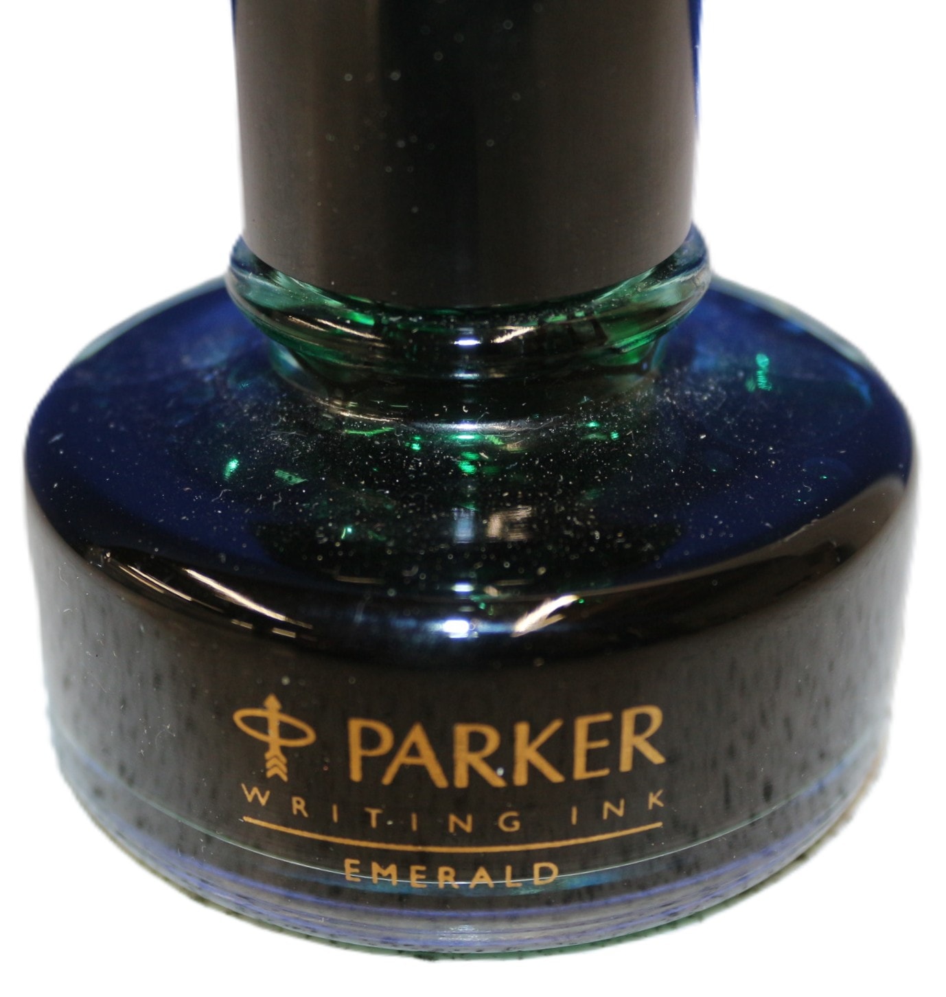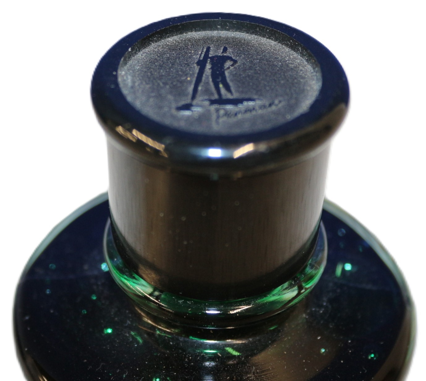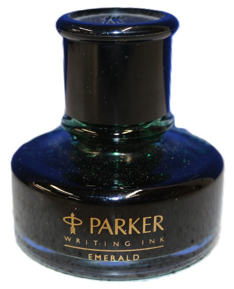 A full Parker Penman Emerald Green Writing Ink Bottle, 50ml, discontinued. This modern bottle is crafted from dark glass with a molded plastic screw-top cap. The bottle features gold lettering displaying the “PARKER” logo, “WRITING INK, ” and “EMERALD” for the ink colour. A stylized figure of a standing person holding what appears to be a quill is inscribed with “Penman” underneath on the bottle. This same figure and “Penman” text are also embossed on the bottle’s cap. The base of the bottle is embossed with manufacturer details, likely “PARKER PEN COMPANY, ” and retains a white oval sticker with the number “6213.” The bottle contains a dark emerald green ink, consistent with the label, which shows some visible particulates.