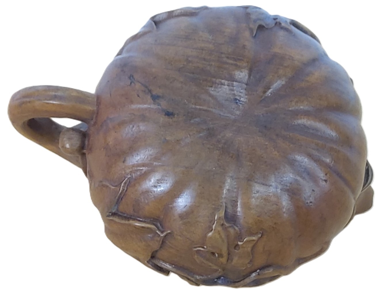 A Chinese Boxwood carved pumpkin teapot sculpture, naturalistically shaped to resemble a pumpkin or gourd. The body is rounded and distinctly lobed, featuring extensive relief carving of intertwining leaves and vines that wrap around its circumference. The integrated lid mirrors the lobed design and is surmounted by a stem-like finial, while the spout is organically formed as a curling leaf or vine. A C-shaped handle, also appearing to be part of the organic vine motif, is attached to the side. The medium-brown wood exhibits a visible grain and a polished or patinated surface. No discernible text, signatures, or other markings are visible on any of the exposed surfaces.