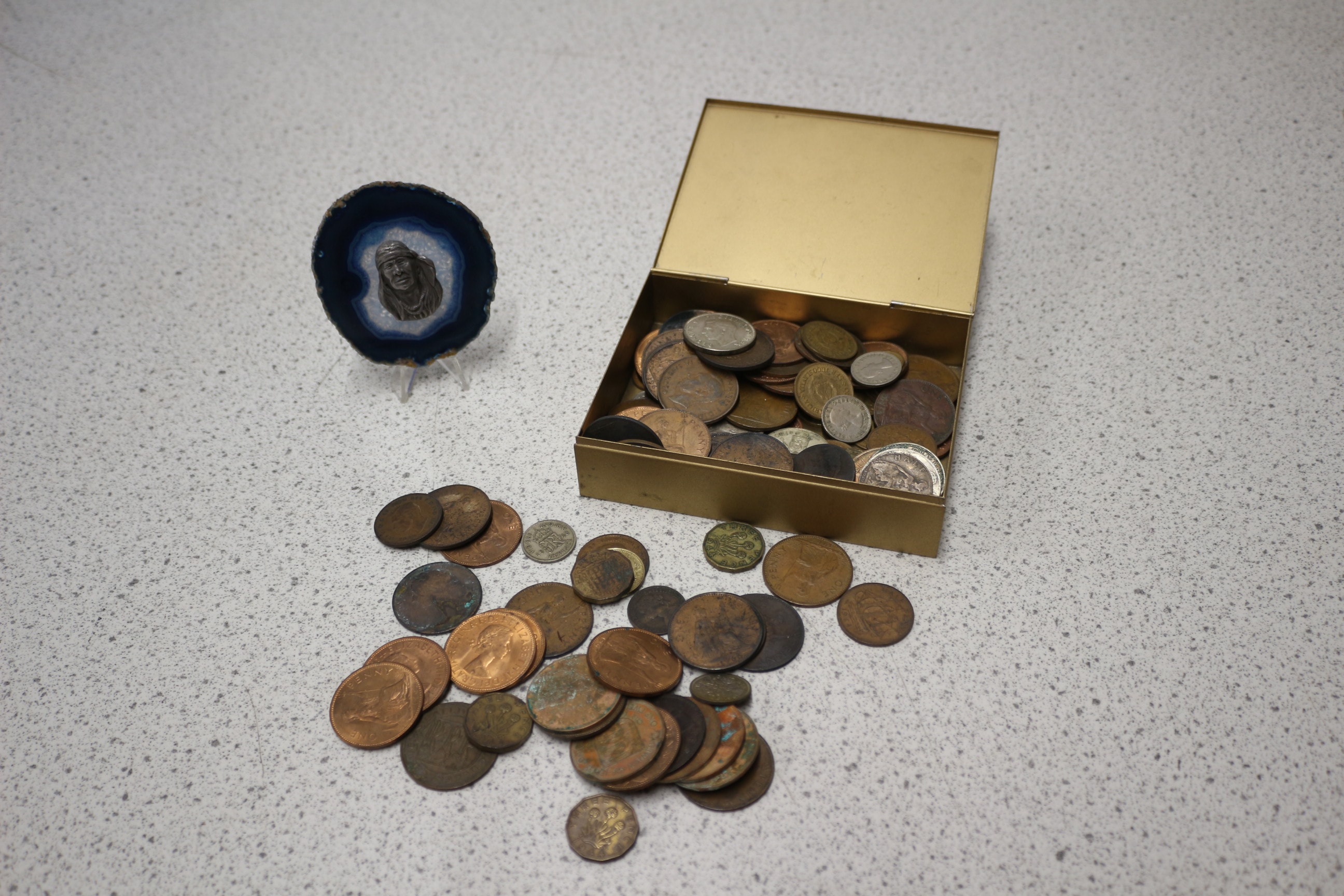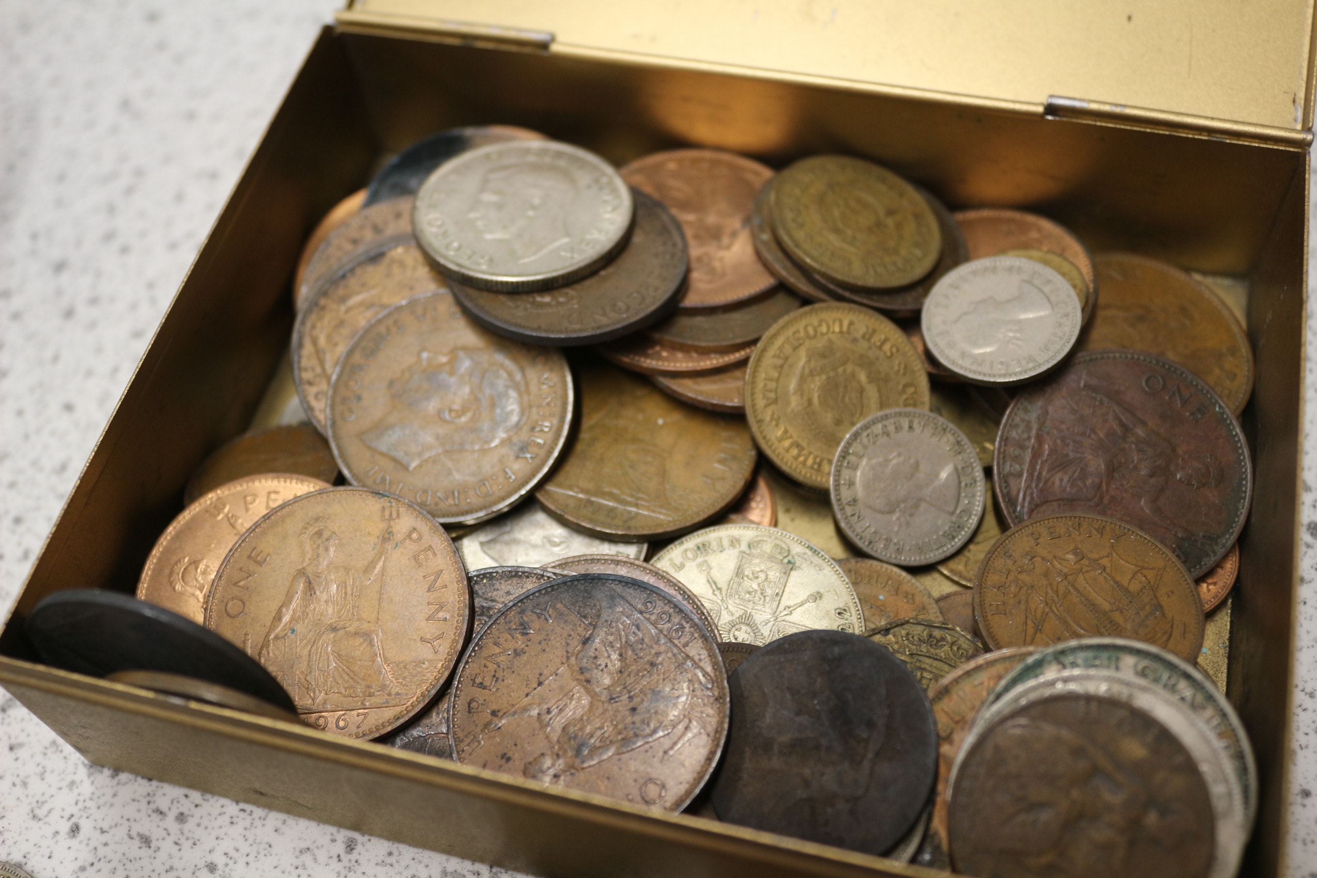A substantial collection of numerous assorted vintage coins, primarily in bronze and copper tones with some silver-coloured pieces, featuring visible inscriptions such as “ONE PENNY 1967”, “ELIZABETH II”, “DEI GRATIA REGINA F:D:”, “1940”, “GEORGE VI KING EMPEROR”, “TWO SHILLINGS 1947”, “SOUTH AFRICA”, and “1/2 PENNY”.
