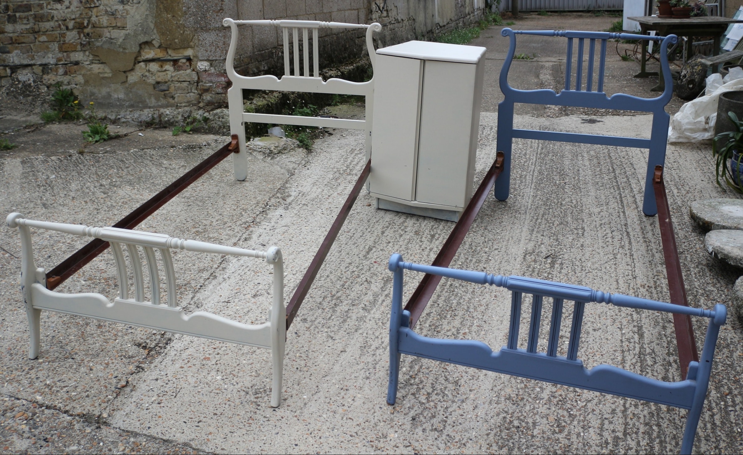 Two single bed frames with Harp shaped headboard, hand-painted one cream and one periwinkle blue, with a hand-painted cream small cabinet featuring a dark wood interior. AF