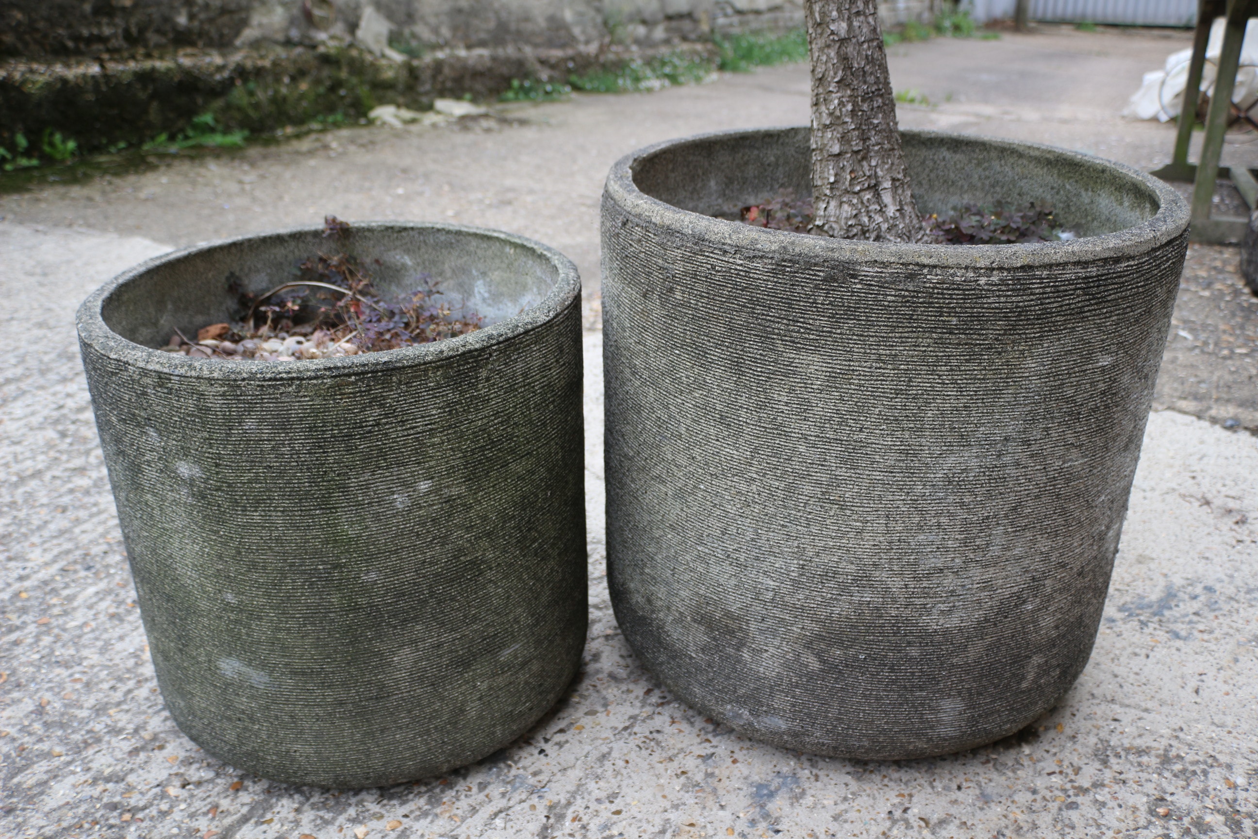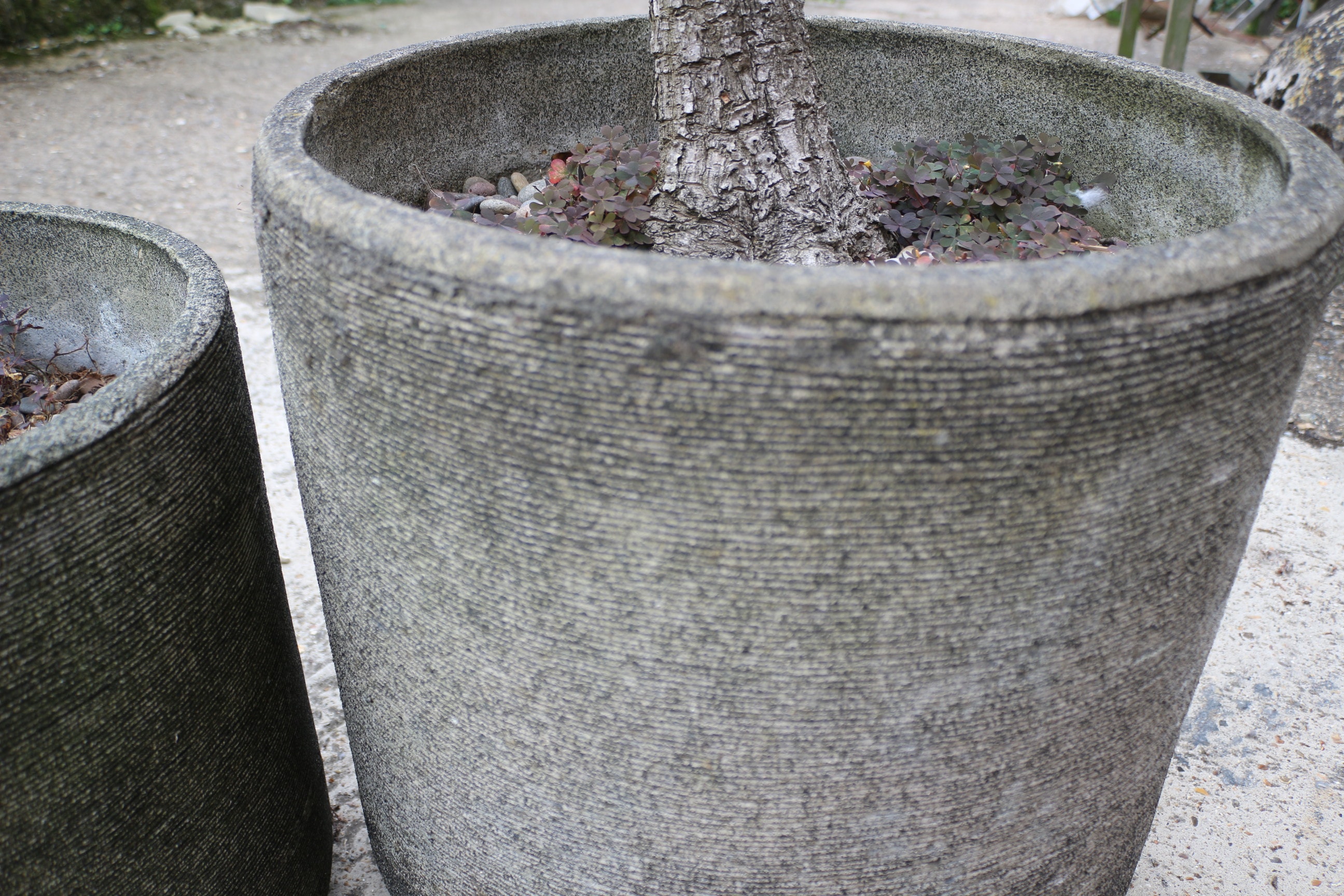 A tall green-leafed plant with a brown trunk is housed in a large grey concrete pot, accompanied by one smaller empty grey concrete pot. 50cm Tall, 50.5cm Dia