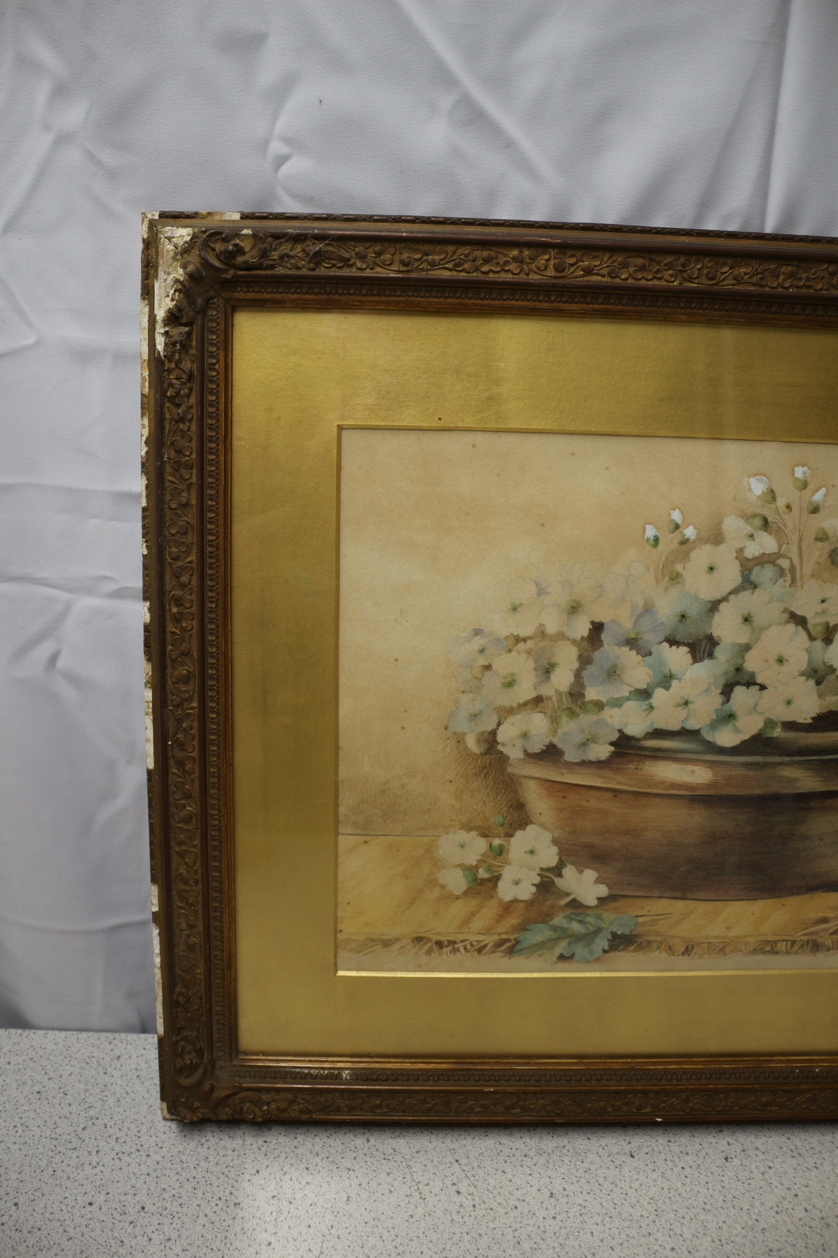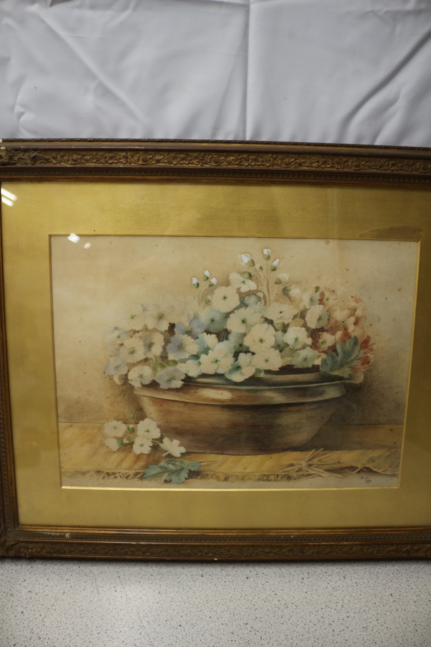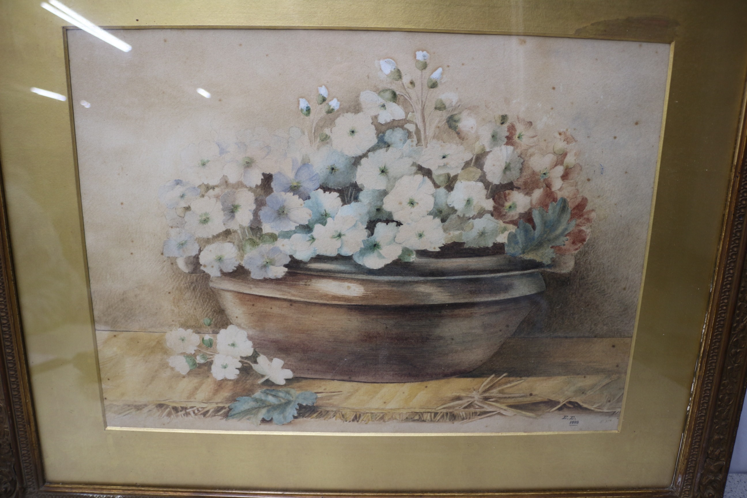 A framed watercolour painting depicting white, light blue, and pink flowers in a brown bowl, signed ‘E. E. 1888’.