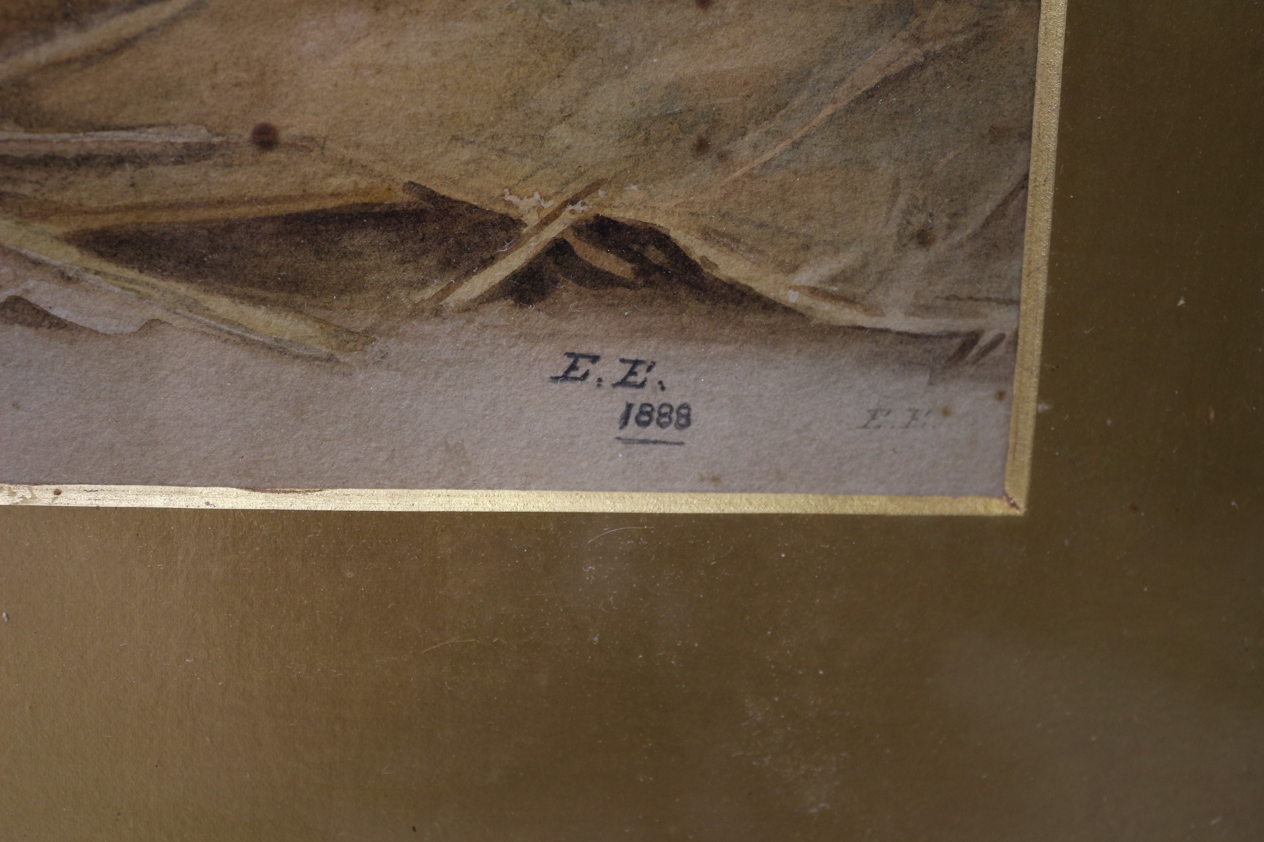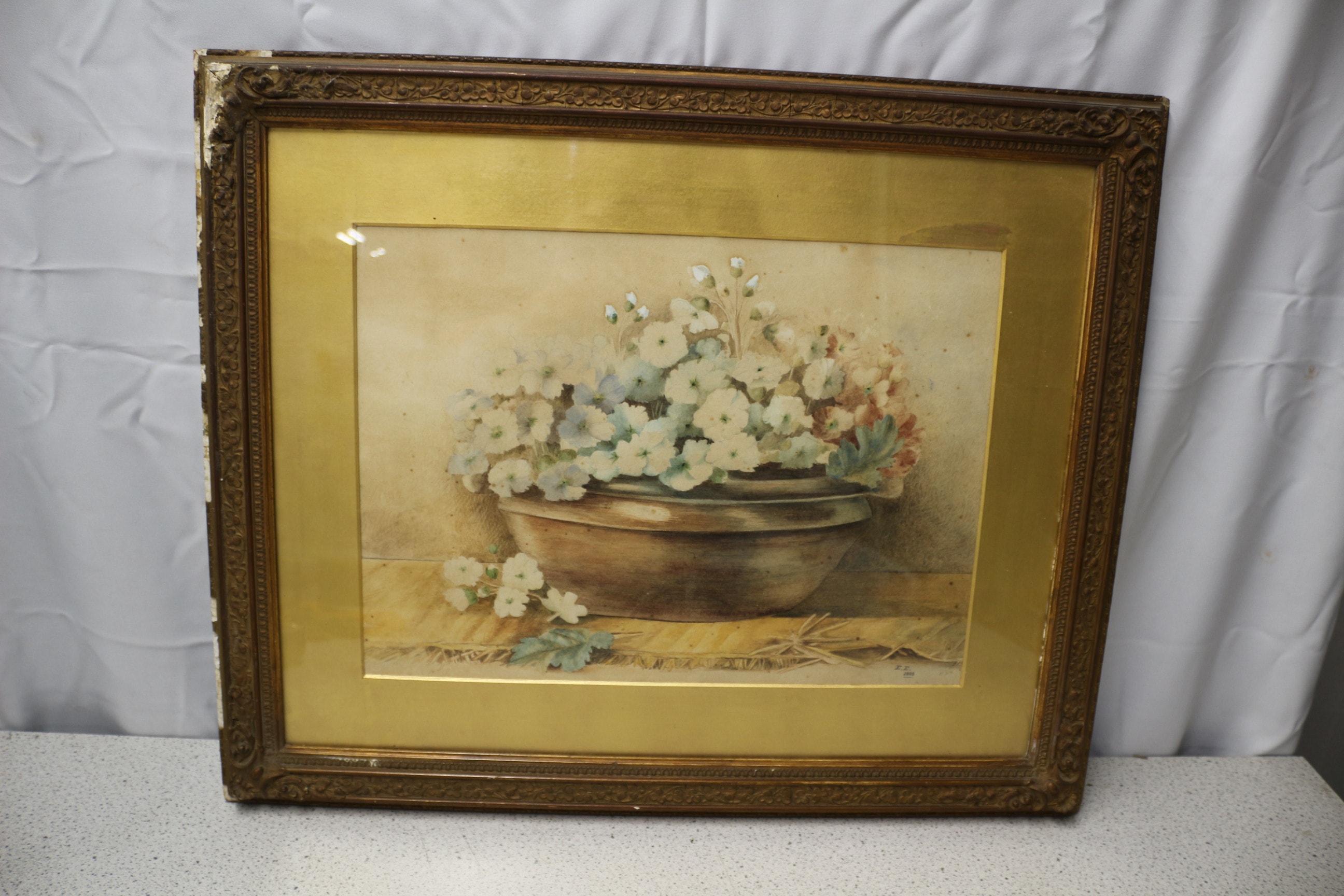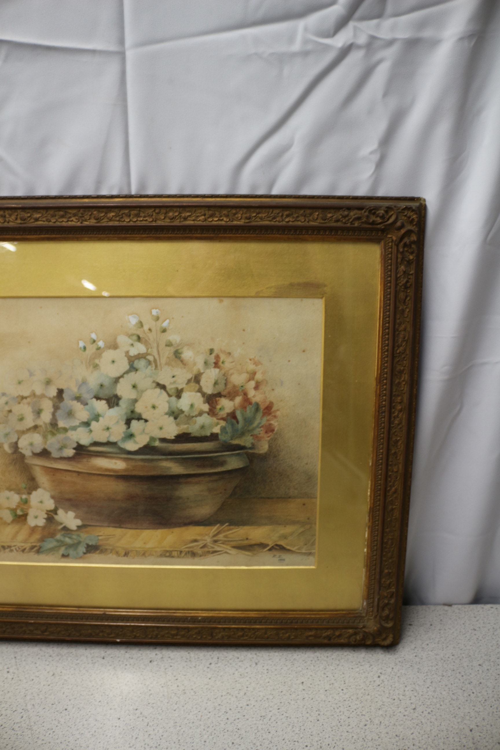 A framed watercolour painting depicting white, light blue, and pink flowers in a brown bowl, signed ‘E. E. 1888’.