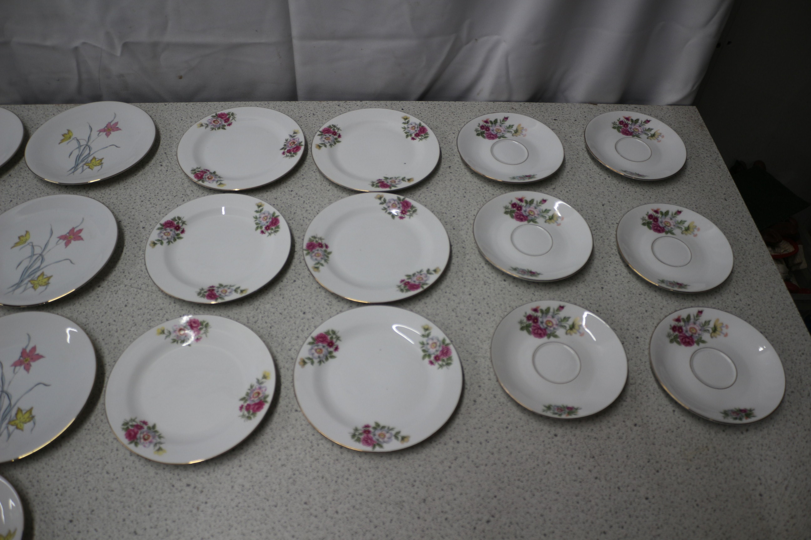 Assorted white ceramic plates and saucers with gold trim, including 14 pieces with a pink and yellow lily design marked “Made in China” and 14 pieces with a multicoloured rose cluster design marked “feltmann Weiden K. Bavaria Made in Germany”.
