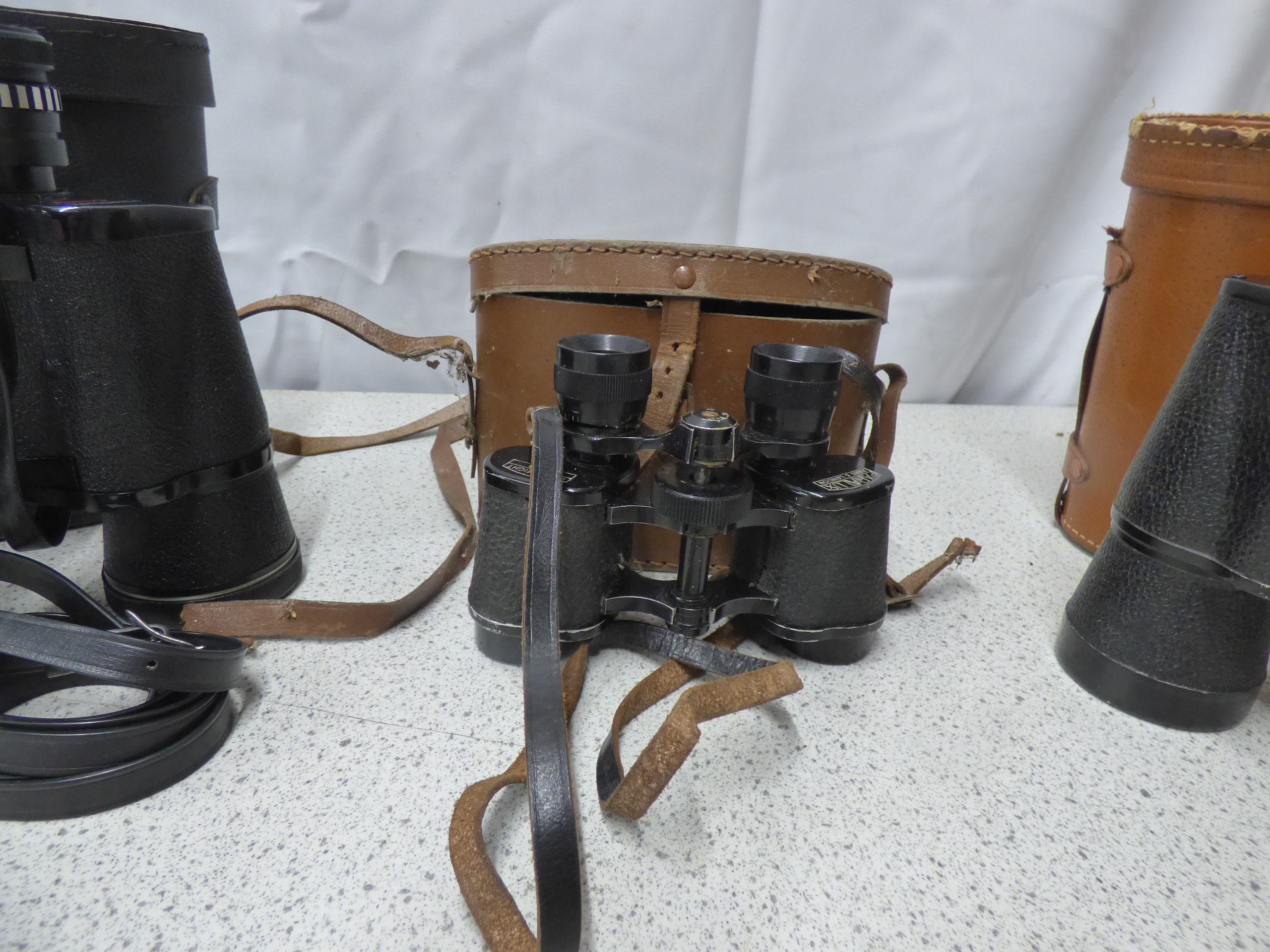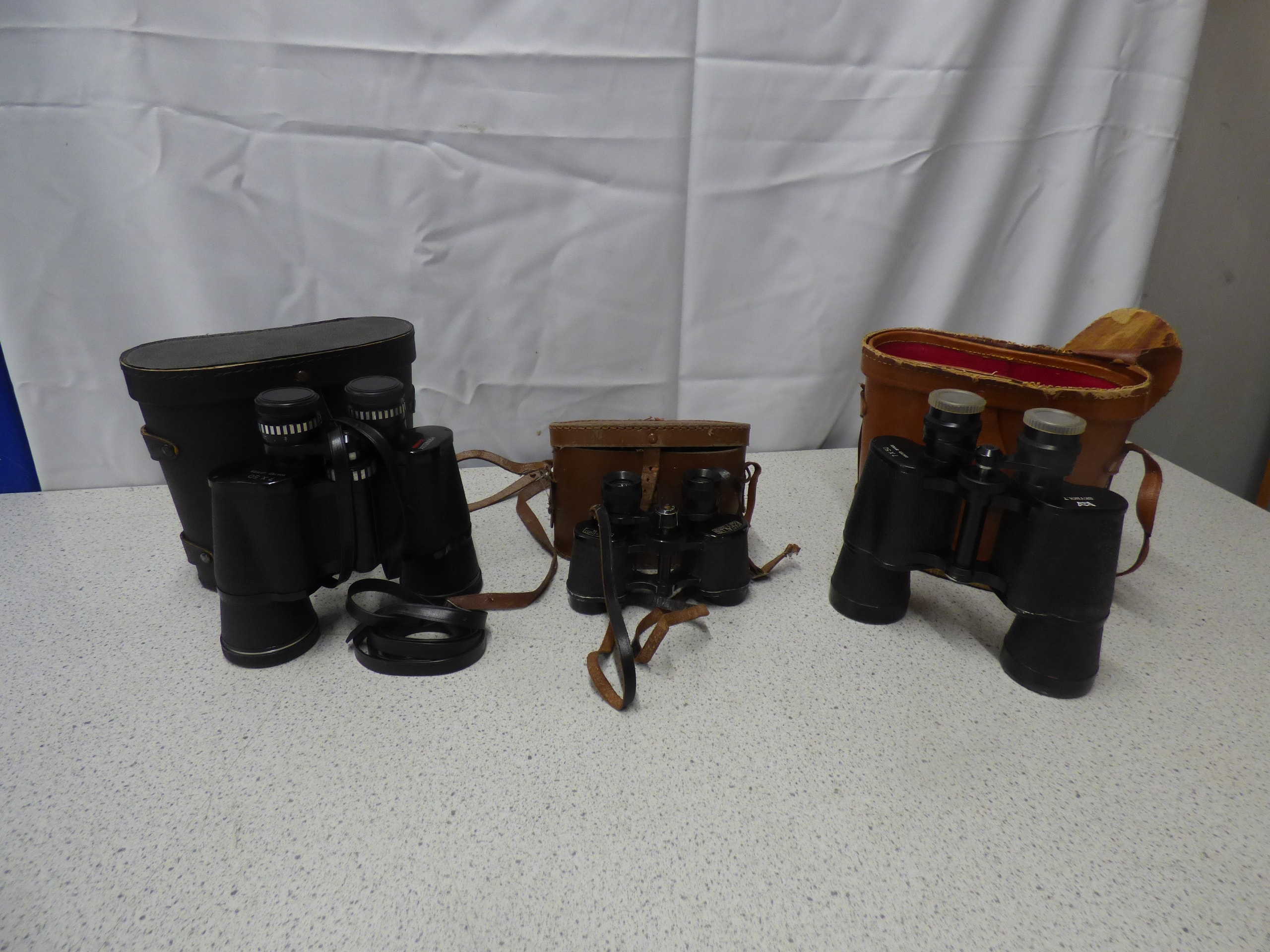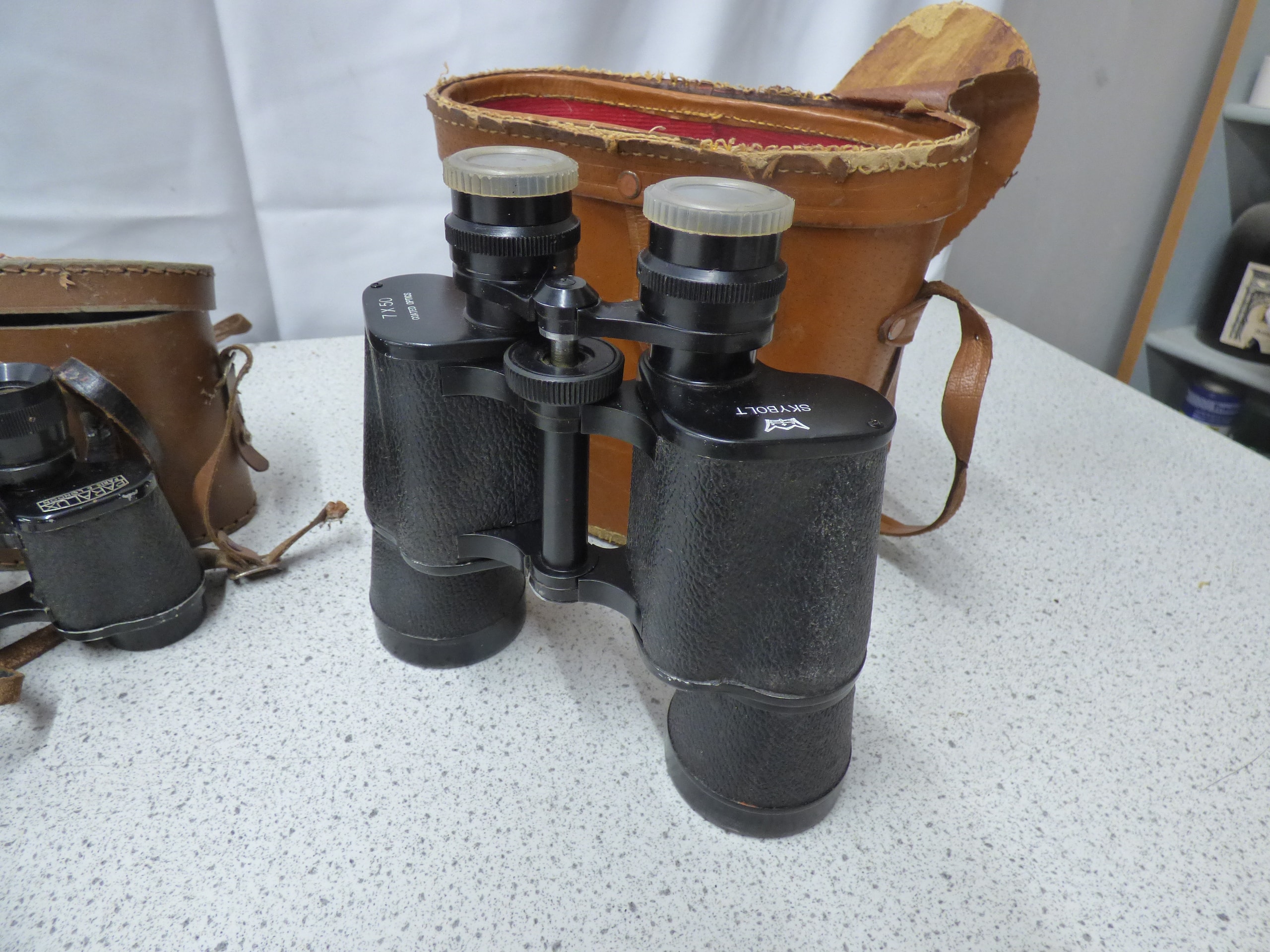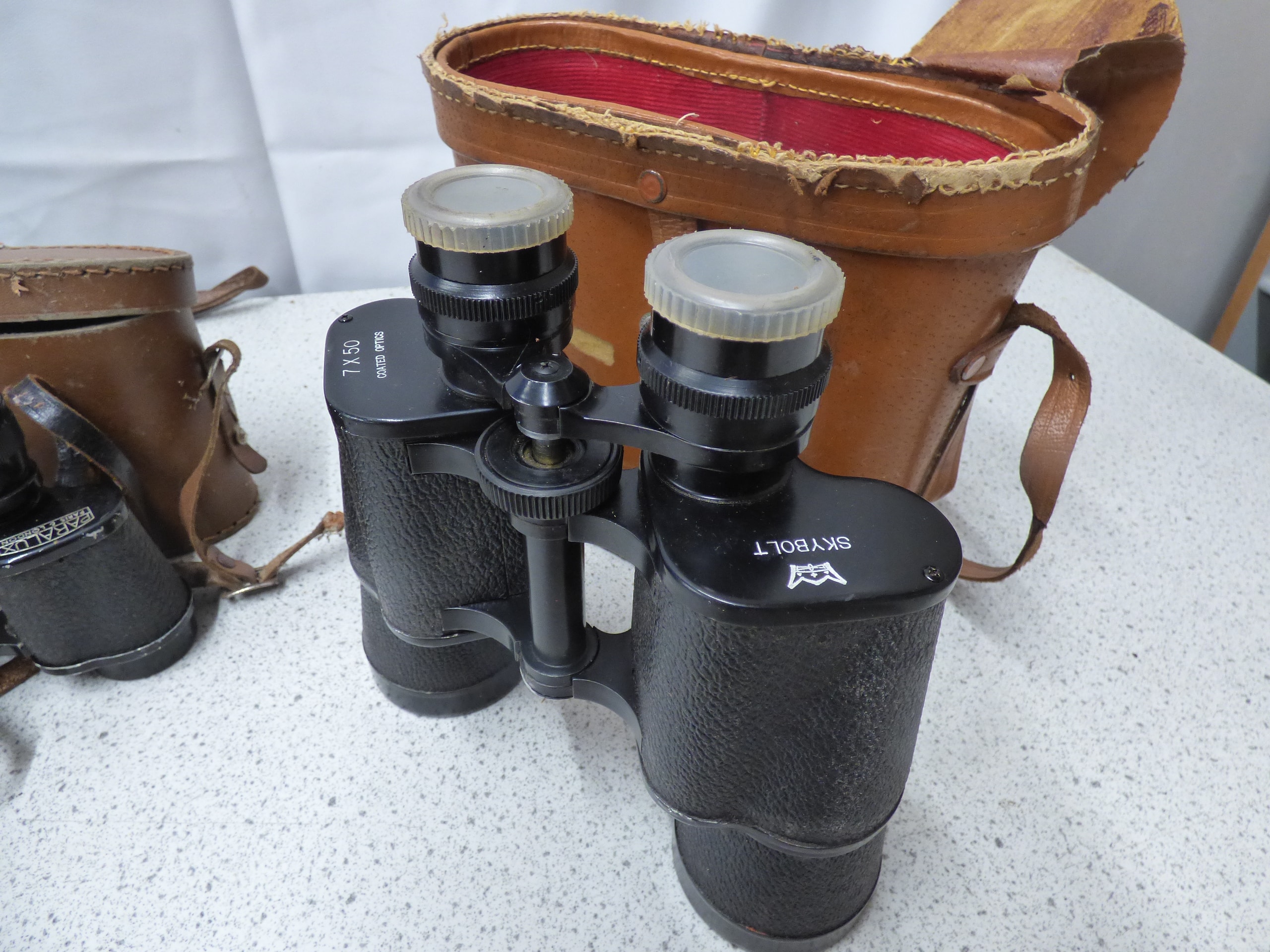 A black Prinzlux 7 X 50 binoculars, Paralux and Sky Bolt.