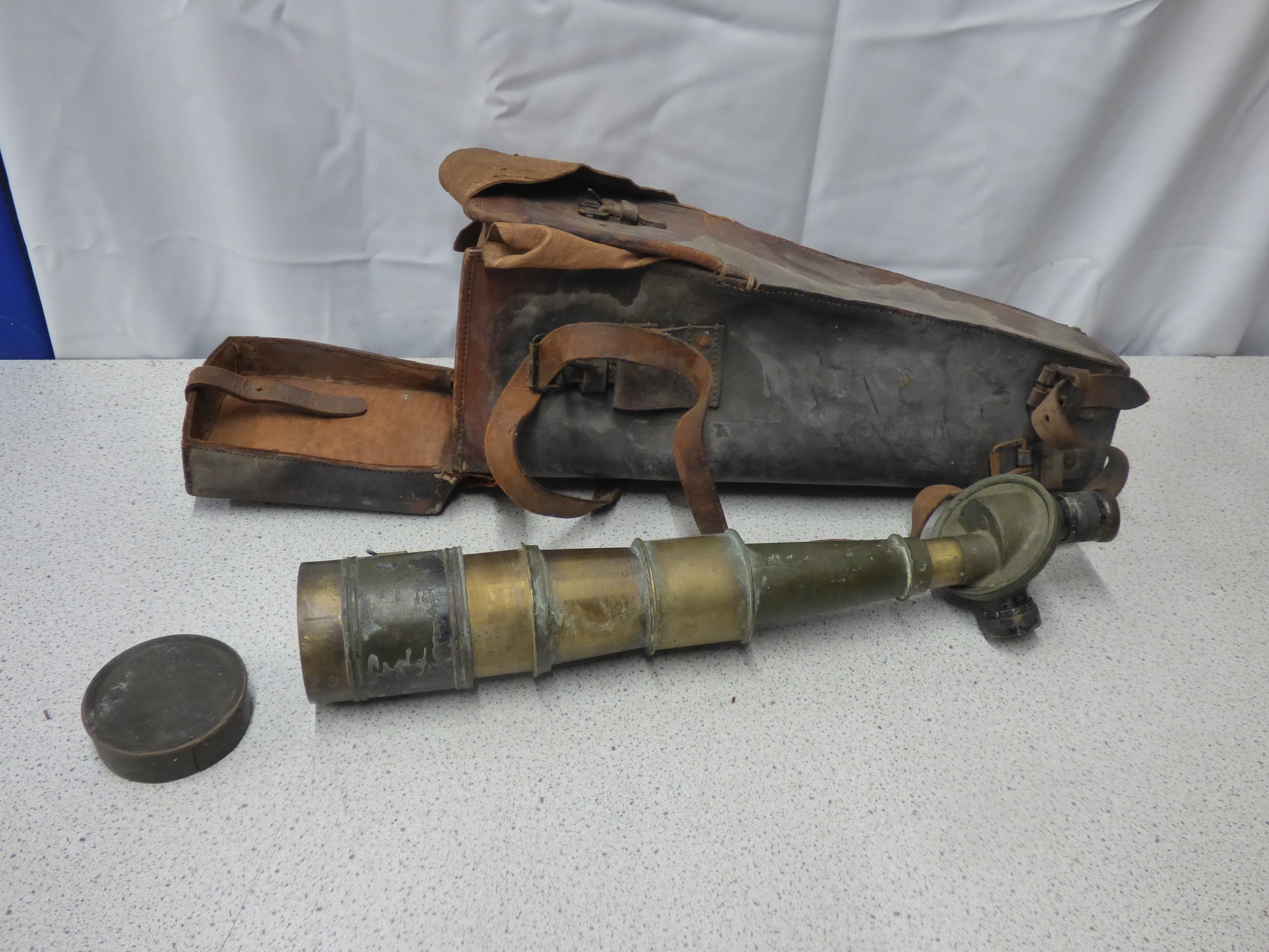 An antique military observation telescope by A. JOBIN, Paris, MODEL M.O.P.M.T., primarily dark green with brass accents, accompanied by a dark brown leather carrying case and a dark green lens cap. 1917, No.52165