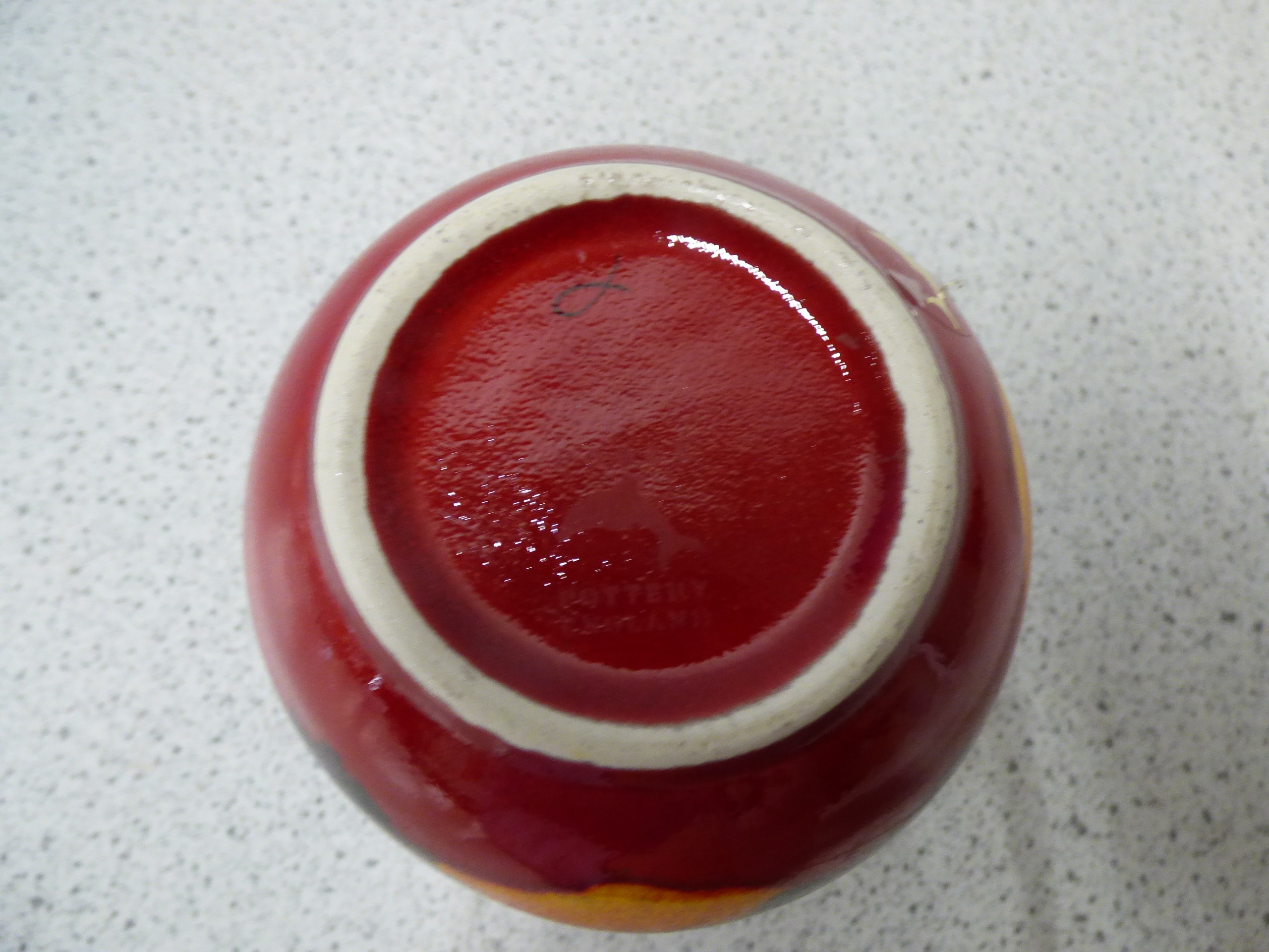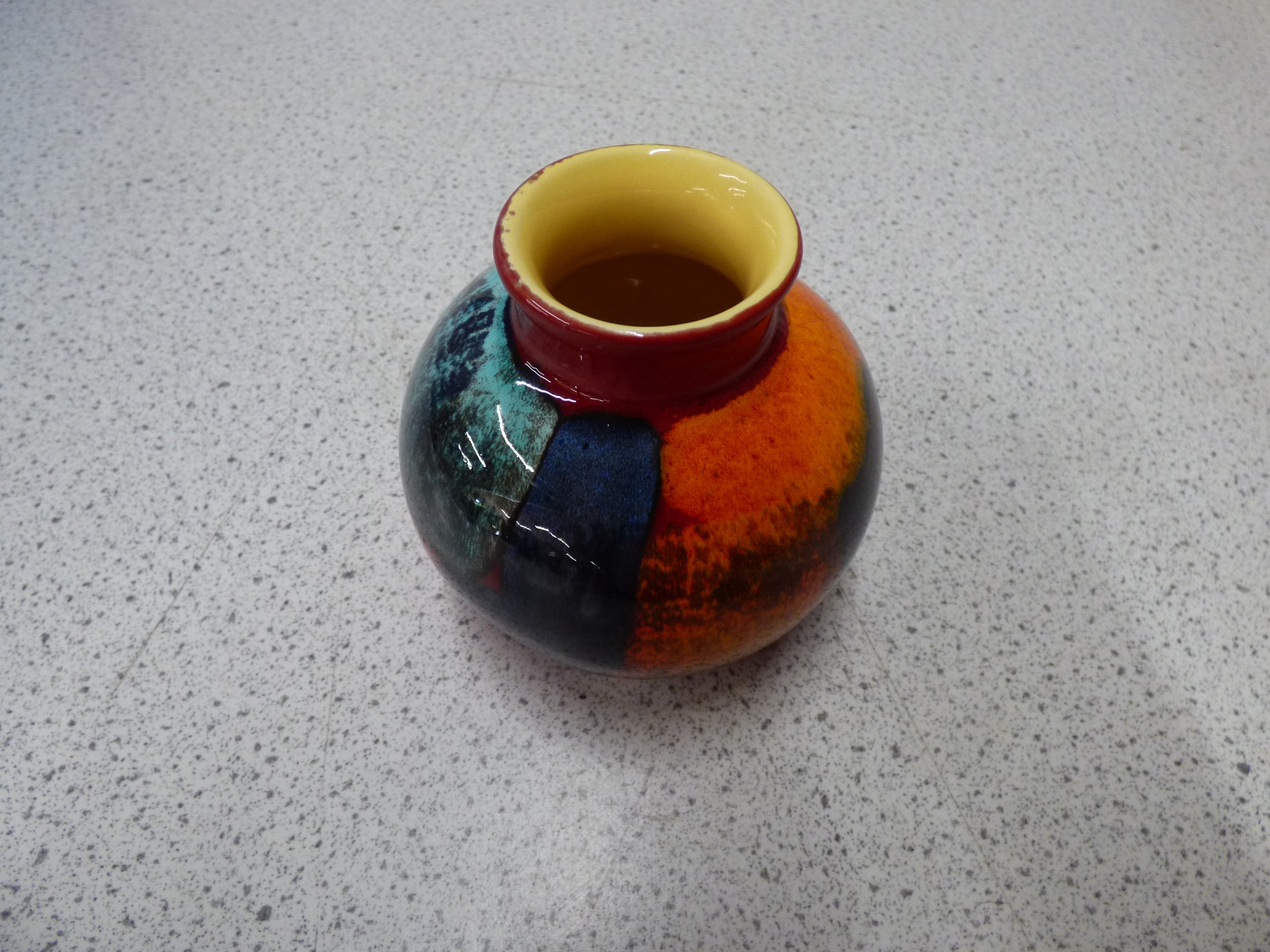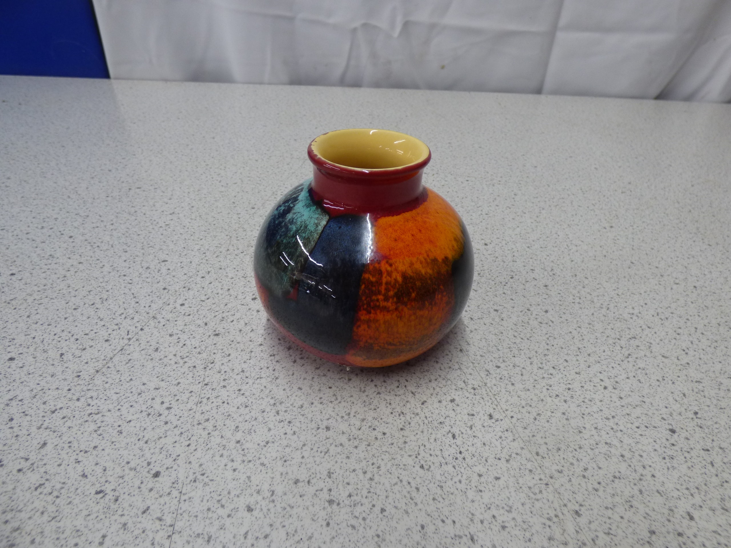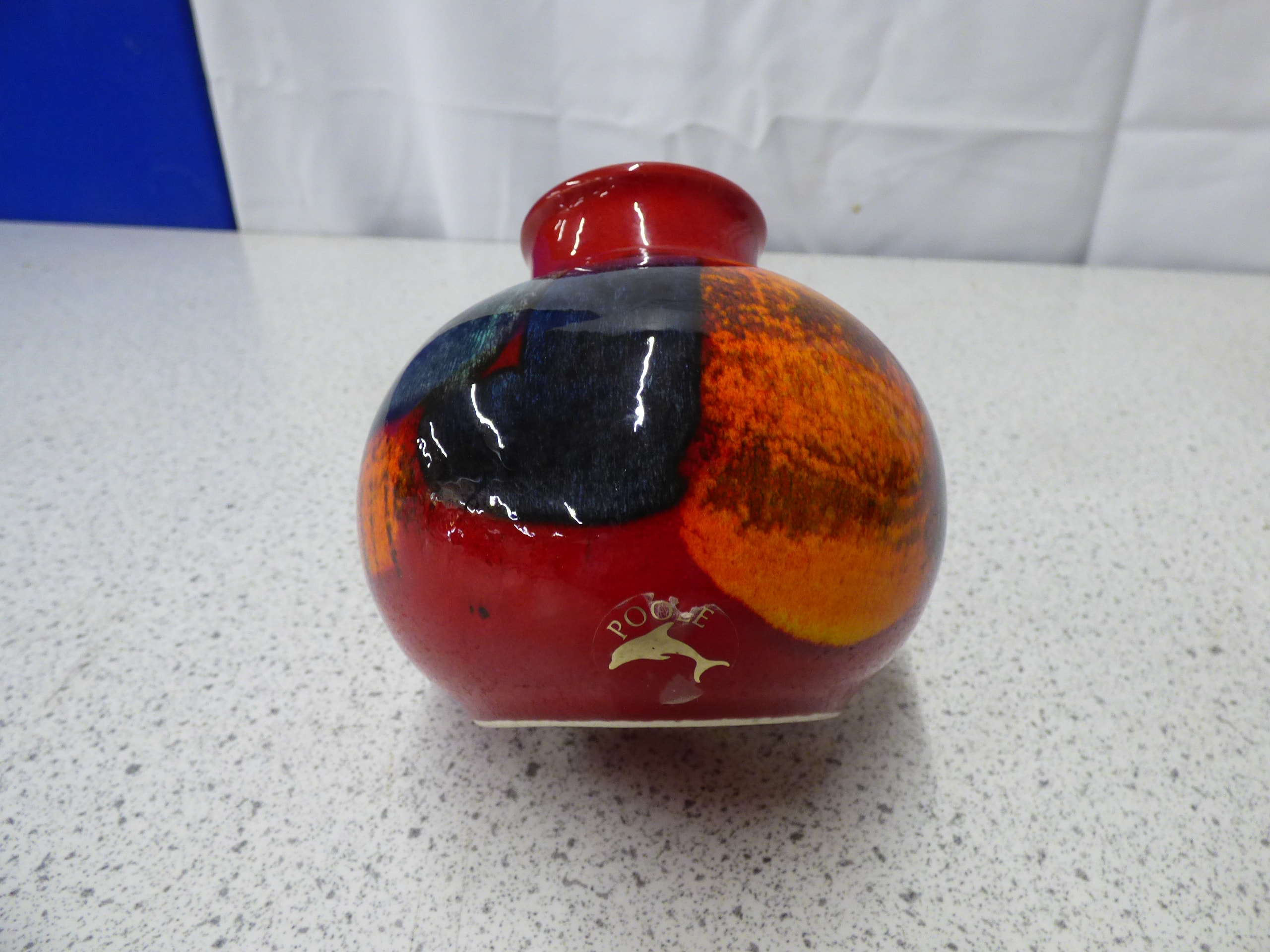 A spherical vase features a multi-coloured abstract glaze in red, orange, dark blue, and teal, with a cream interior, and is marked ‘POOLE’ with a golden dolphin logo and ‘POTTERY ENGLAND’ on its base. 11cm Tall
