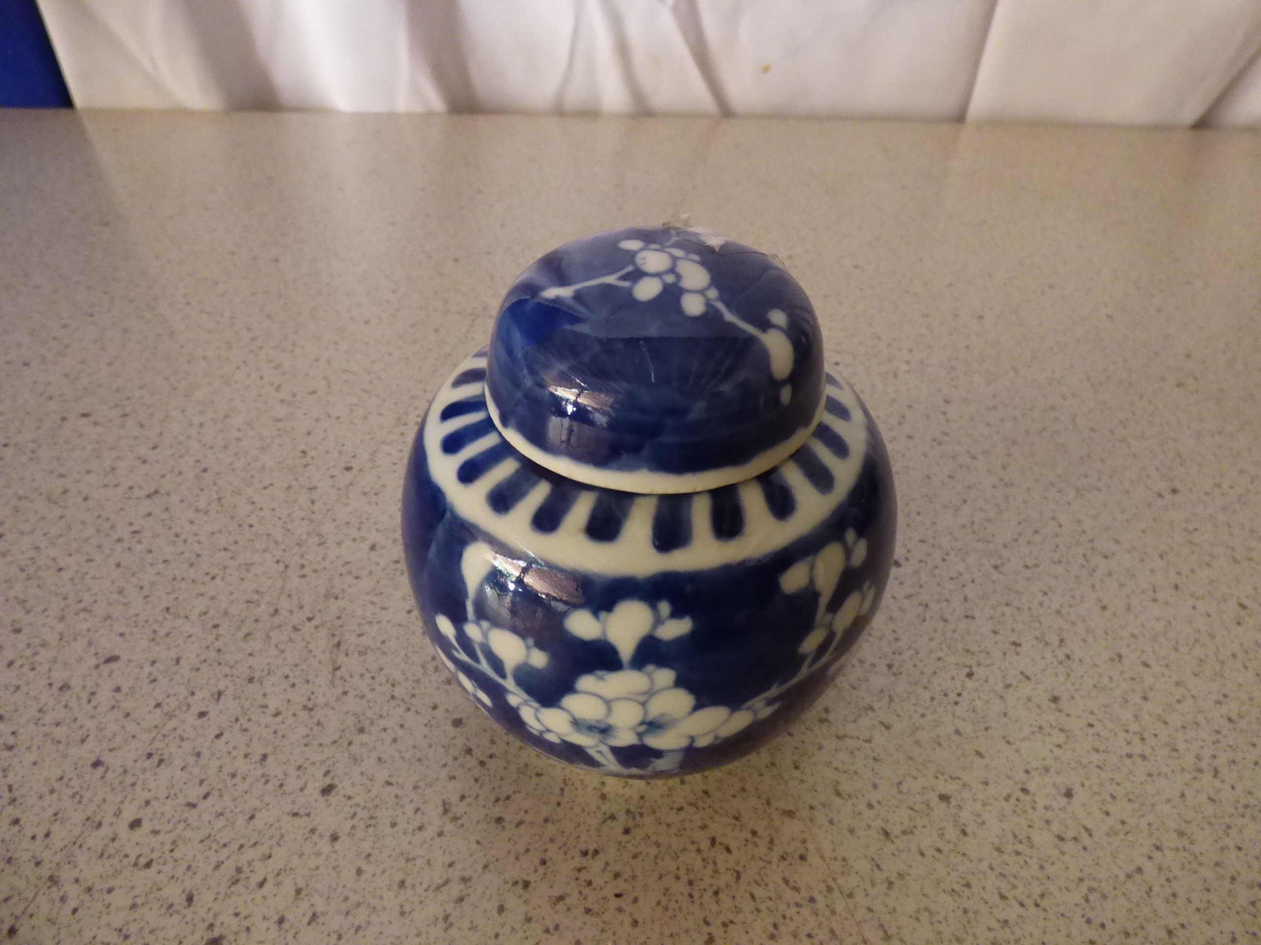 A Chinese blue and white Prunus ceramic lidded ginger jar, decorated with white floral patterns on a dark blue background and blue patterned bands.