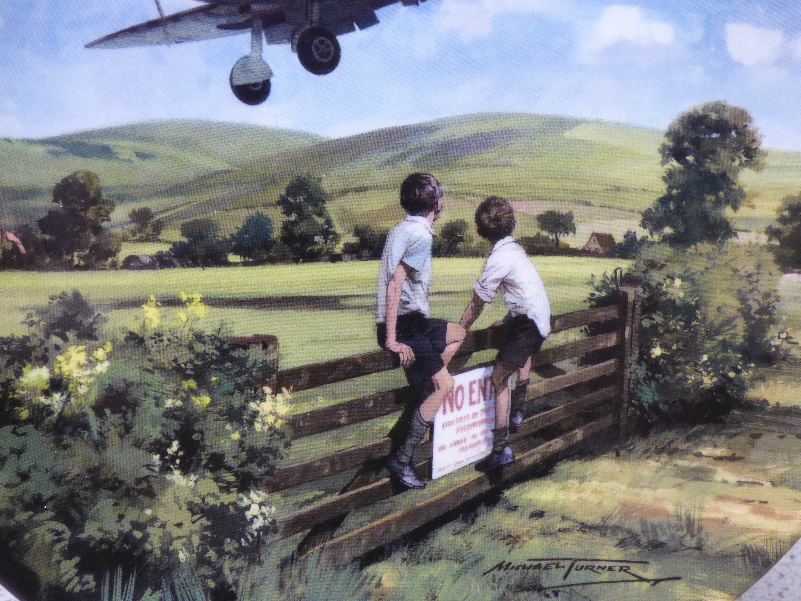 A multi-colour Royal Doulton collector’s plate, ‘Spitfire Coming Home’ from the ‘Heroes of the Sky’ series, depicting a green and brown Spitfire flying over a landscape with two boys, numbered 4160 G, Bradex No. 26-R62-52.1, dated MCMXCIII, reproducing artwork by Michael Turner, and includes a matching certificate.