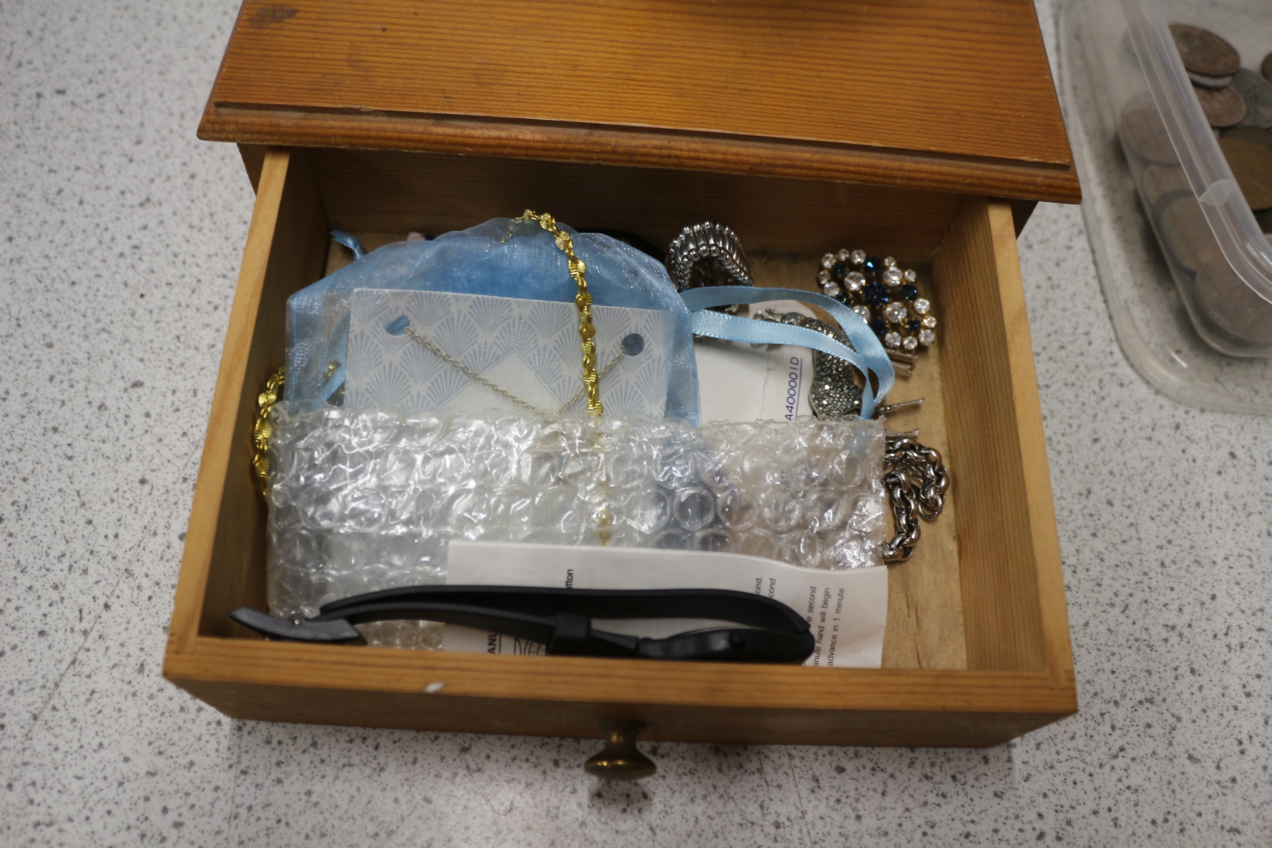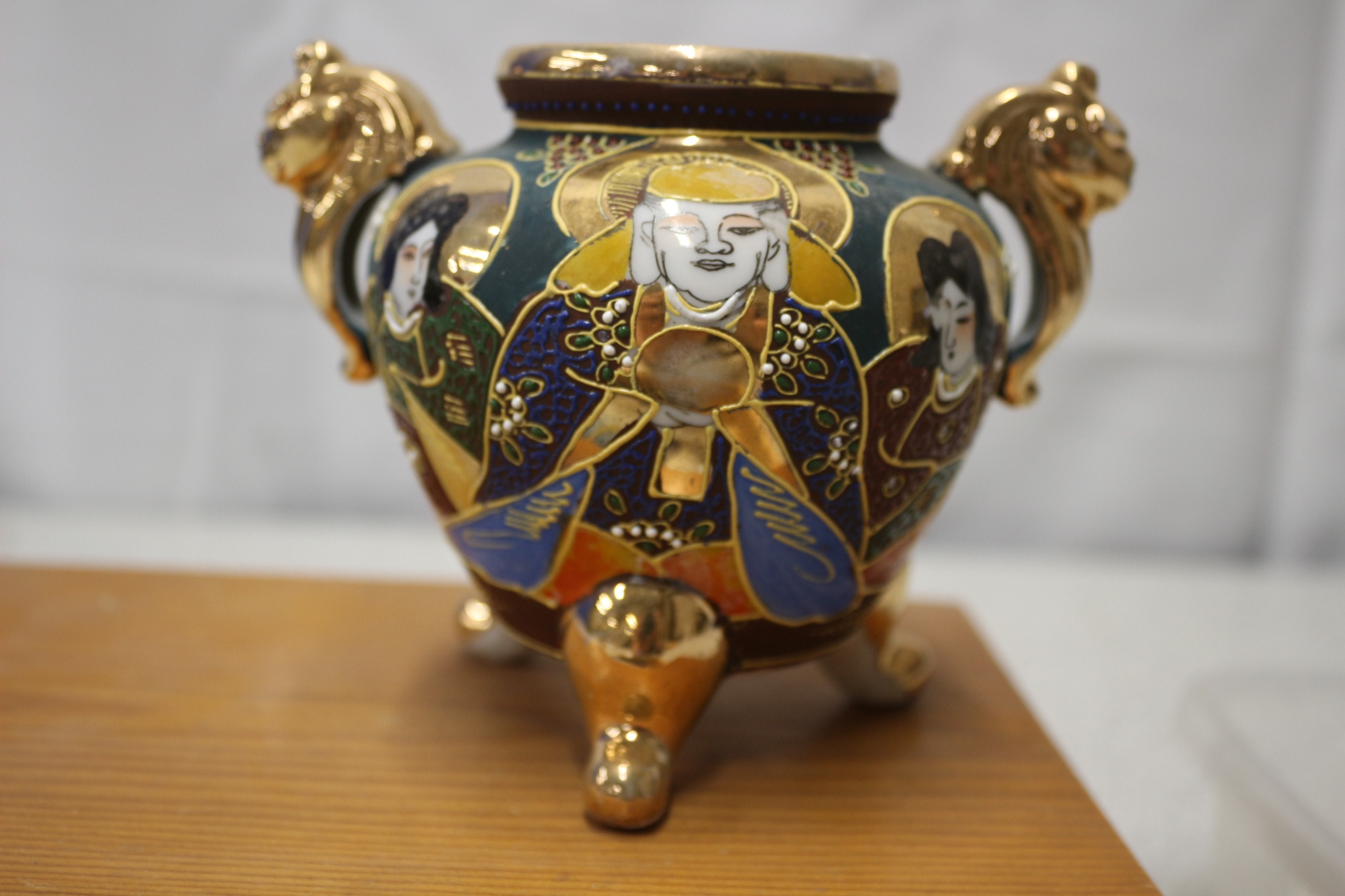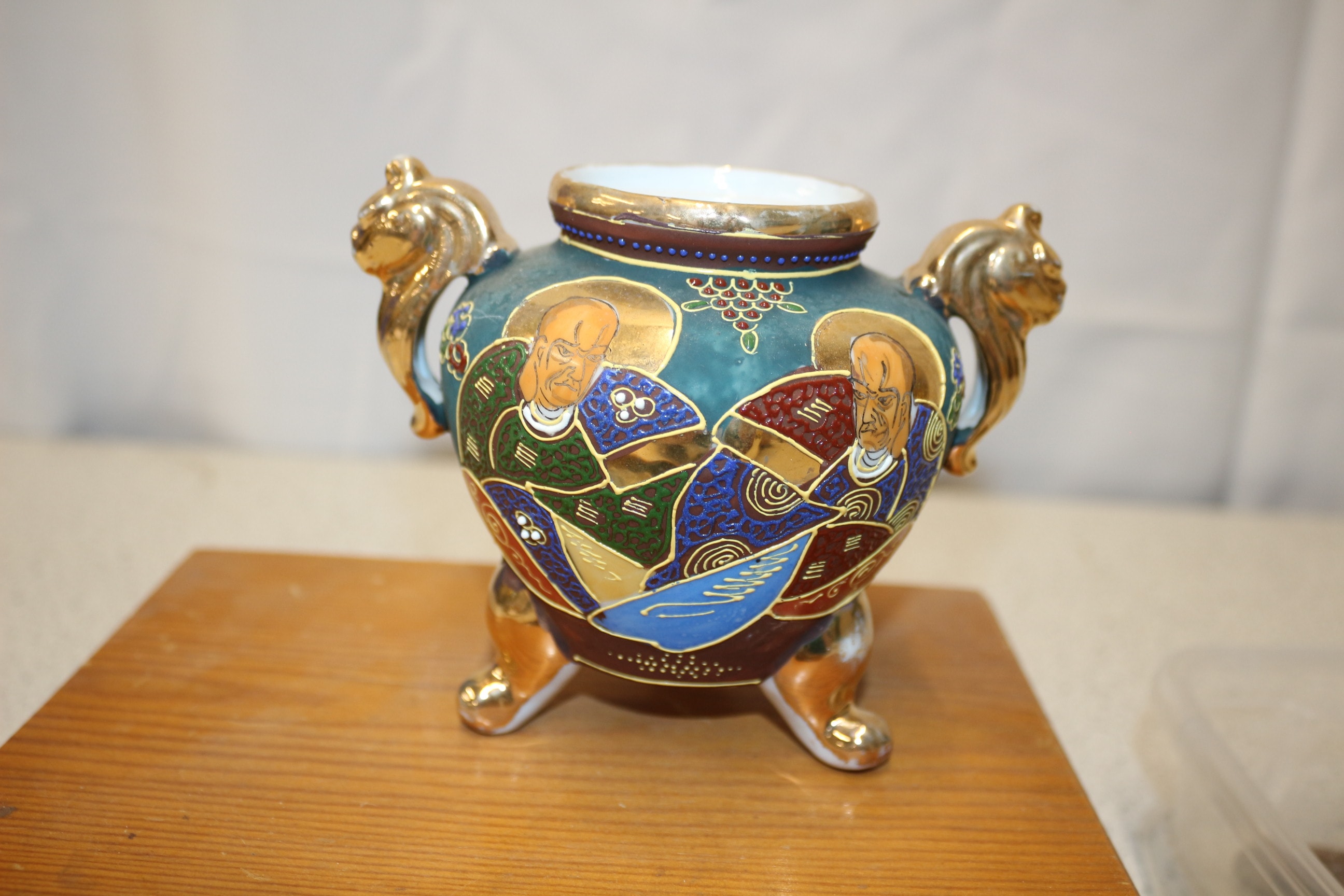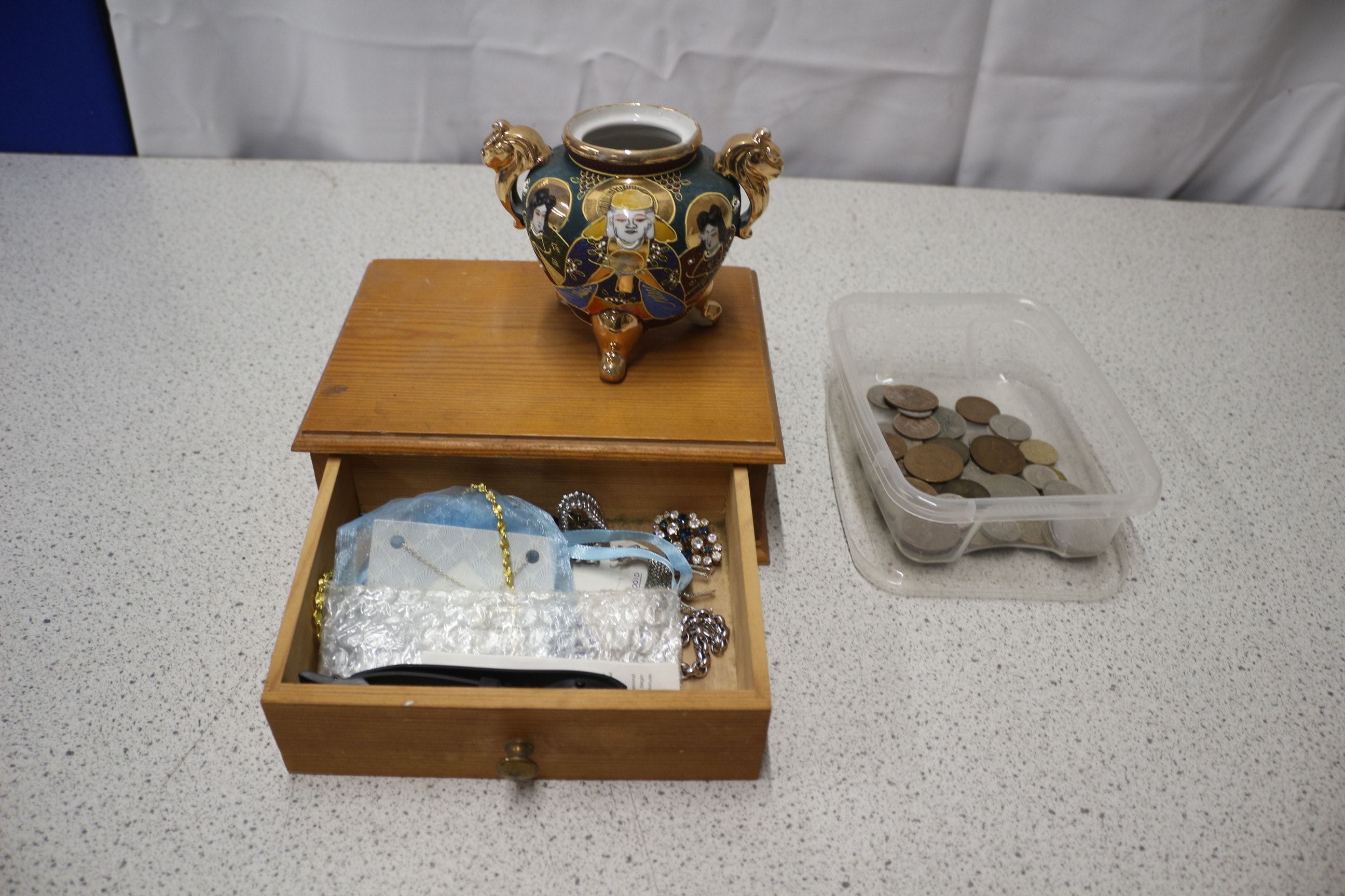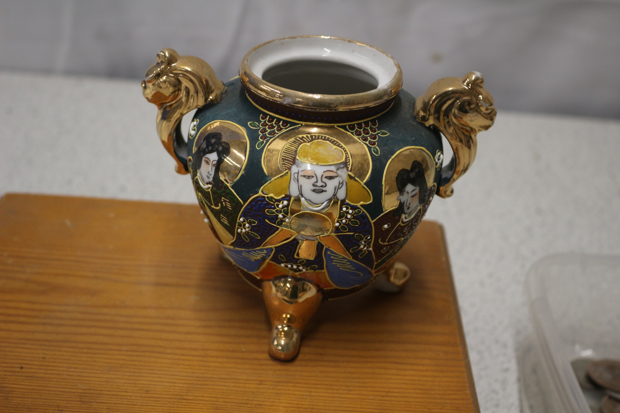 Mixed lot including An ornate, multi-coloured Satsuma vase/urn, predominantly green/teal and gold, features three golden lion-head handles/supports, three golden feet, and decorative painted figures. Costume Jewellery and coins