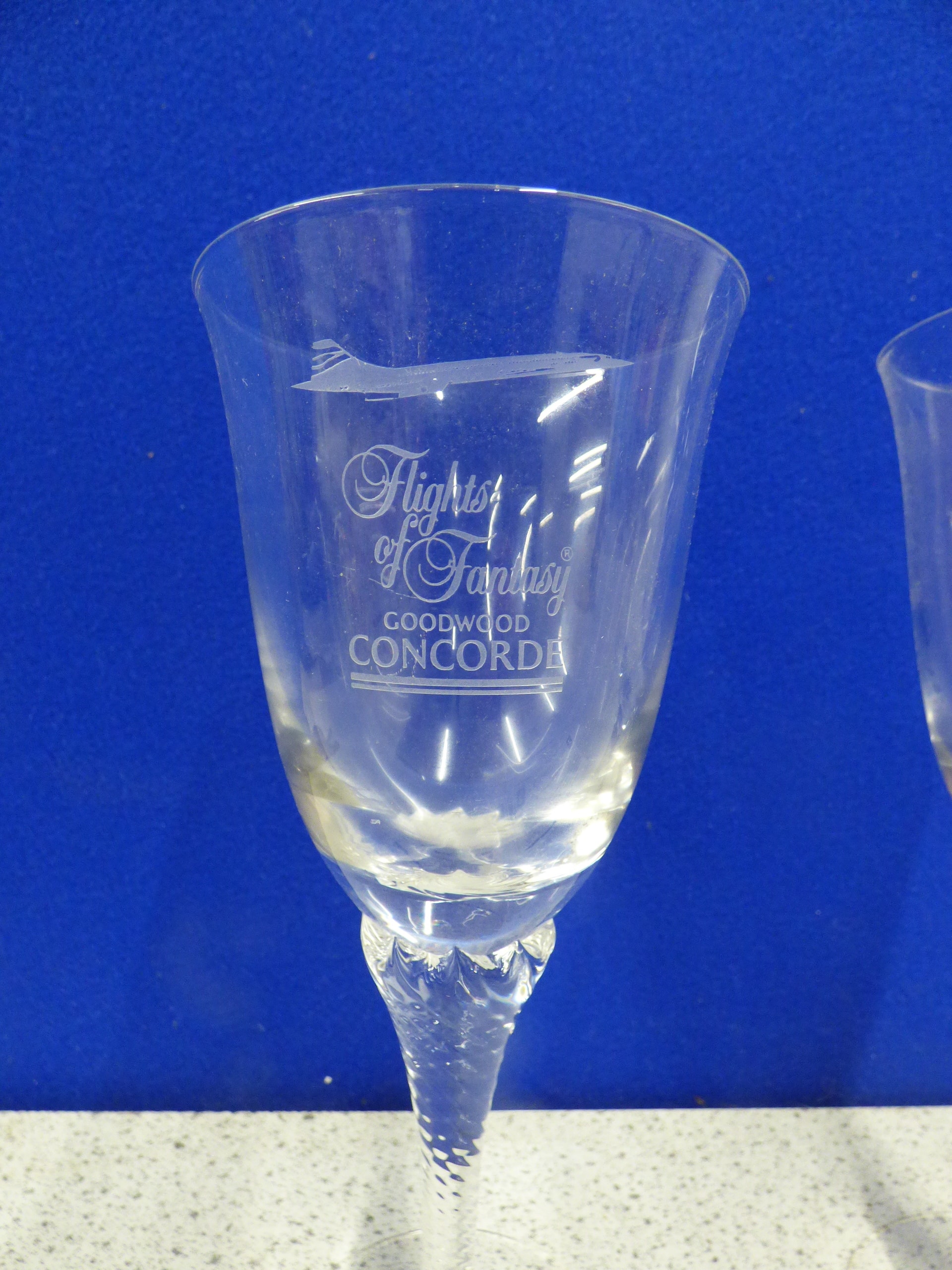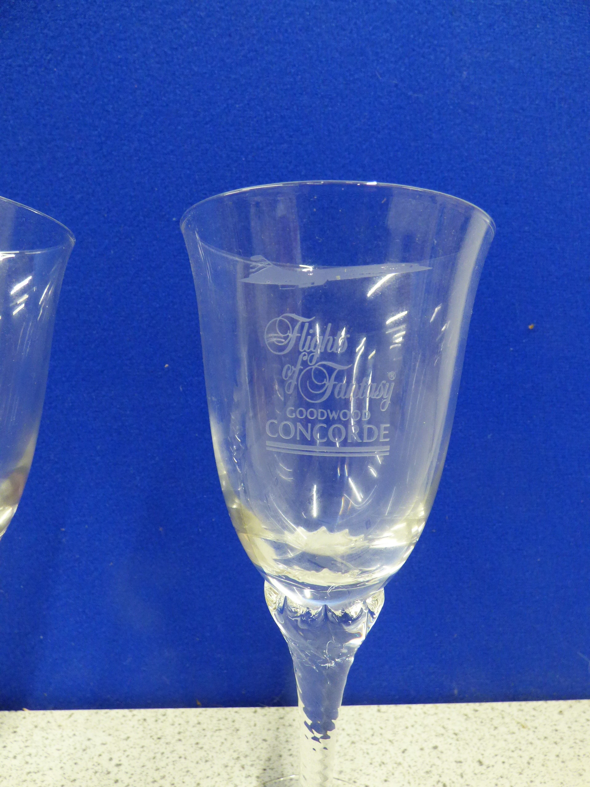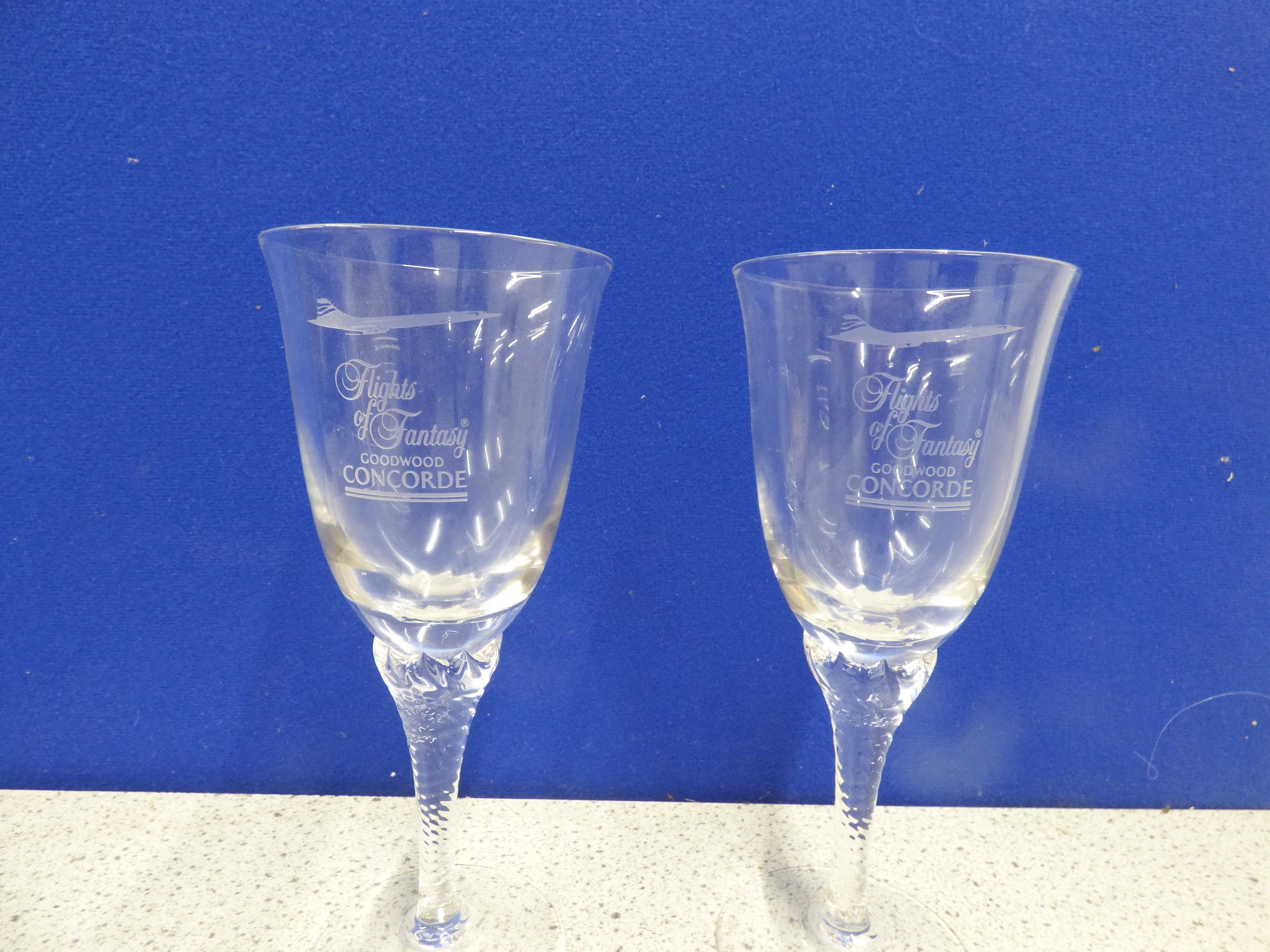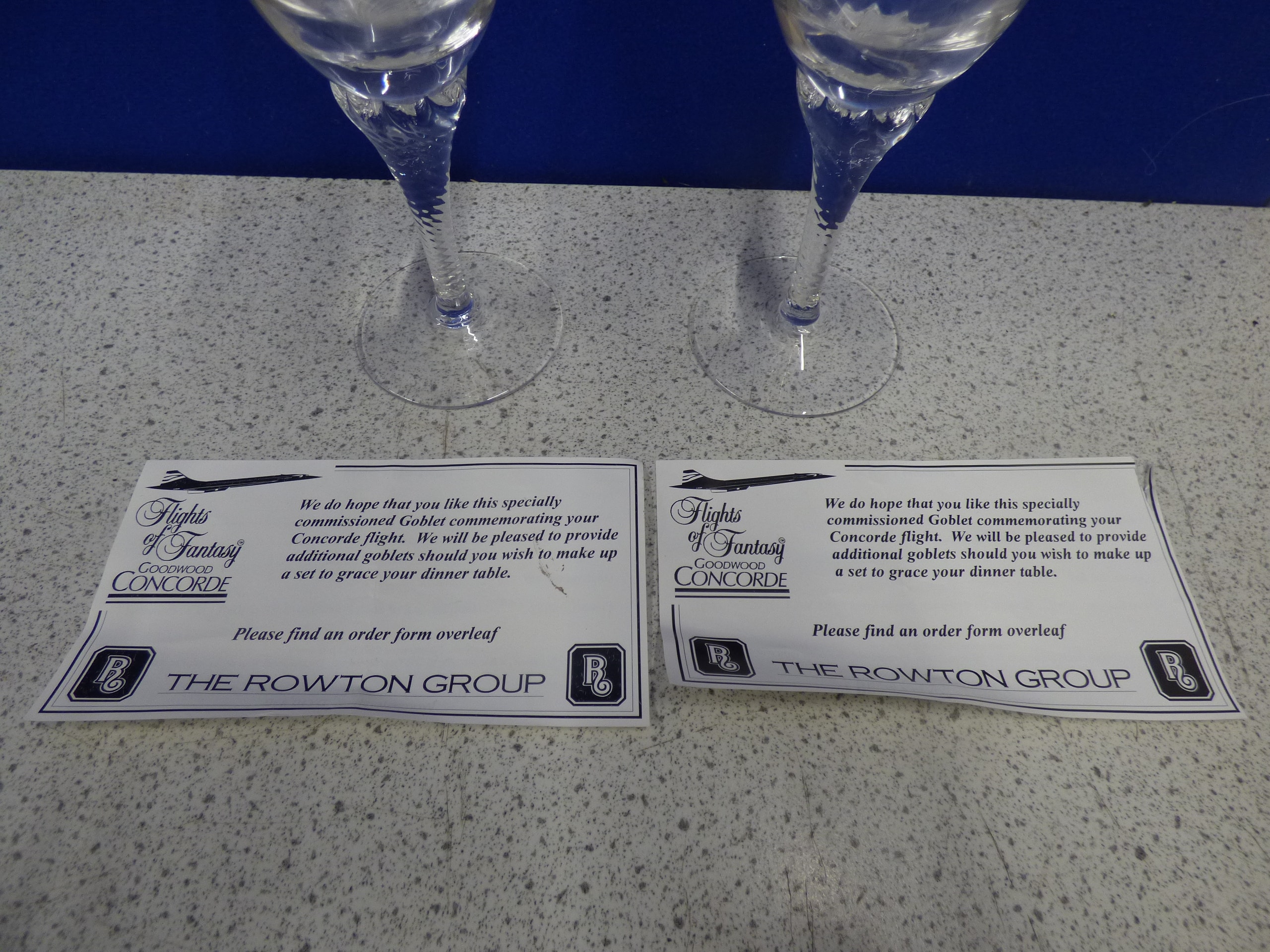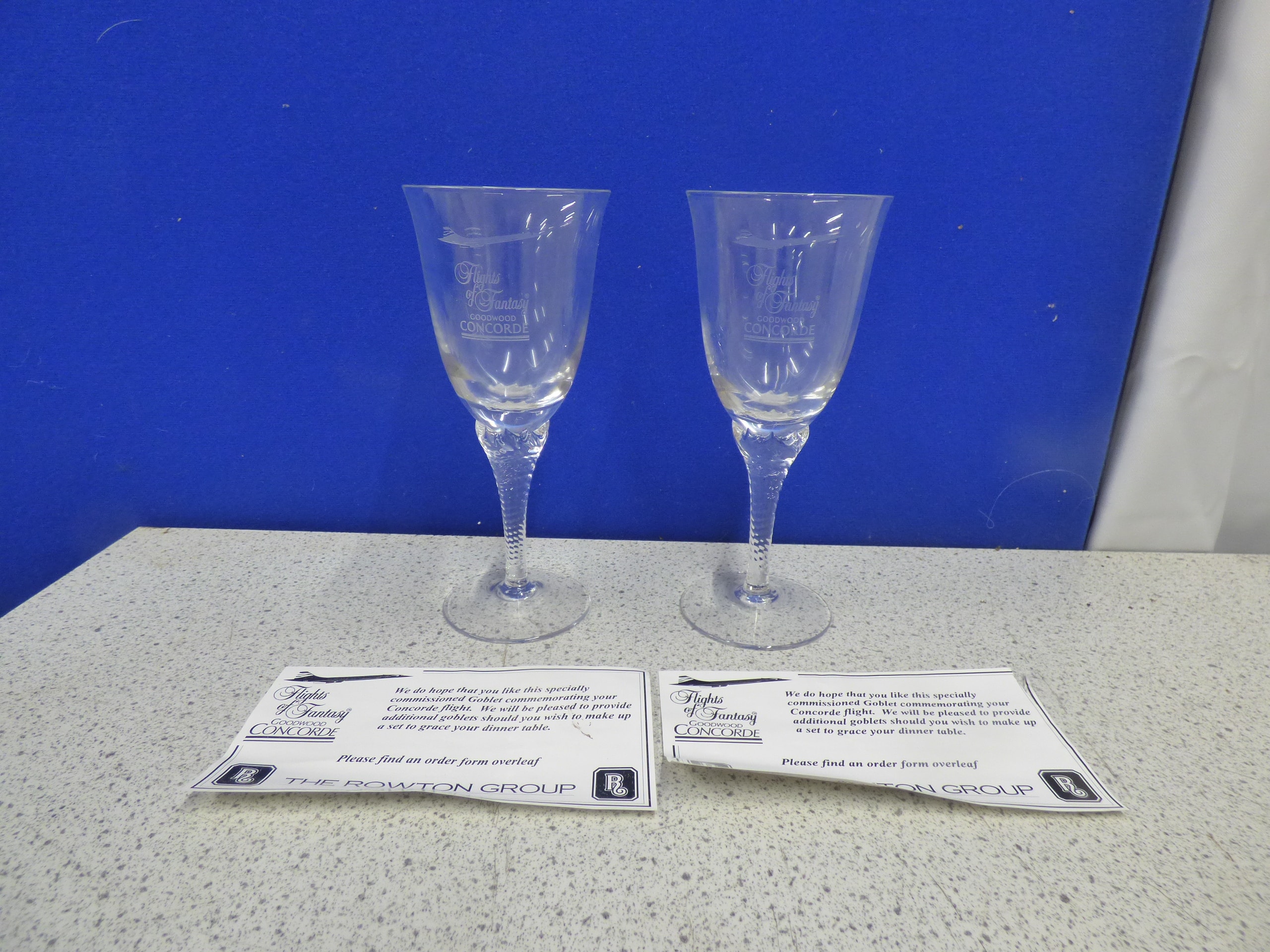 A pair of clear glass goblets, each engraved with ‘Flights of Fantasy, ‘ ‘GOODWOOD, ‘ and ‘CONCORDE’ with a Concorde airplane image, accompanied by two ‘THE ROWTON GROUP’ informational cards.