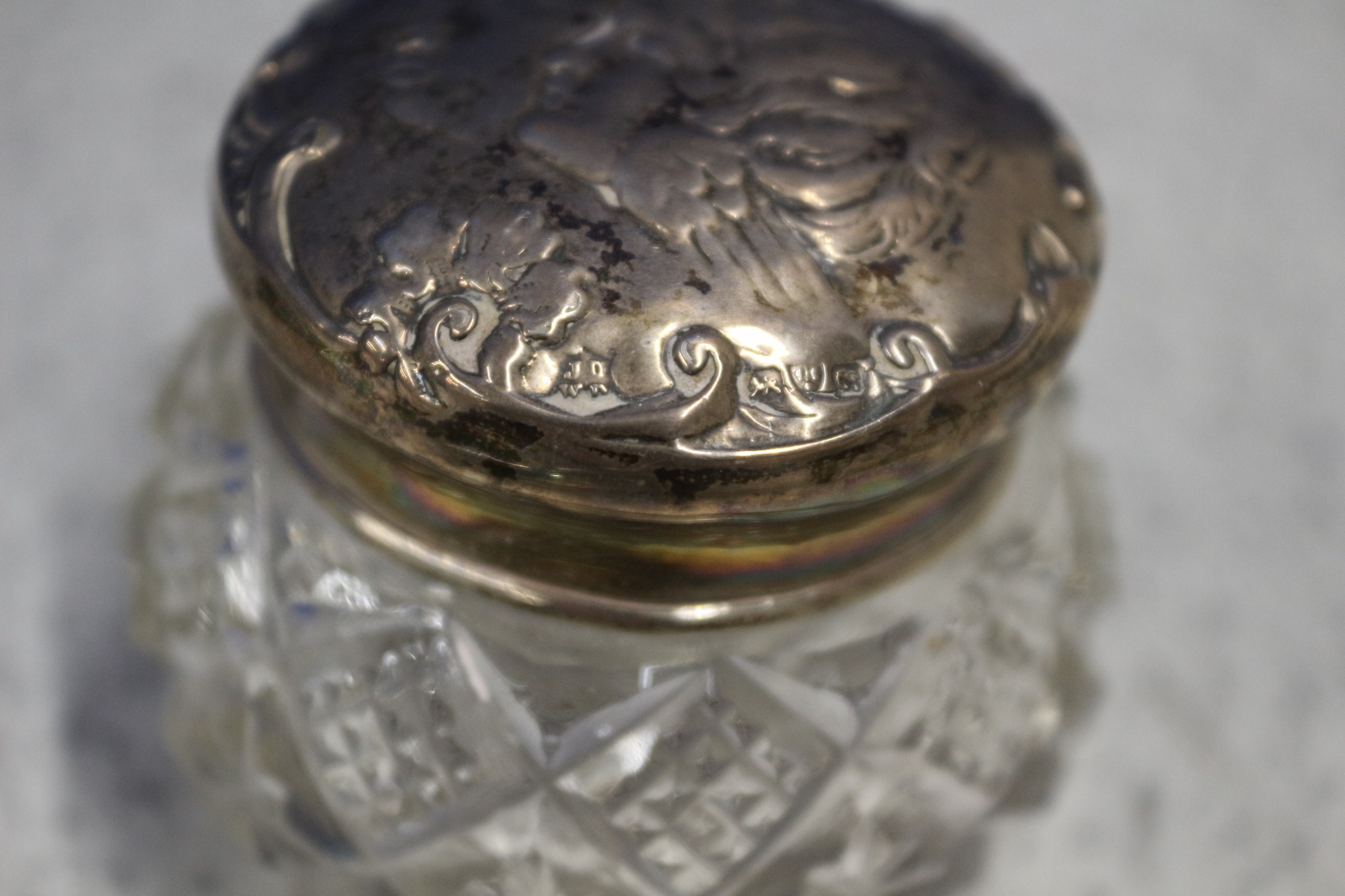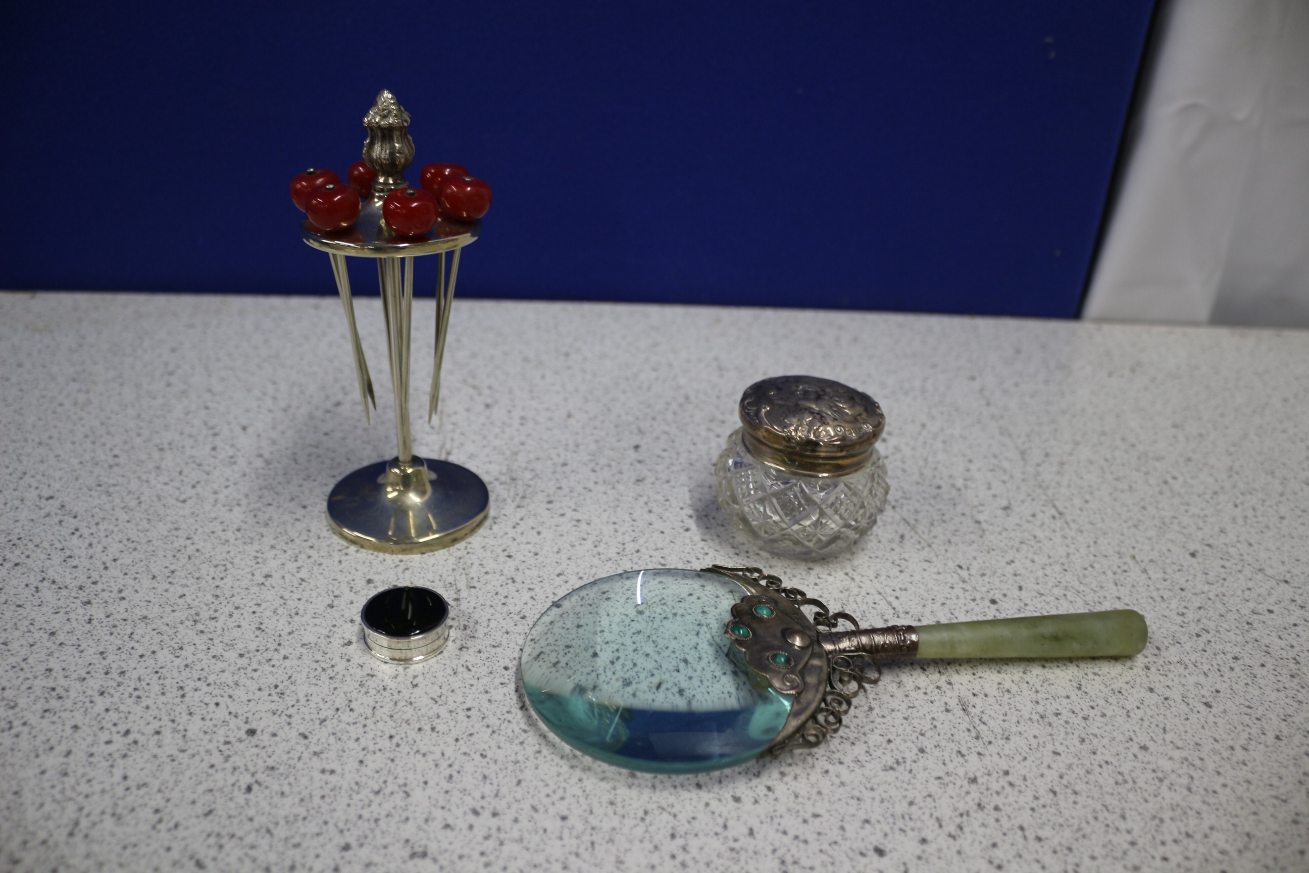 A silver-toned cocktail pick holder with six red apple-topped picks, a small silver lidded box with ‘G & S Co Ltd’ hallmarks, an ornate magnifying glass with a green jade-coloued handle, and a small clear cut-glass jar with a silver lid featuring lion passant, anchor, and date letter hallmarks.