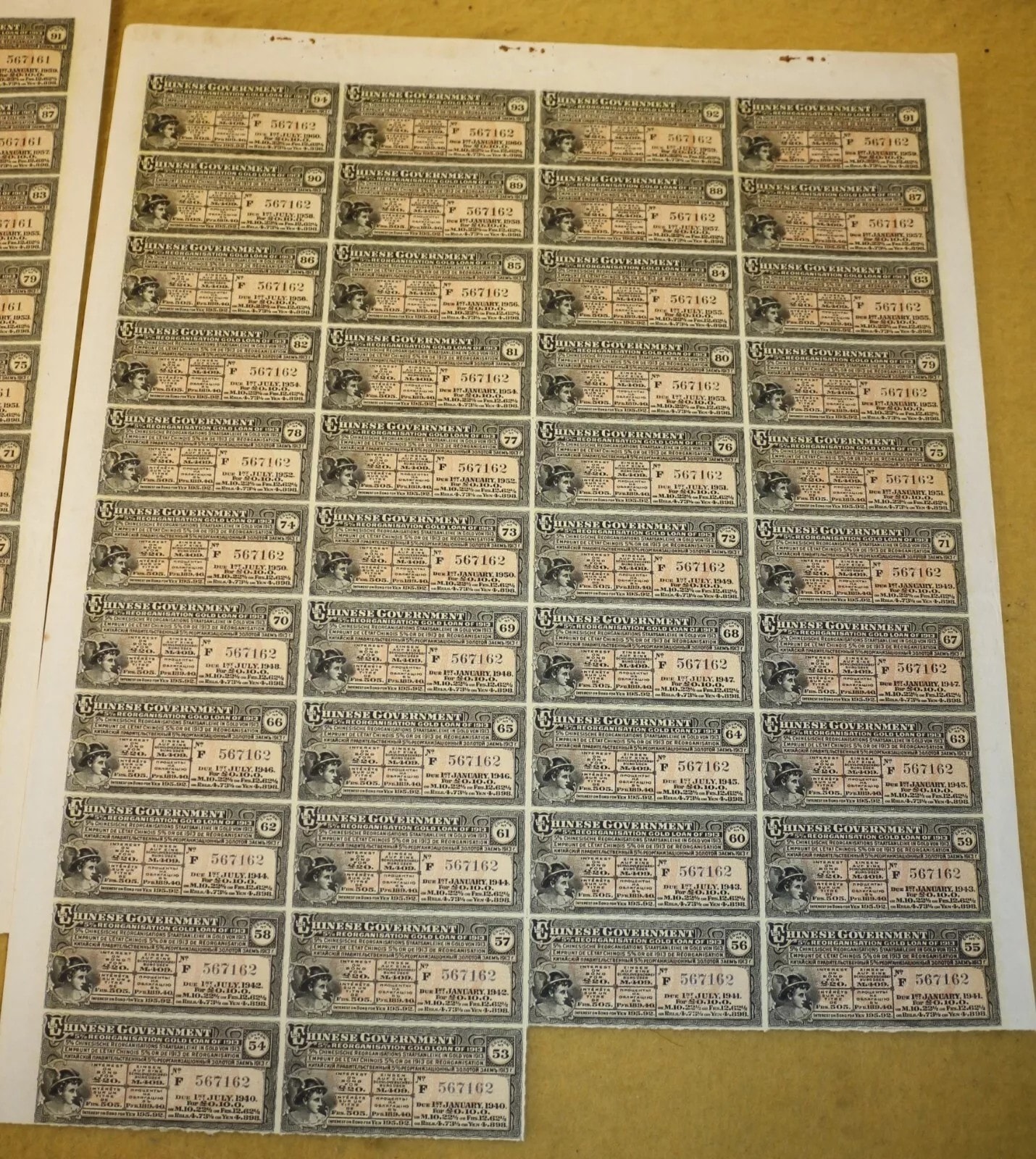 Three Chinese Government 5% Reorganisation Gold Loan of 1913 bonds, each valued at Frs. 505 (or equivalents in Sterling, Marks, Roubles, and Yen). The lot includes three sheets of corresponding, unsevered interest coupons. Printed on paper, the bonds feature an elaborate design with a central allegorical vignette and Chinese landscape scenes. They bear serial numbers 567160, 567161, and 567162. The documents are multilingual, presenting text in English, German, French, and Russian, and are marked with prominent red seals featuring Chinese characters, notably “中華民國之寶” (Seal of the Republic of China). Issued in 1913.