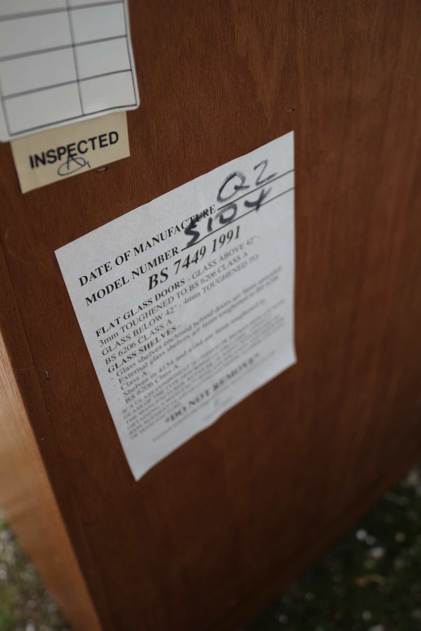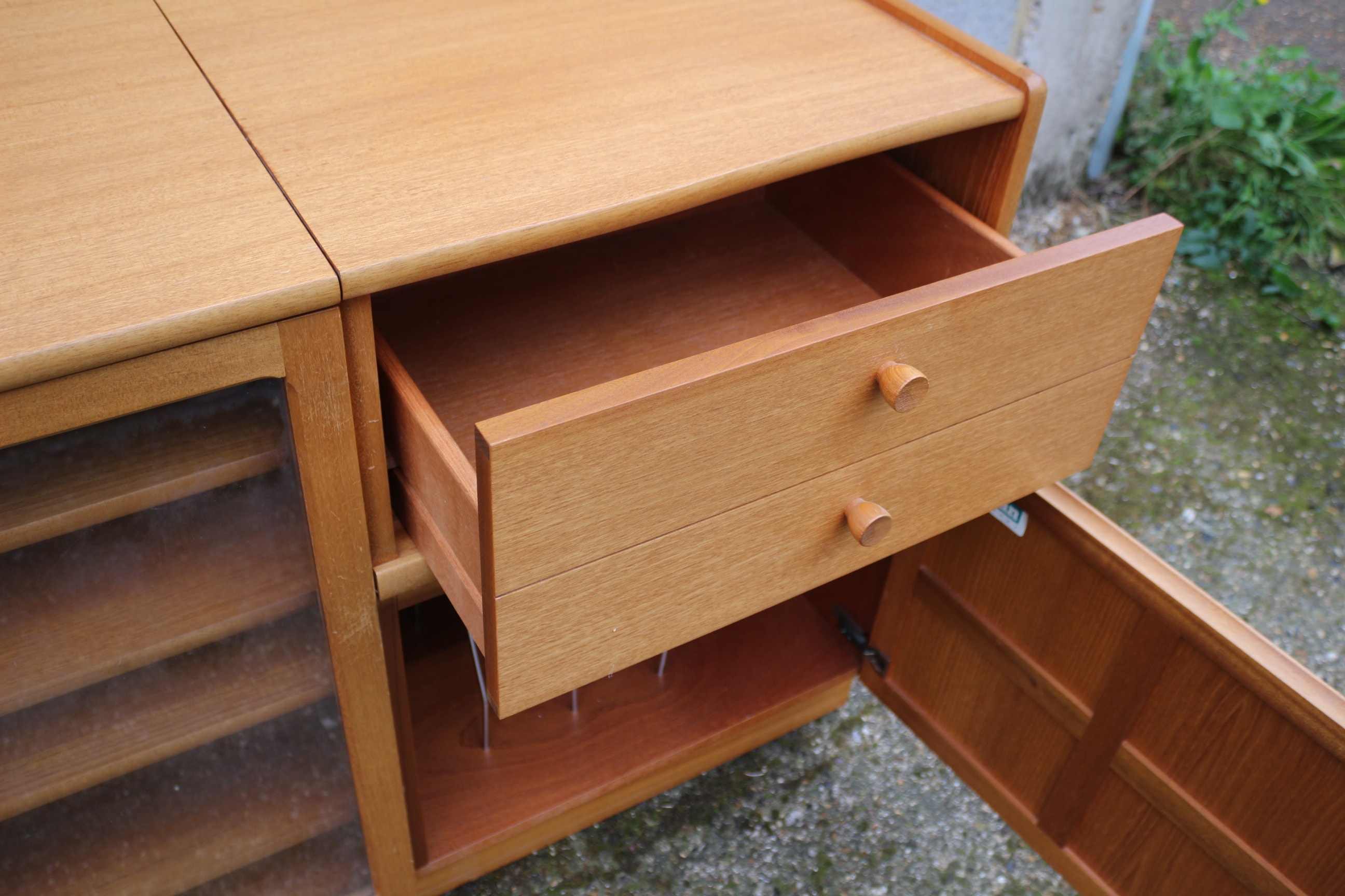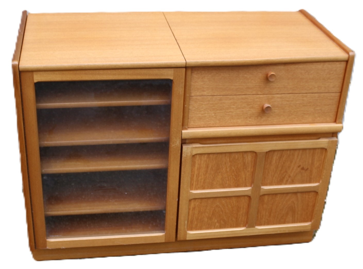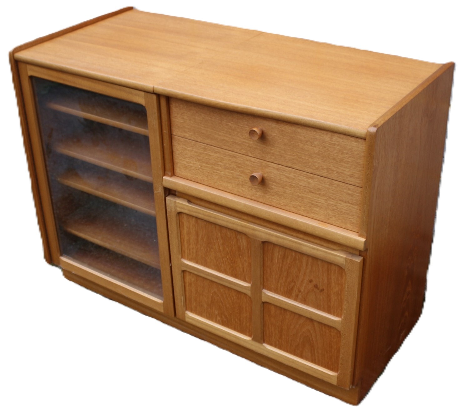 A Nathan Furniture Teak Sideboard, Model 5104, manufactured in Q2 1991, exhibiting a Mid-Century Modern aesthetic. Constructed from teak wood with glass elements, the unit features a composite design with a central seam across its top surface. The left section comprises a glass-fronted display cabinet with four internal shelves and lift up top. The right section provides two drawers with round wooden pulls positioned above a lower cabinet with a solid four-panel door, which contains metal dividers suitable for record storage. Labels on the reverse confirm the maker as ‘Nathan Furniture’, material as ‘TEAK UNIT’, and ‘MODEL NUMBER: 5104’, alongside a manufacturing date of Q2 1991 referencing British Standard 7449 1991. 99.5x46cm 75cm Tall
