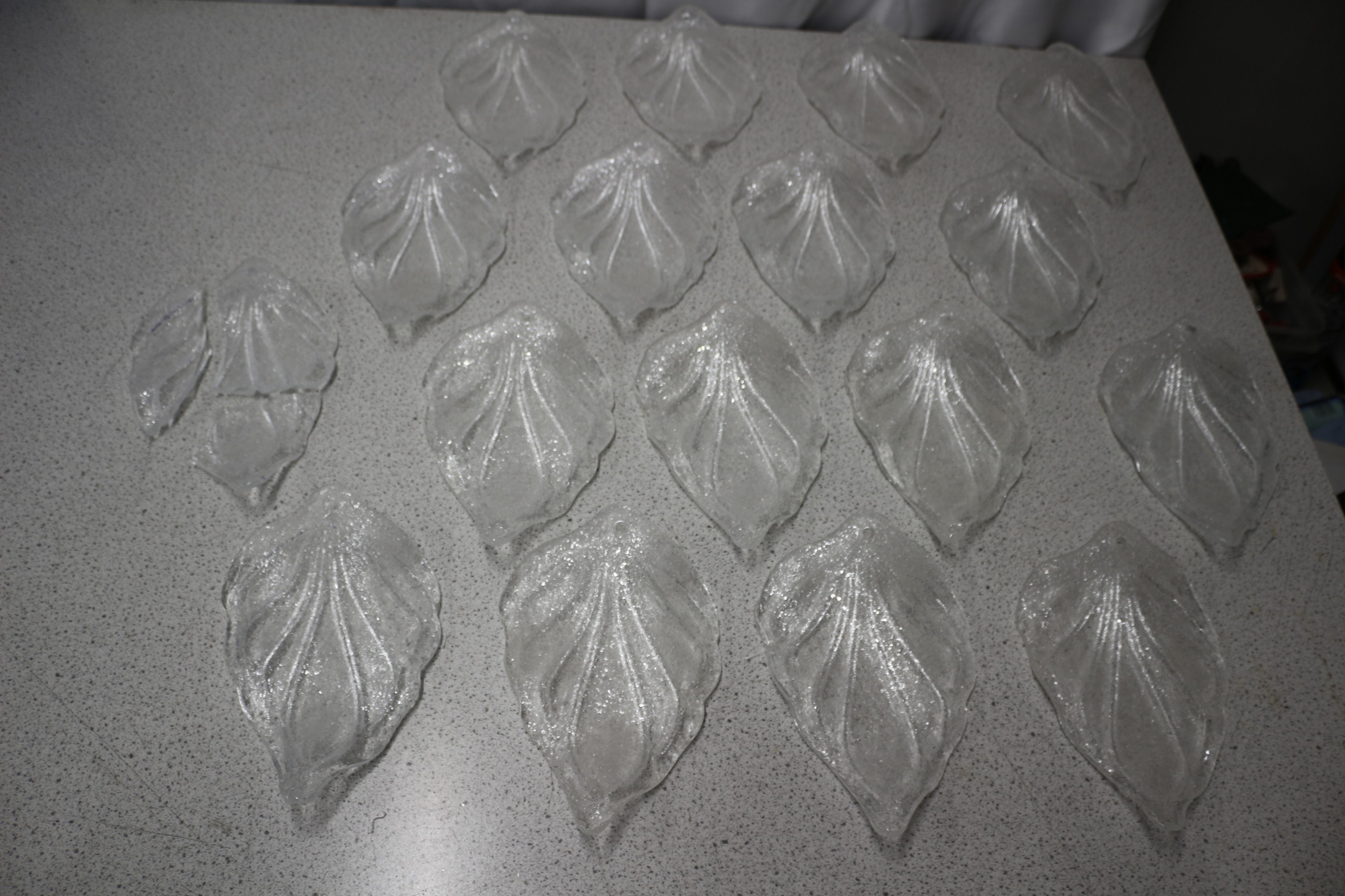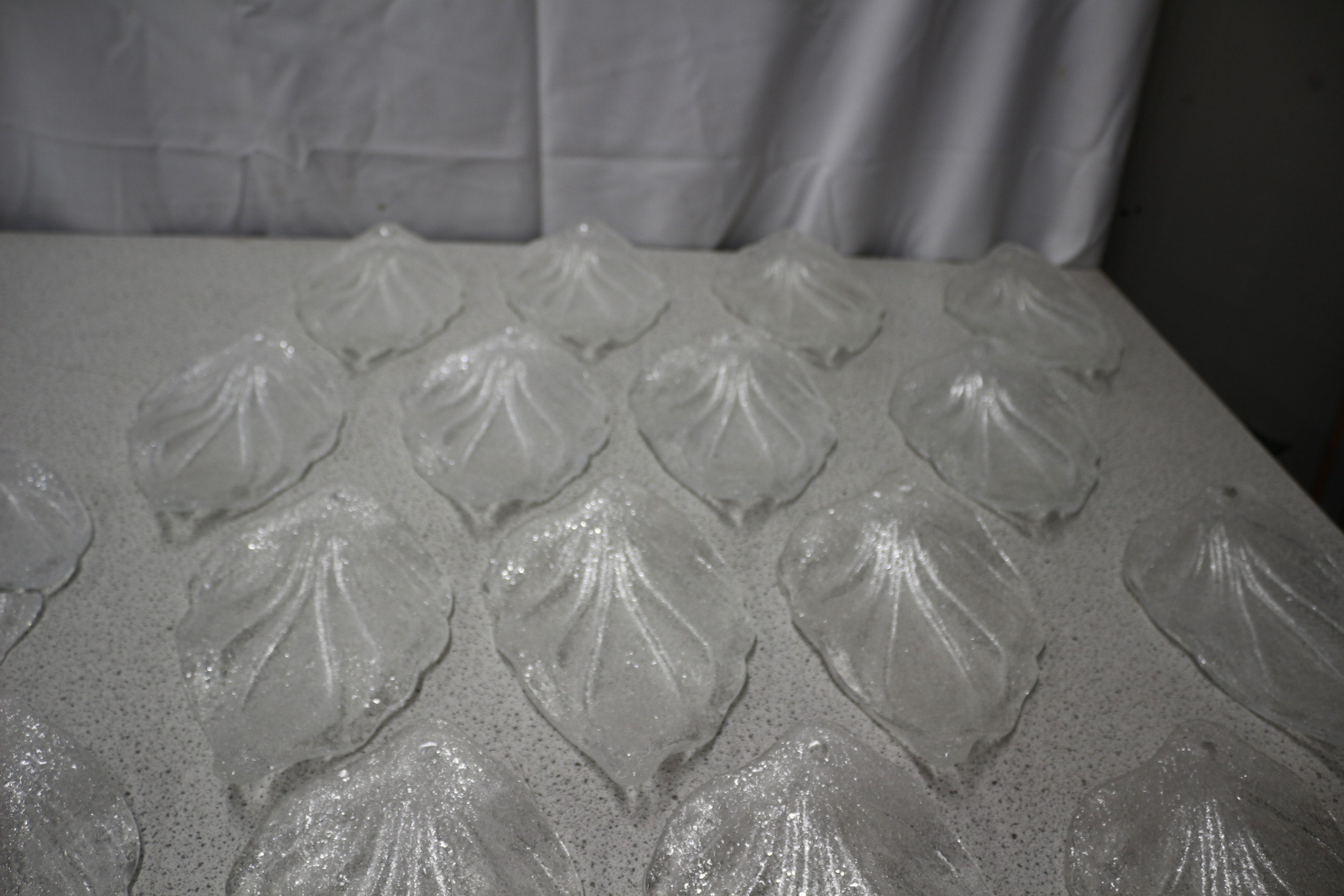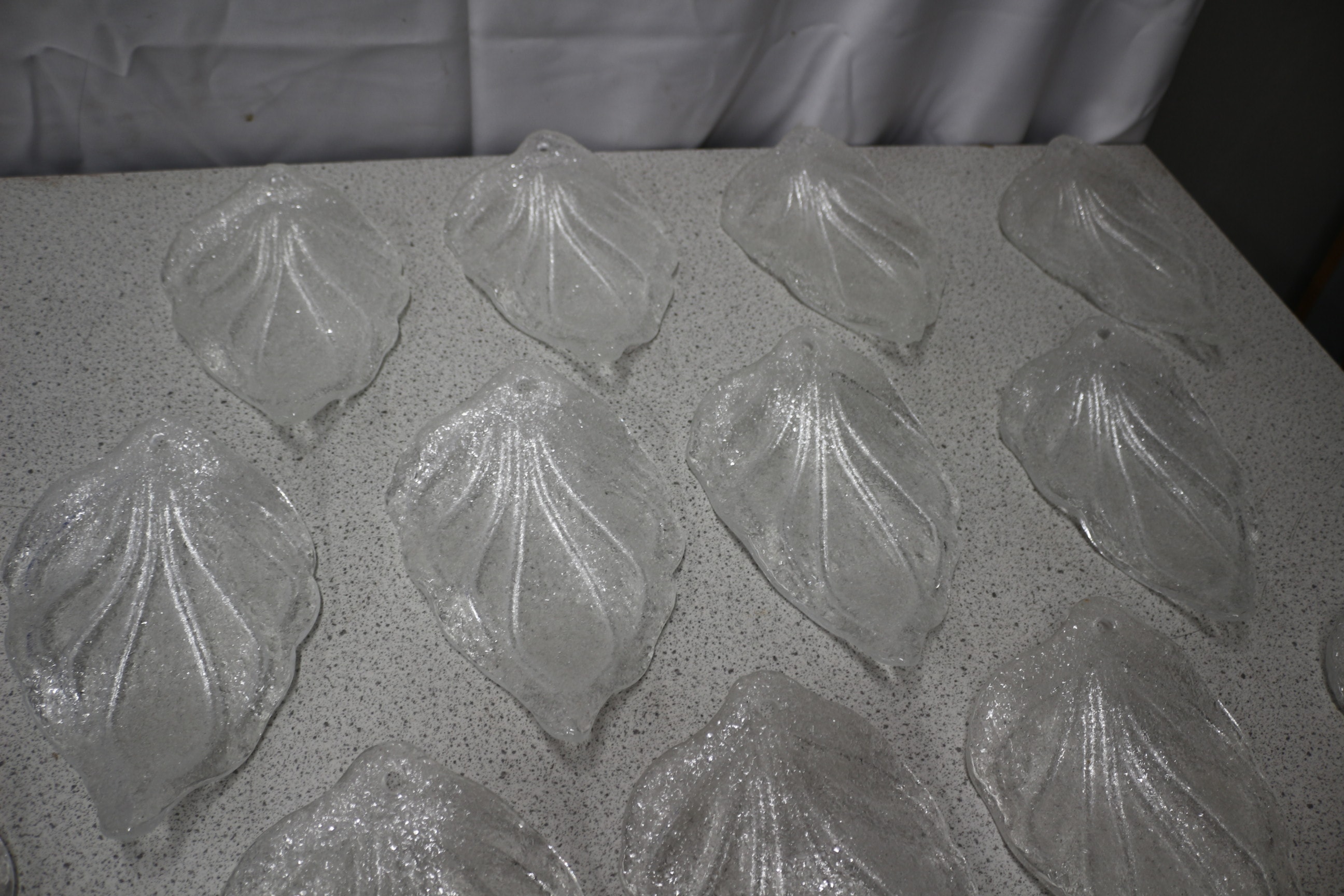 Approximately 26 clear, textured, leaf-shaped Murano glass pieces, each featuring a frosted or sparkling finish, with no visible labels or marks. 1 leaf AF, each leaf 23cm