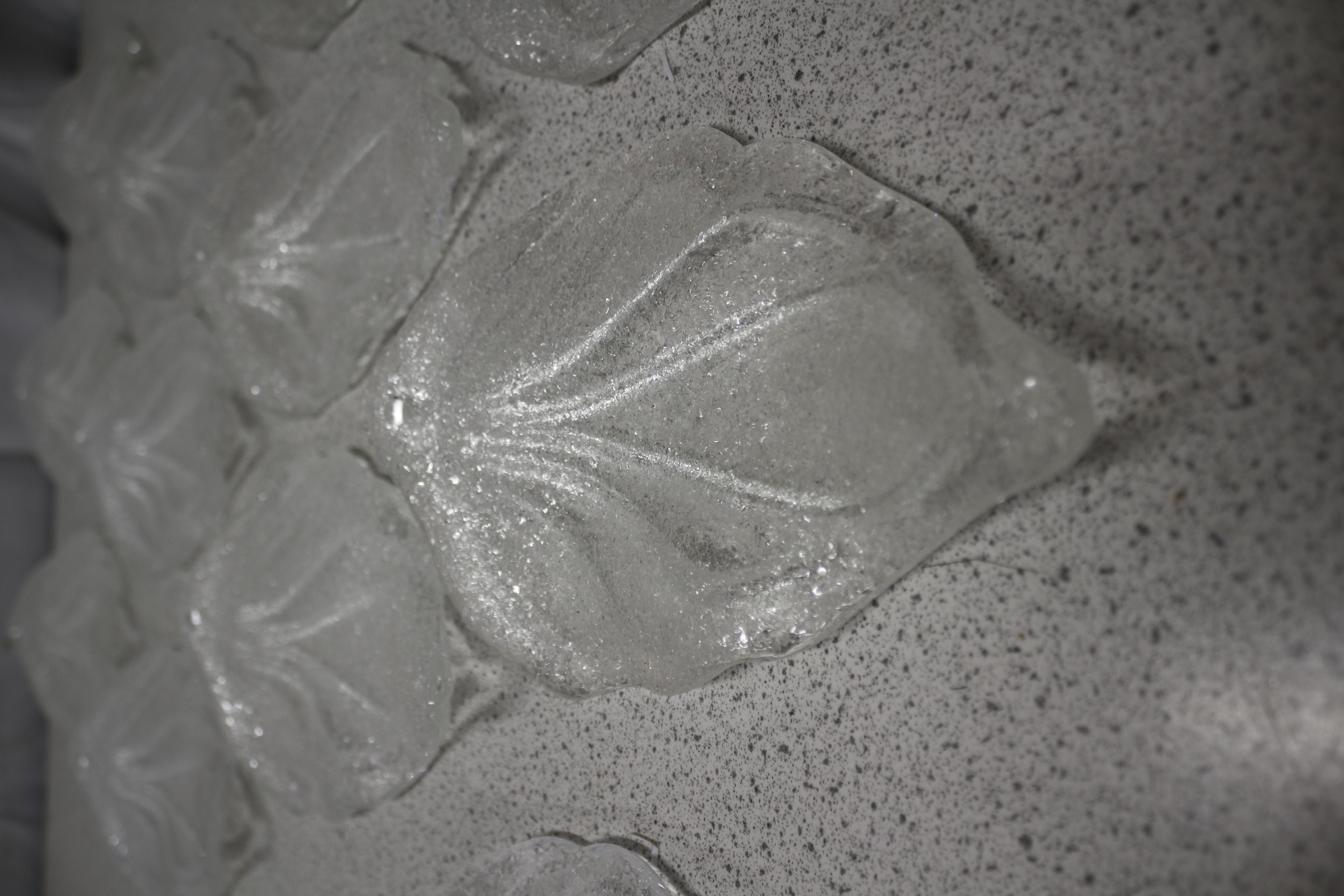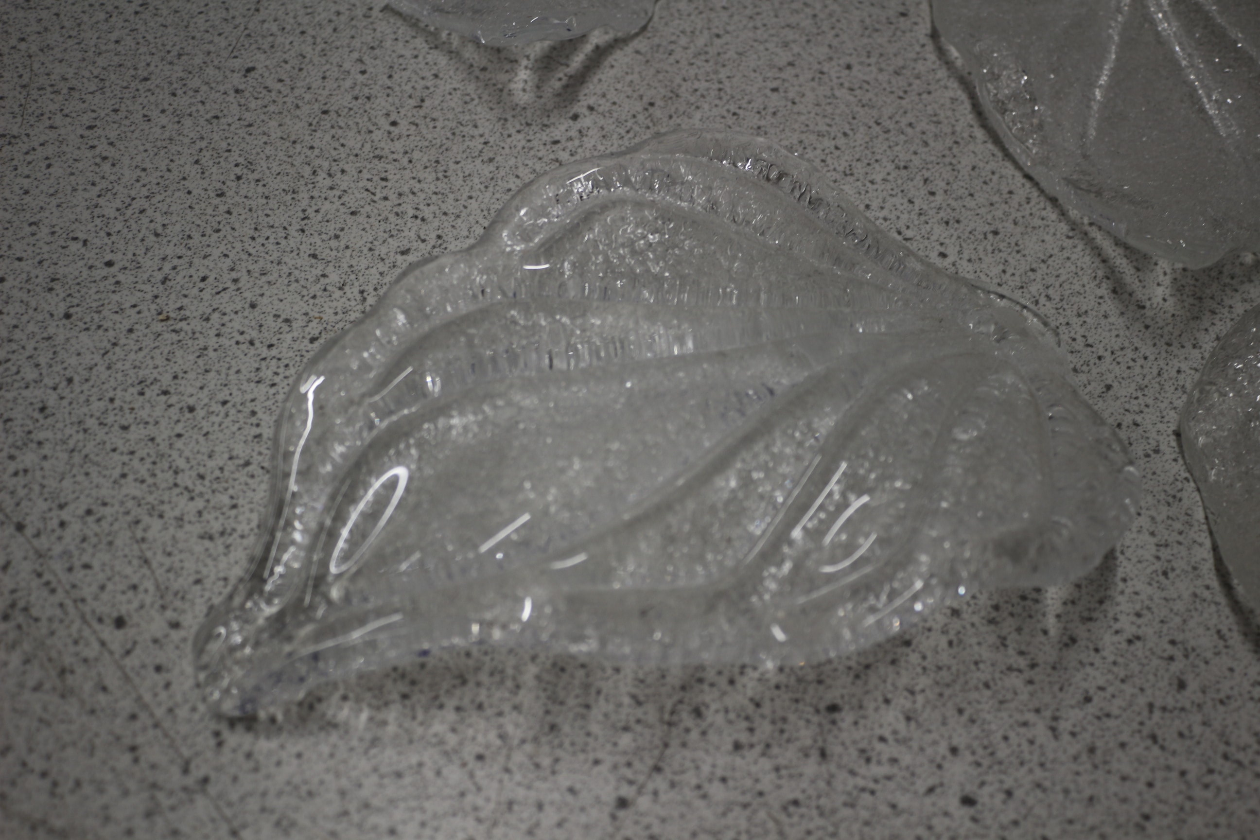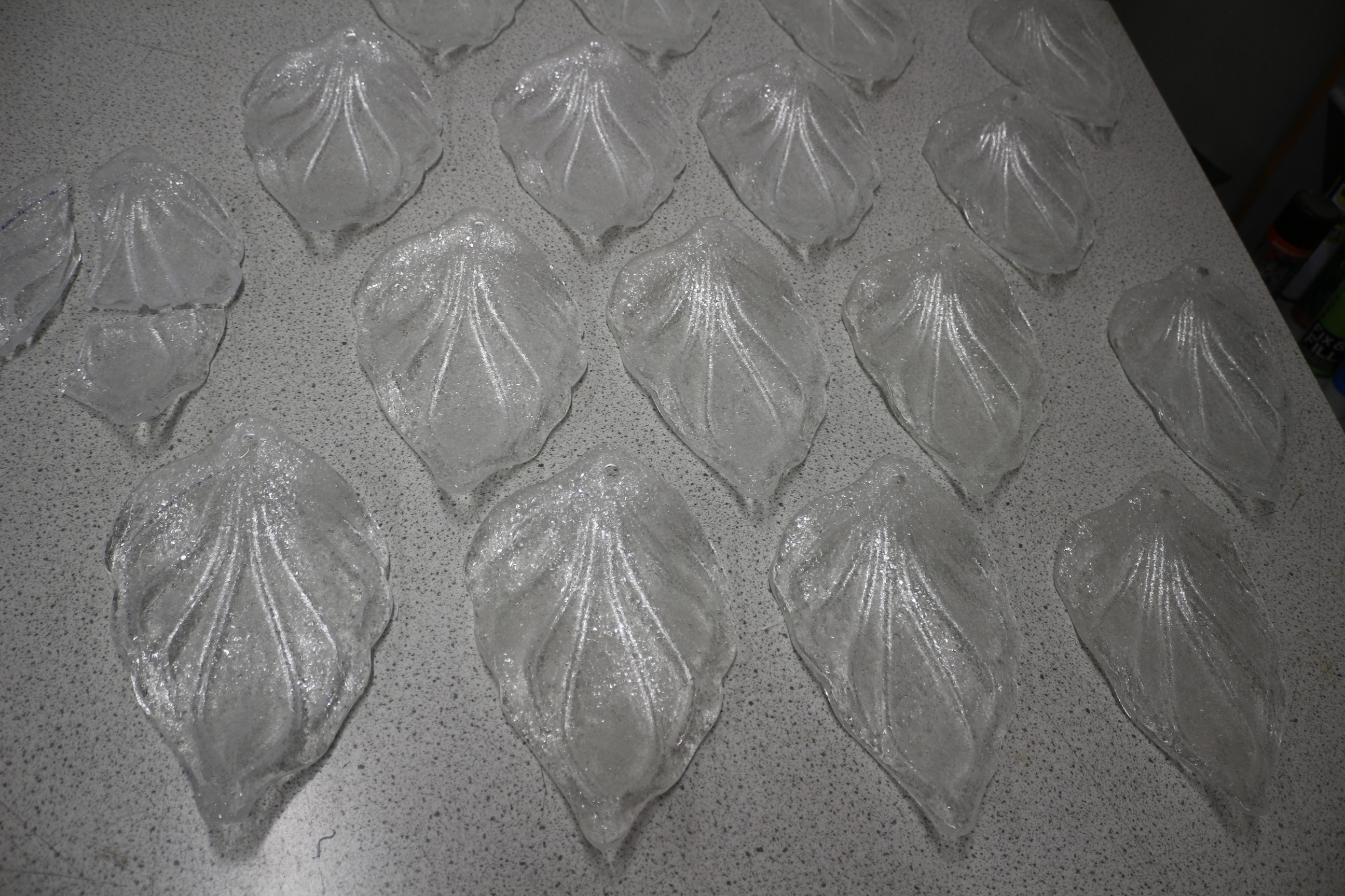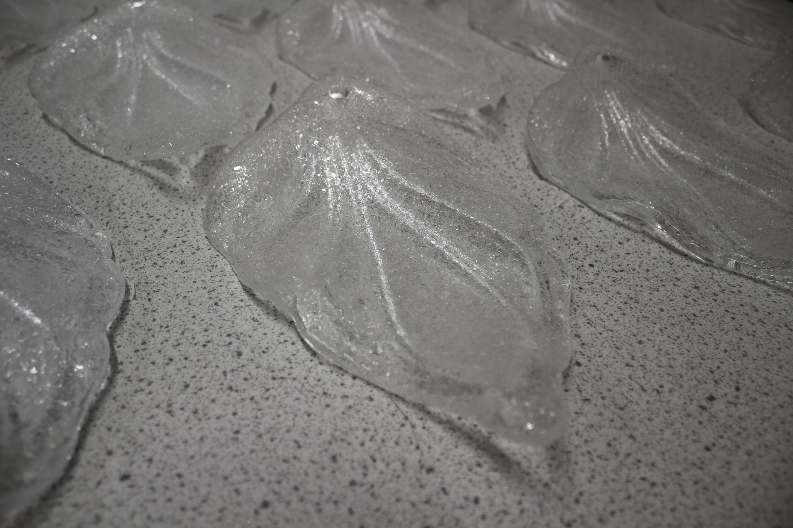 Approximately 26 clear, textured, leaf-shaped Murano glass pieces, each featuring a frosted or sparkling finish, with no visible labels or marks. 1 leaf AF, each leaf 23cm